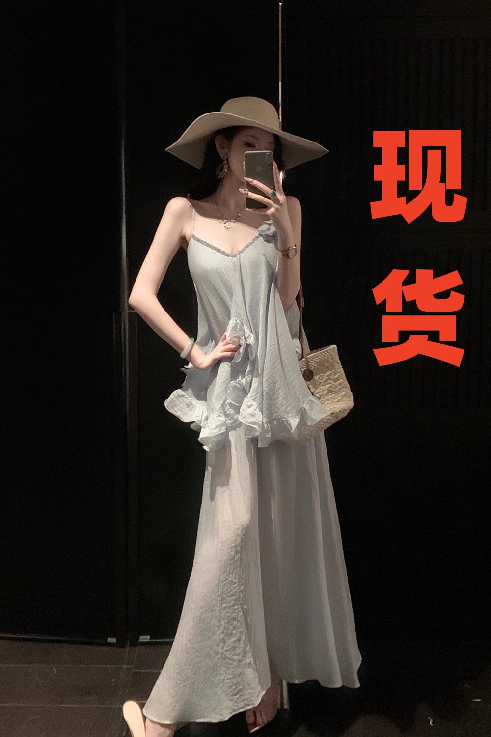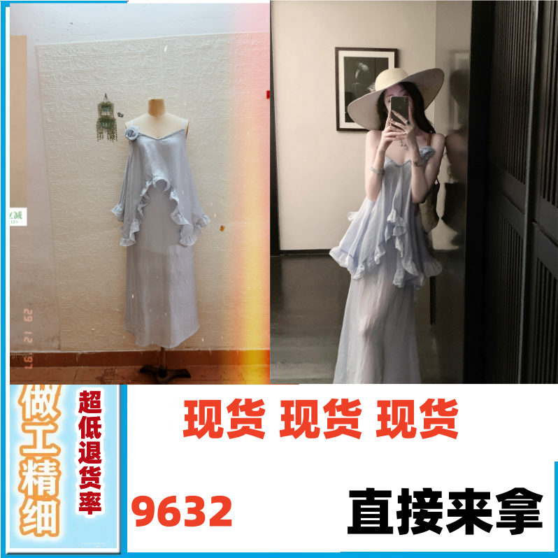 여름 파란색 작은 대중 불규칙 프릴 주간 실크 슬립 점프 슈트 롱 스커트