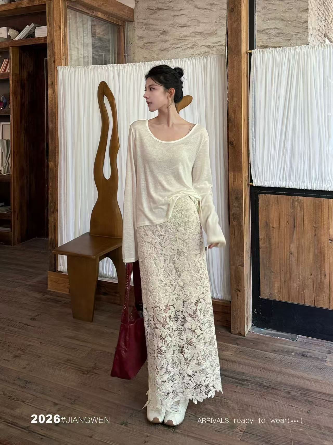 장 원자바오 배 꽃이 떨어지는 미니멀리즘 다용도 뒤로 비틀림 십자가 니트 단색 라운드 넥 긴팔 맨위 여성 고급 센스