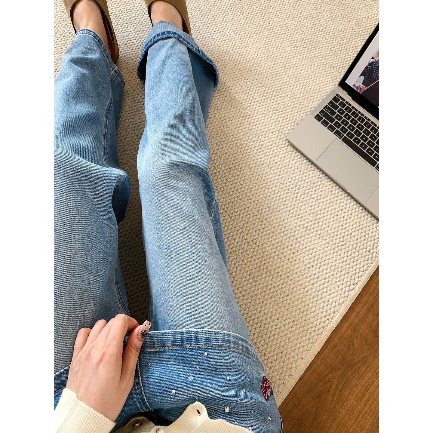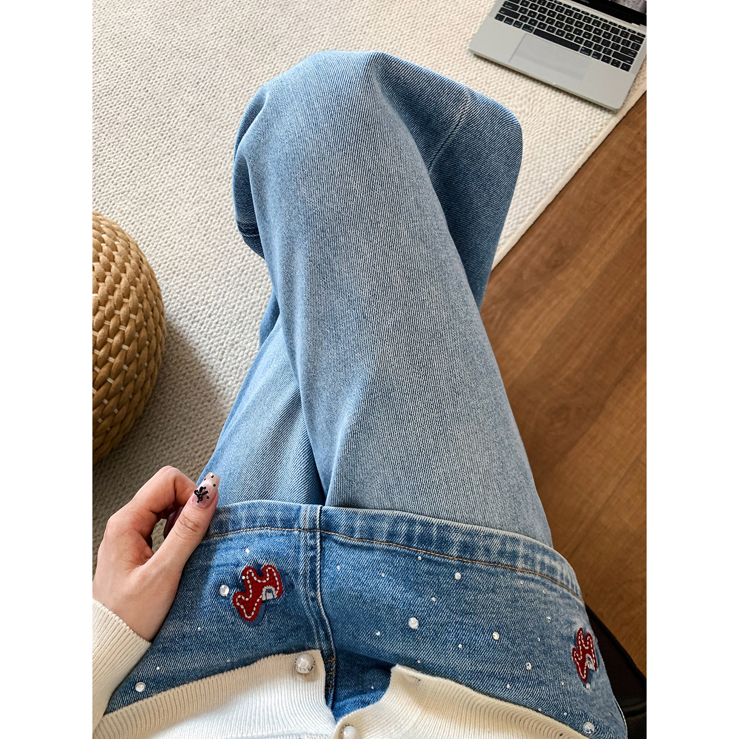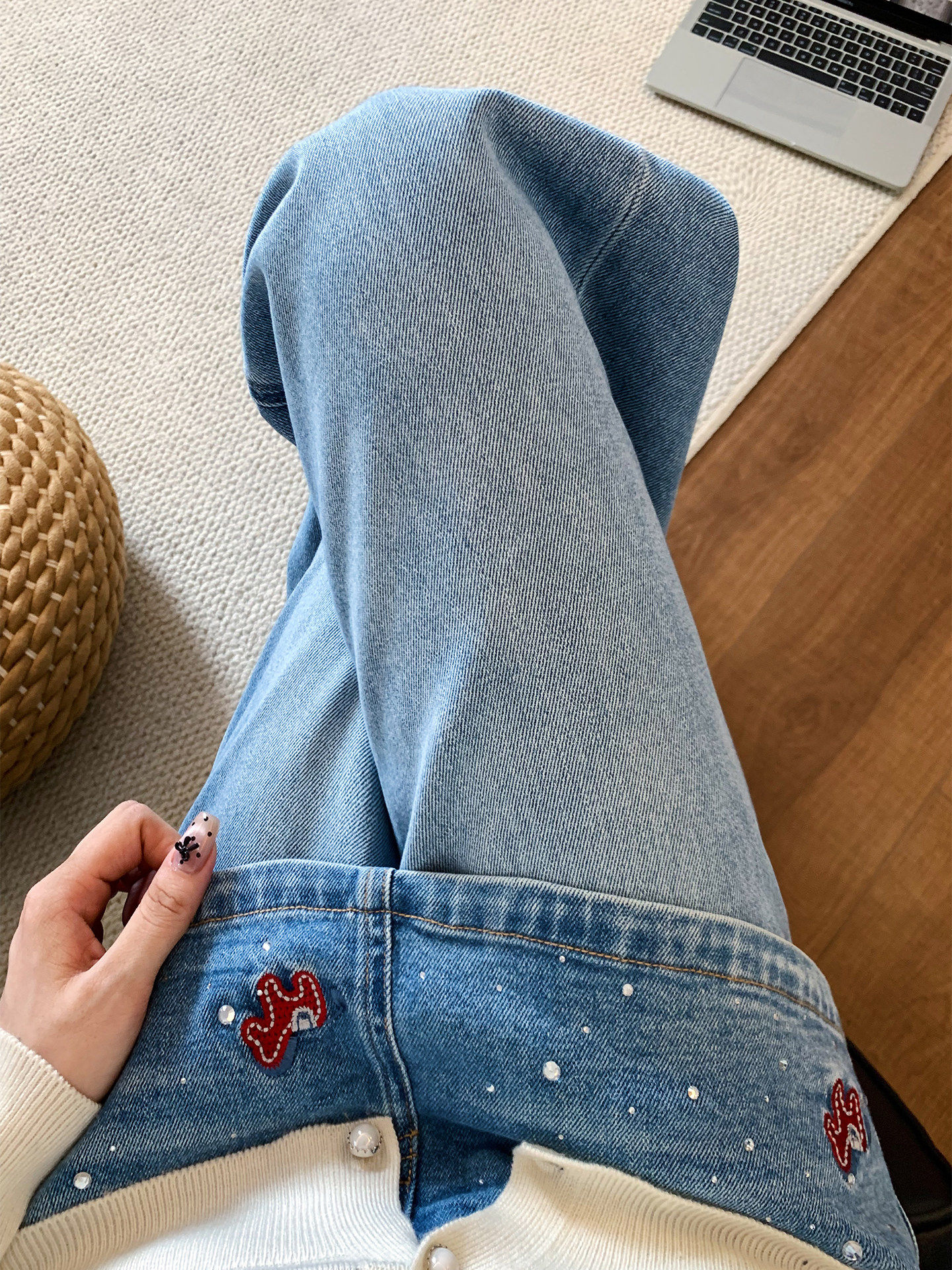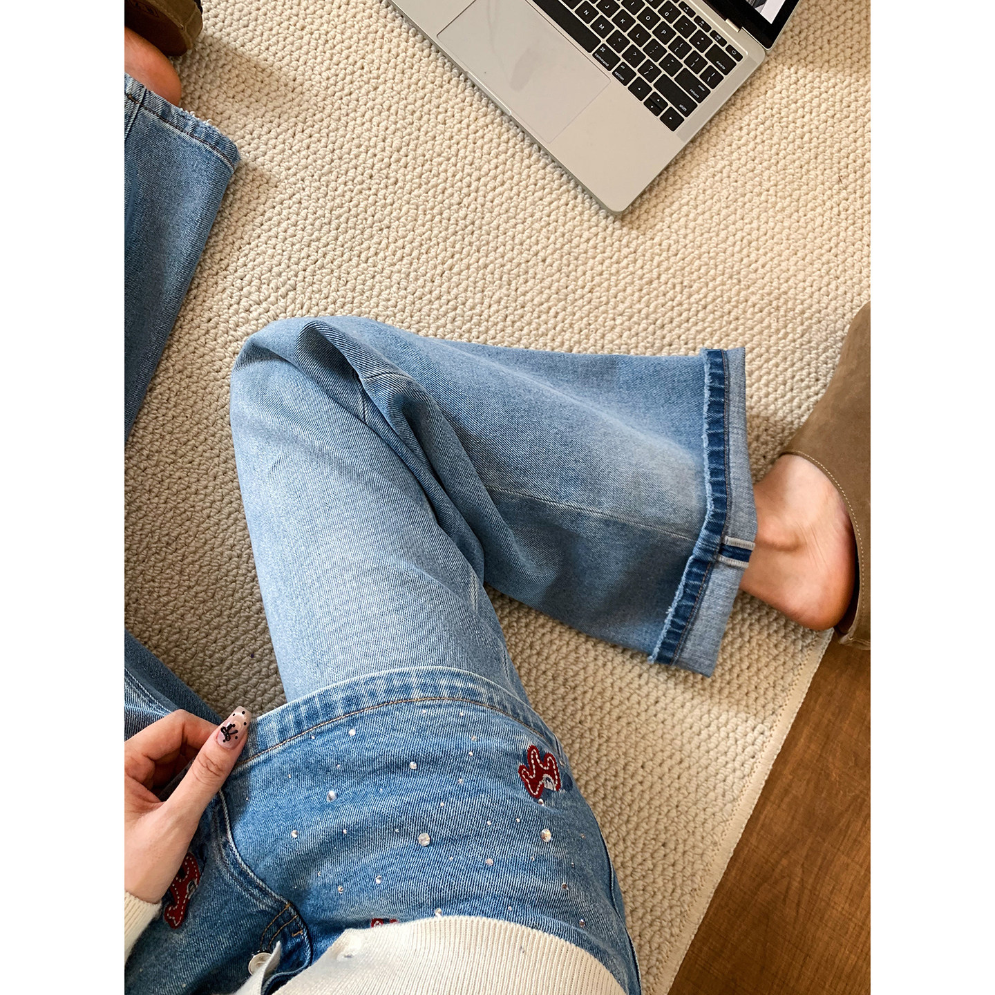 아메리칸 귀여운 작은 곰 펜던트 자수 청바지 여성 봄 가을 새로운 작은 대중 단추 디자인 센스 넓은 다리 길이 바지