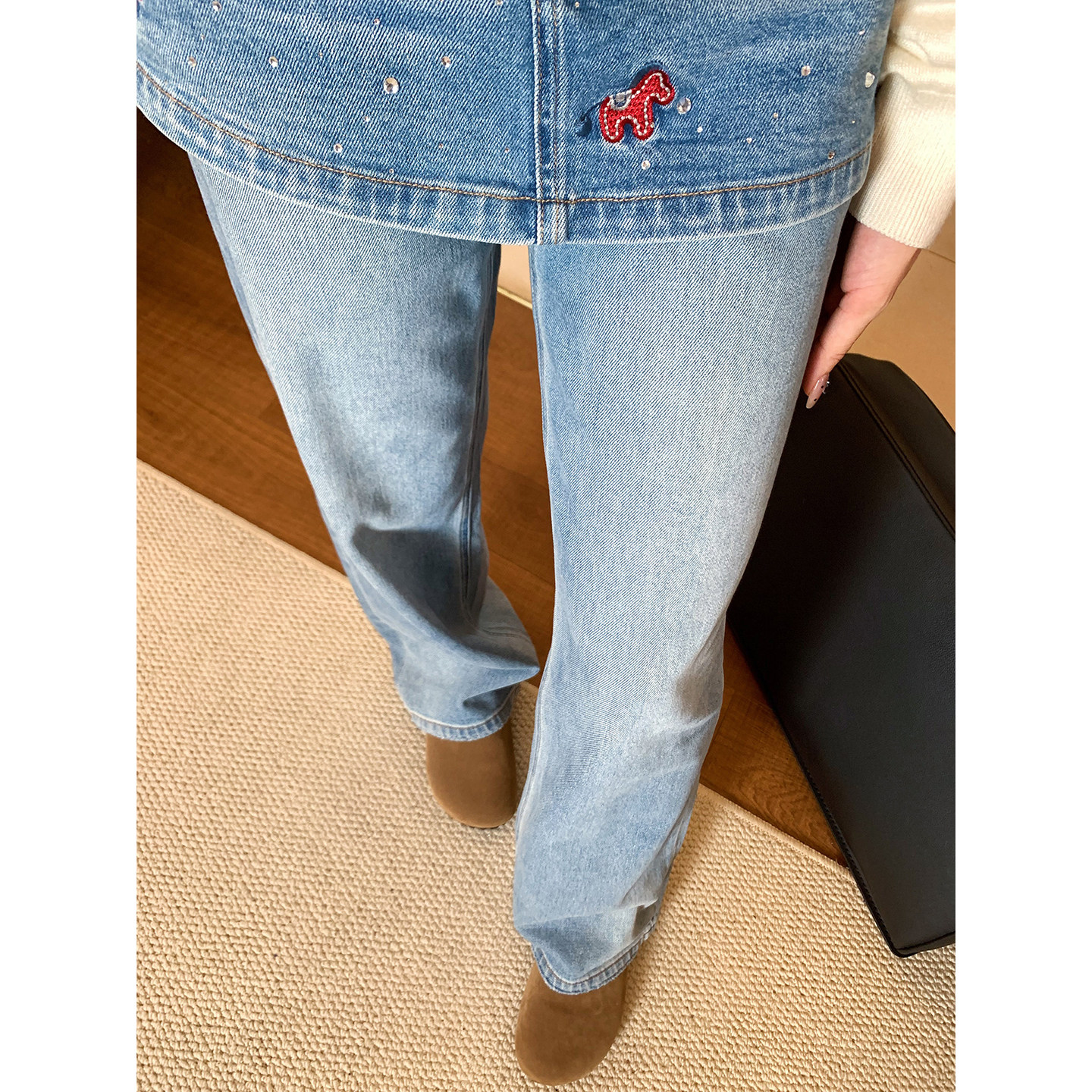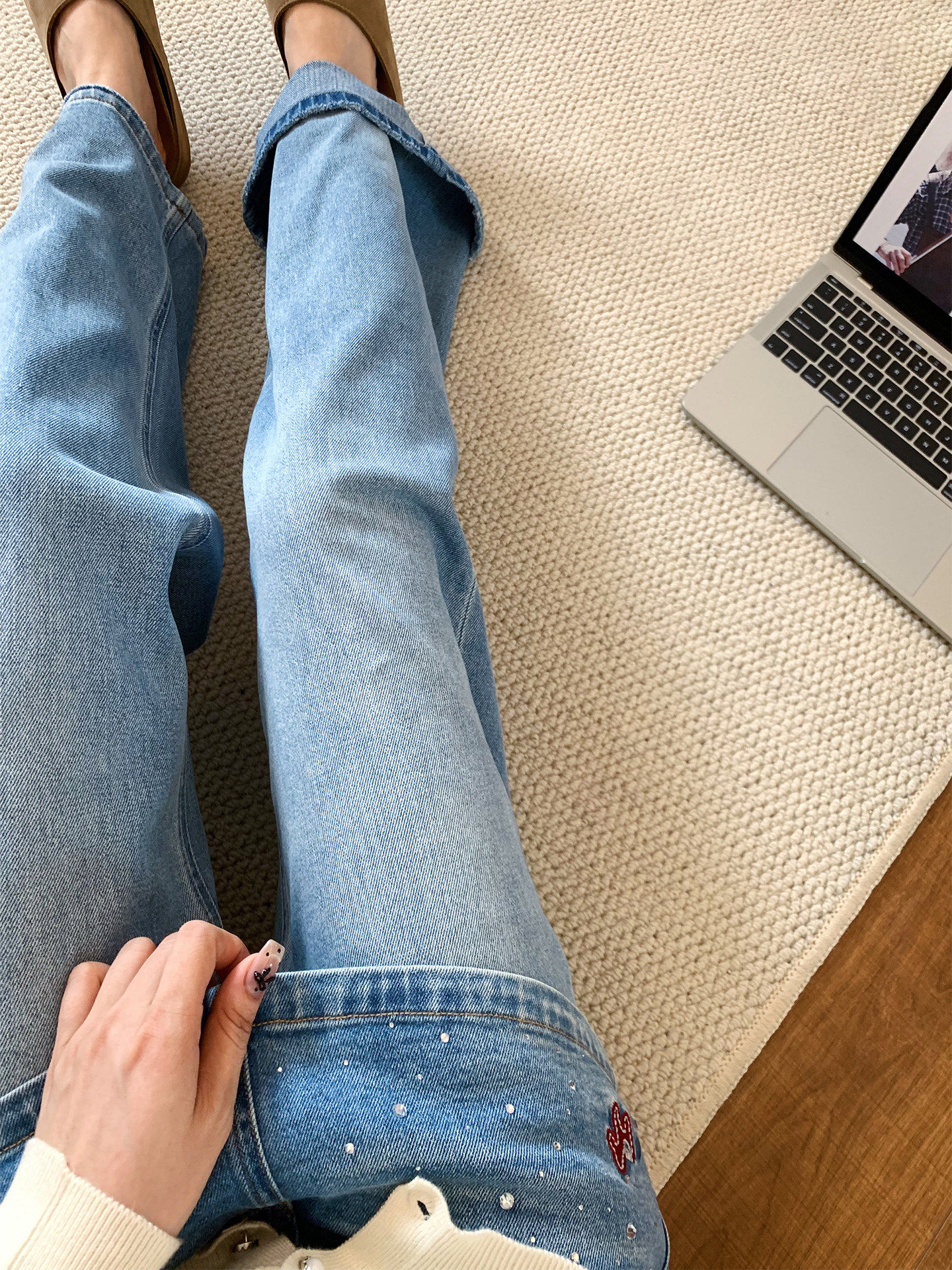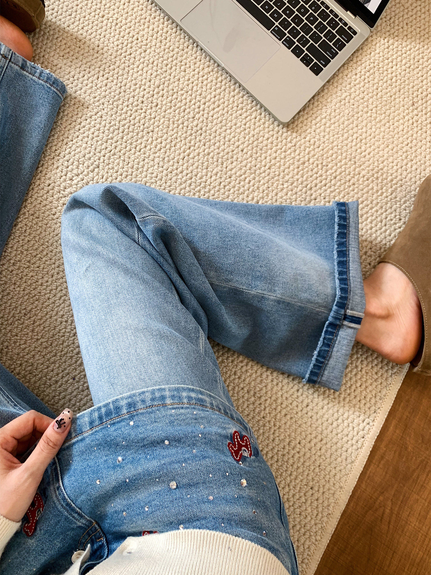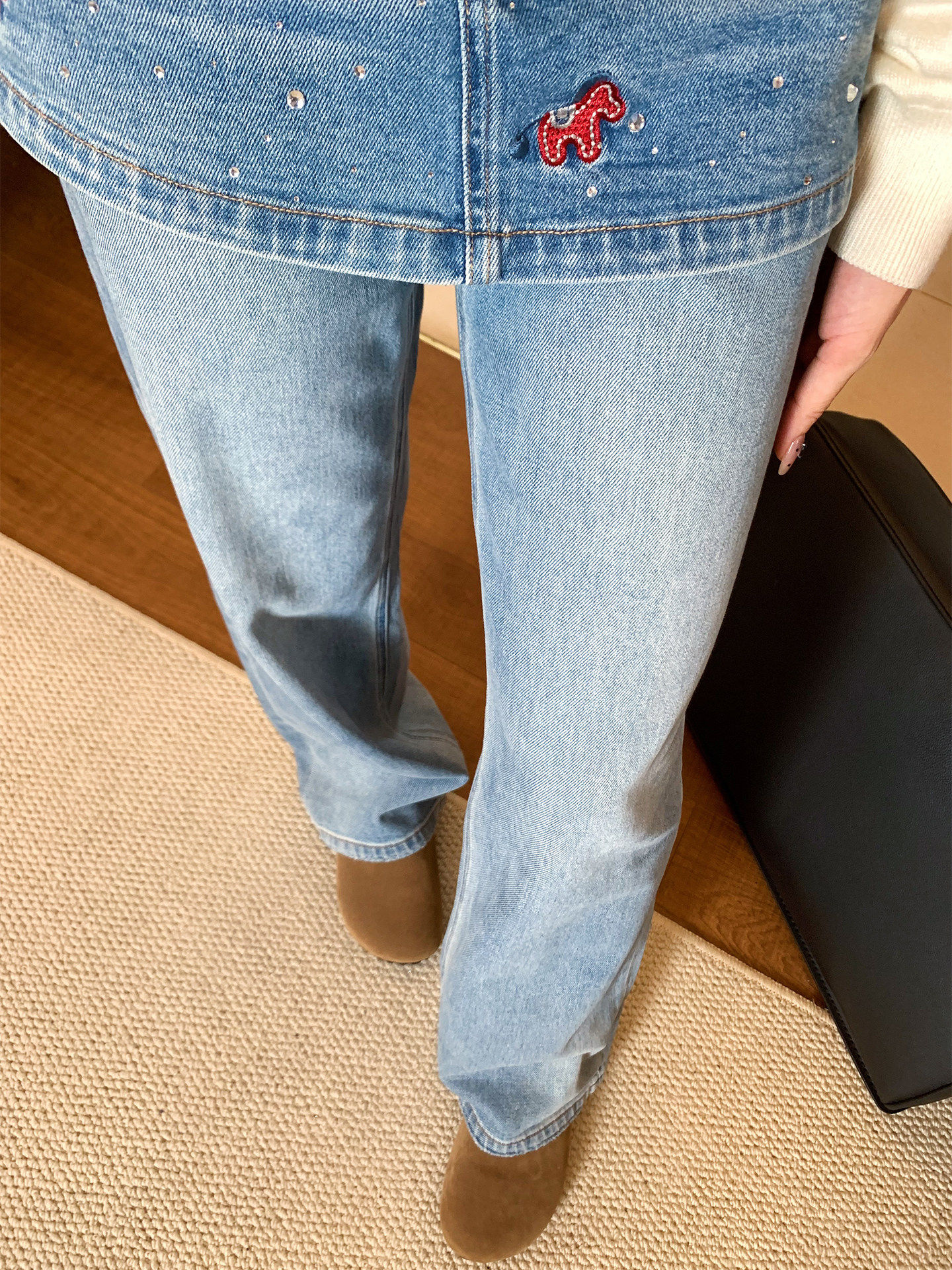 아메리칸 귀여운 작은 곰 펜던트 자수 청바지 여성 봄 가을 새로운 작은 대중 단추 디자인 센스 넓은 다리 길이 바지