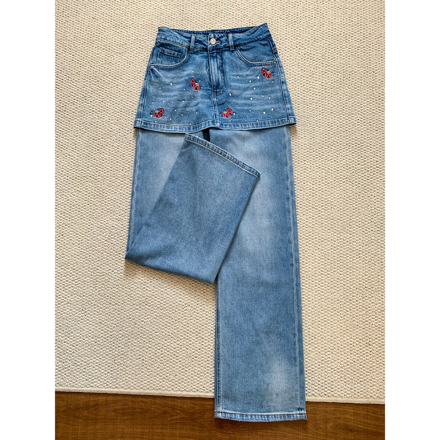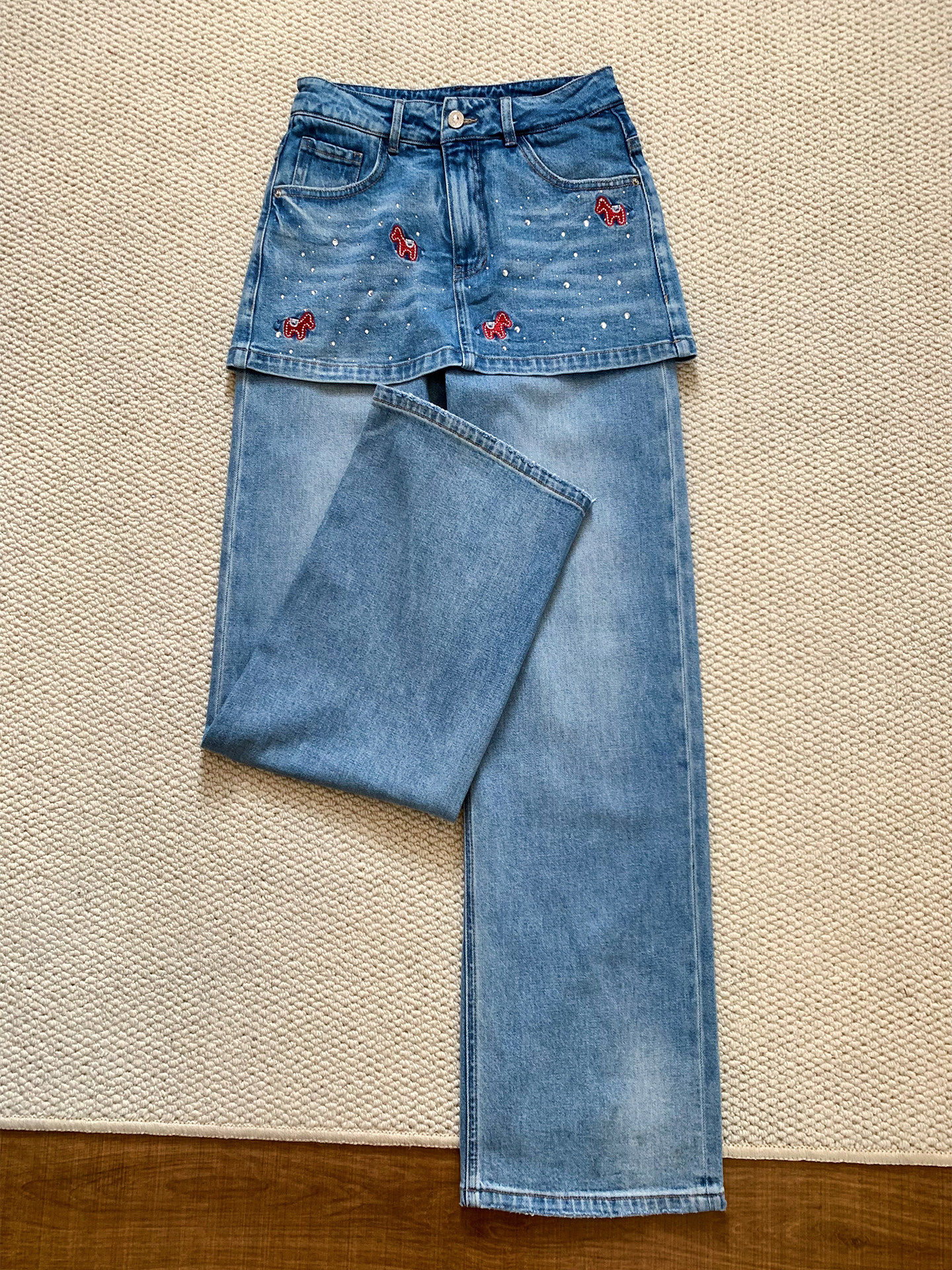 페이크 레이어드 넓은 다리 데님 치마바지 여성 여름 무거운 작업 작은 말 자수 핫픽스 하이웨이스트 다용도 마 오래된 바닥 청소 긴 바지