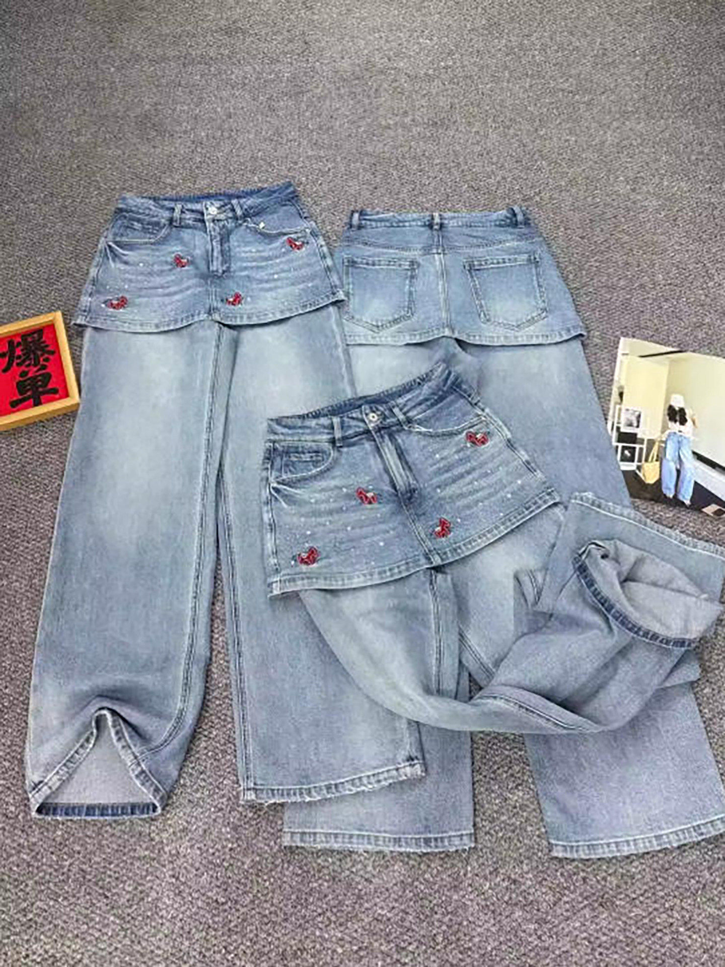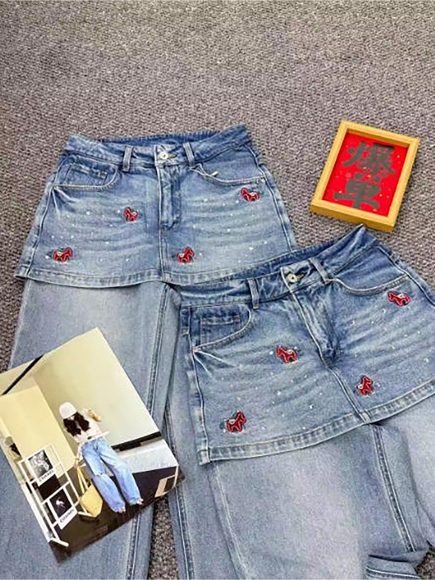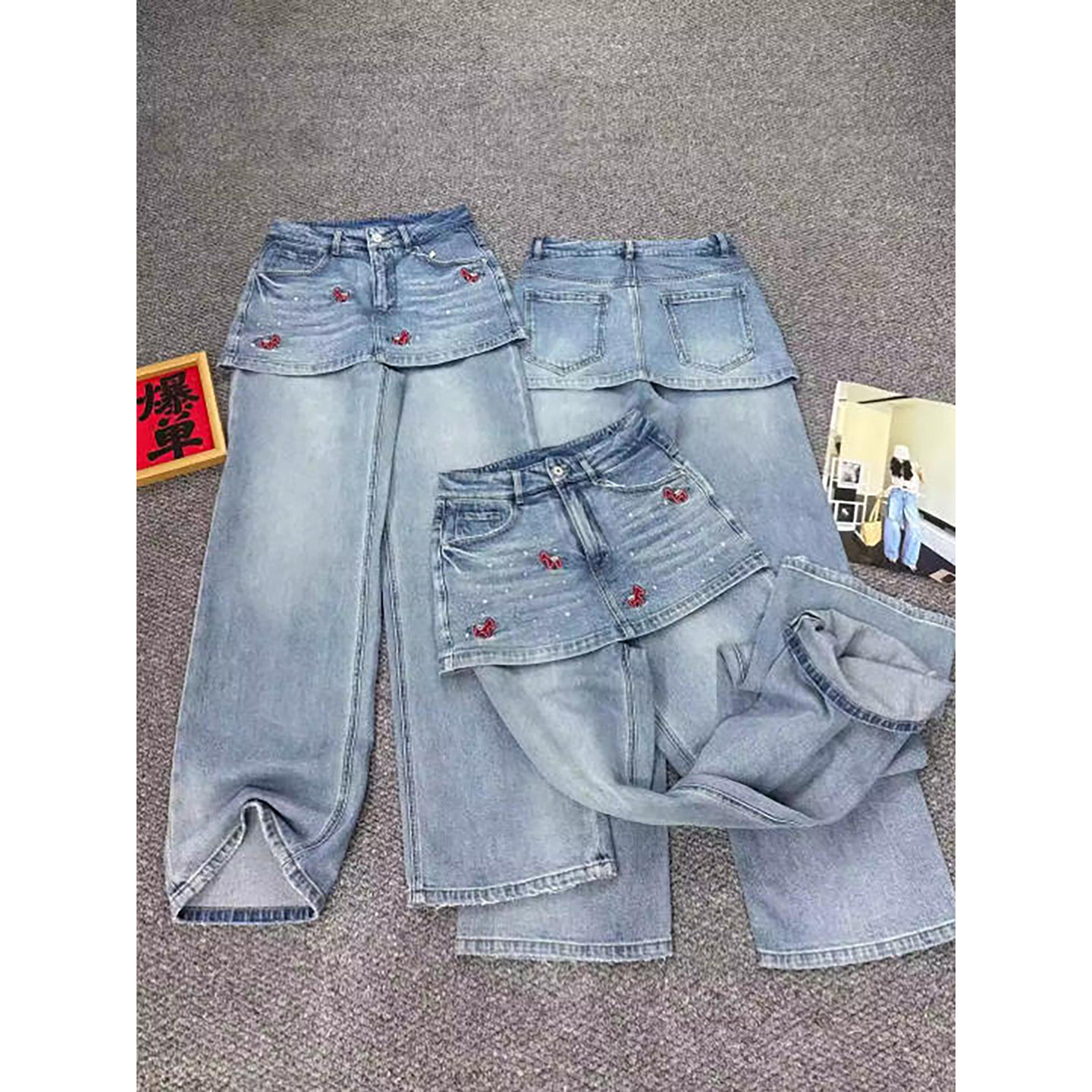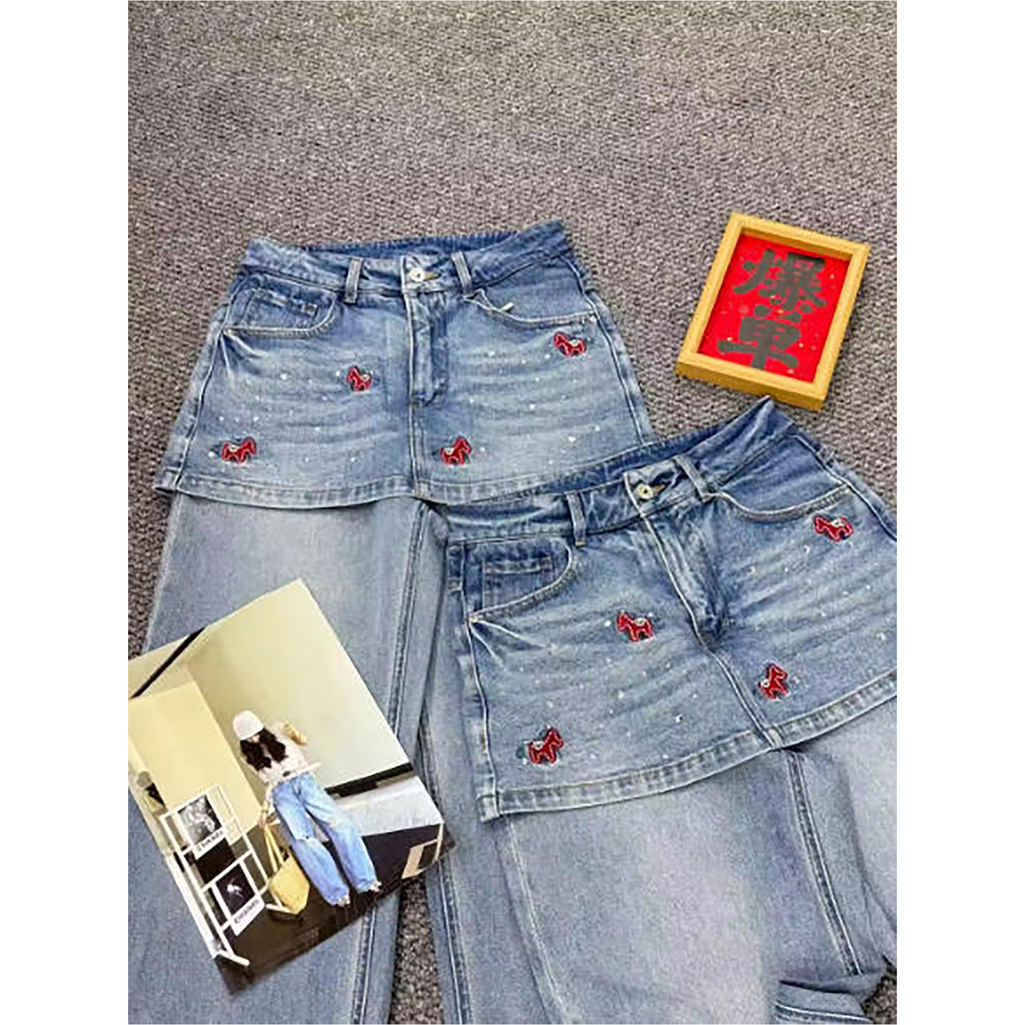 파란색 작은 말 자수 무거운 작업 핫픽스 청바지 여성 봄 디자인 센스 하이웨이스트 다용도 페이크 레이어드 넓은 다리 길이 바지