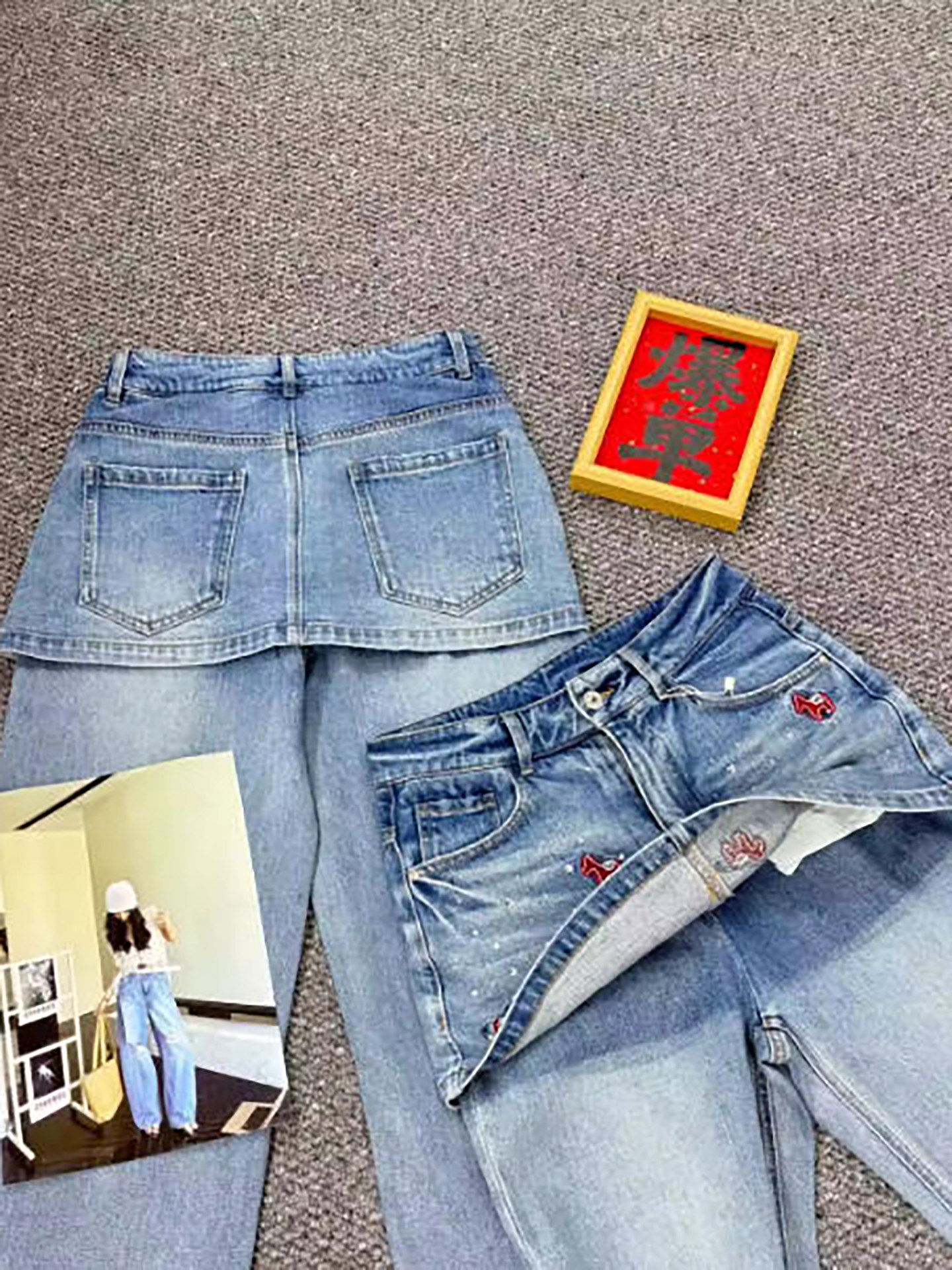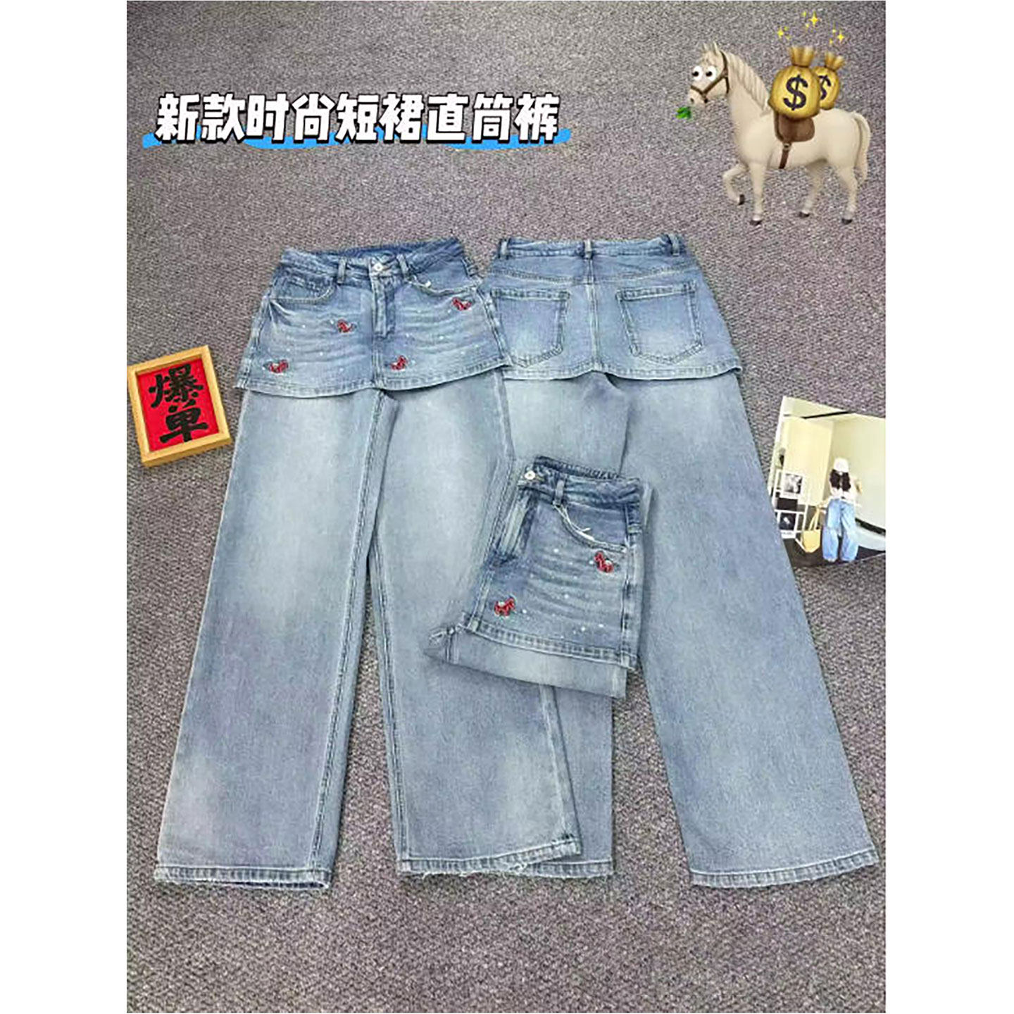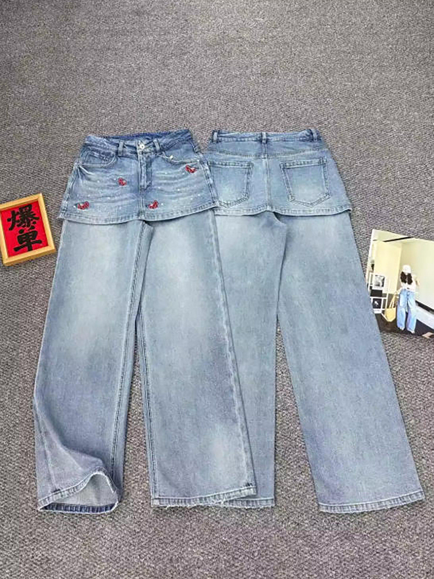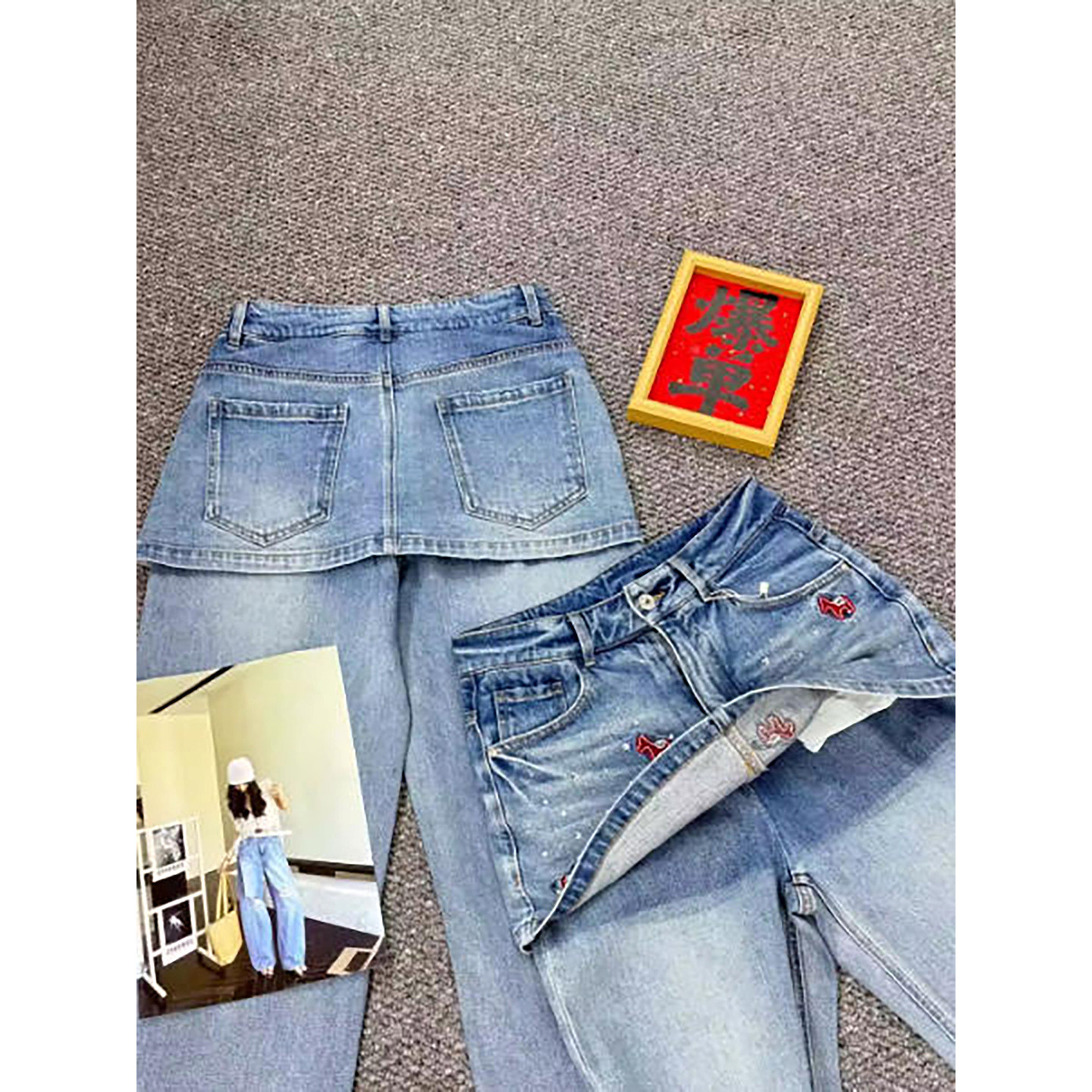 파란색 작은 말 자수 무거운 작업 핫픽스 청바지 여성 봄 디자인 센스 하이웨이스트 다용도 페이크 레이어드 넓은 다리 길이 바지