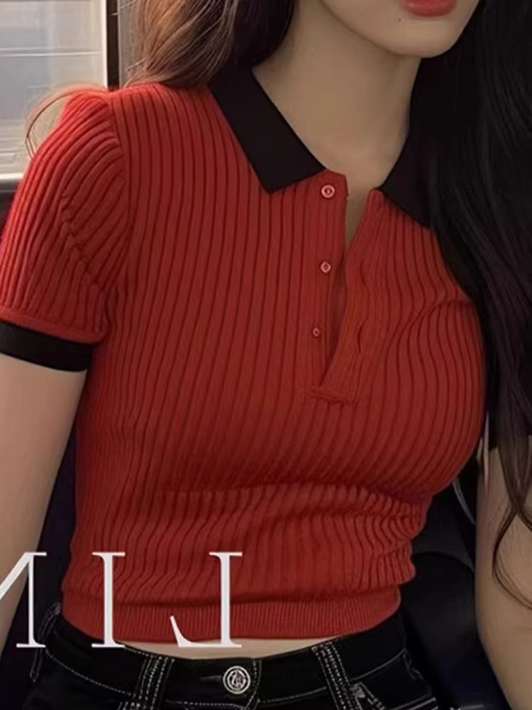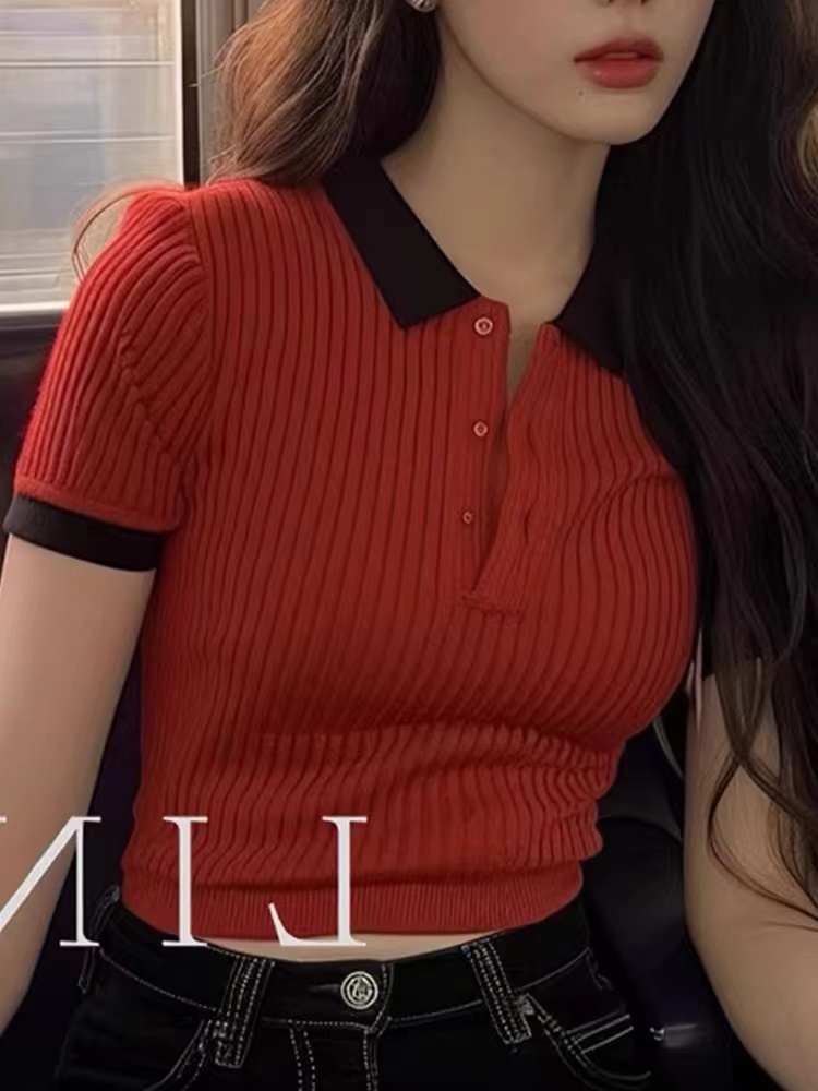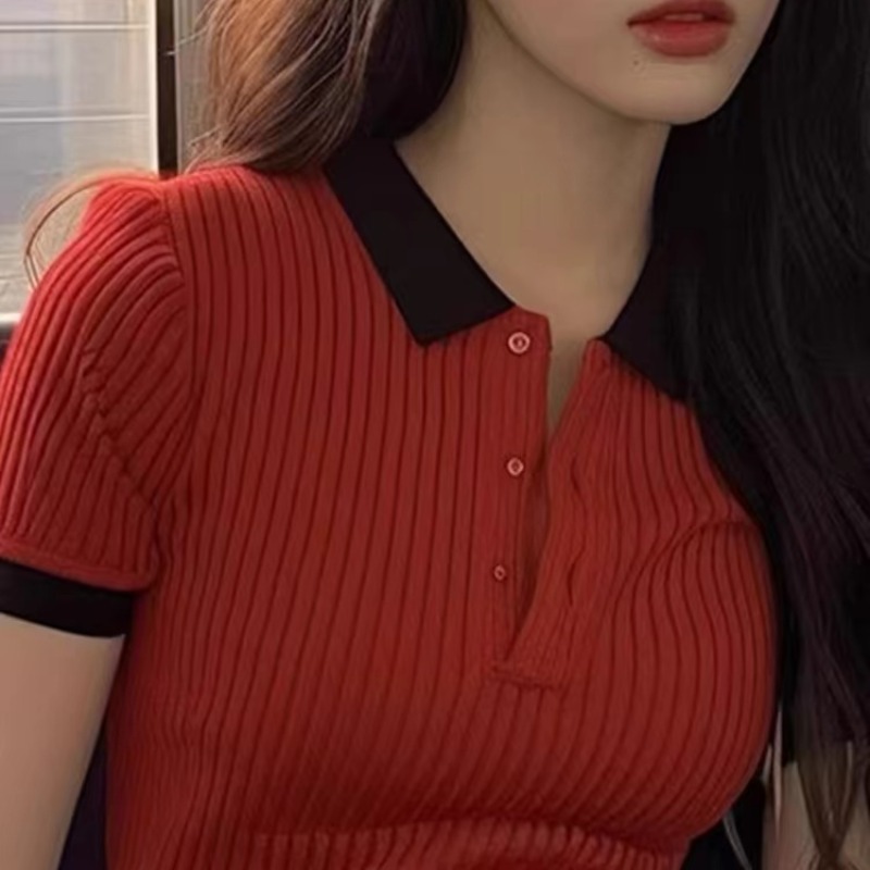 올해 인기 ~ 중 아름다운 작은 셔츠 빨간색 POLO 칼라 얼음 실크 니트 스웨터 타이트 반팔 티셔츠 맨위 여성 여름