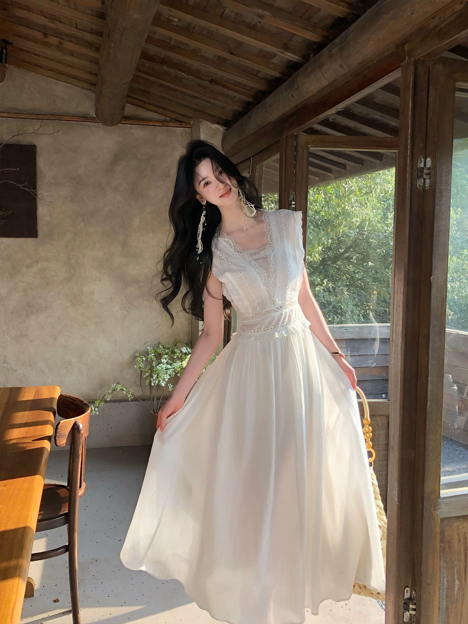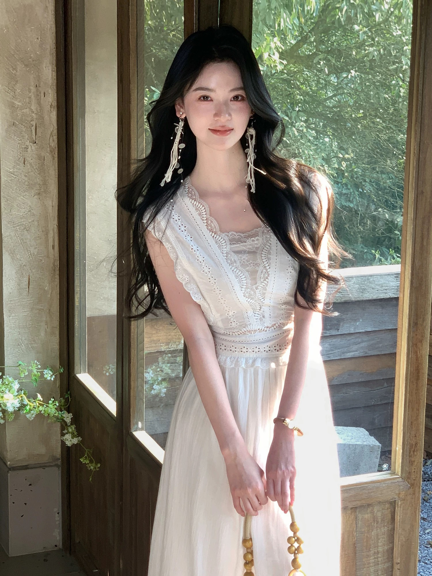 하나부터 순간 시리아 여름 무거운 작업 자수 레이스 홀로우 아웃 면 소재 레이스 드레스 부드러운 분위기 센스 롱 스커트