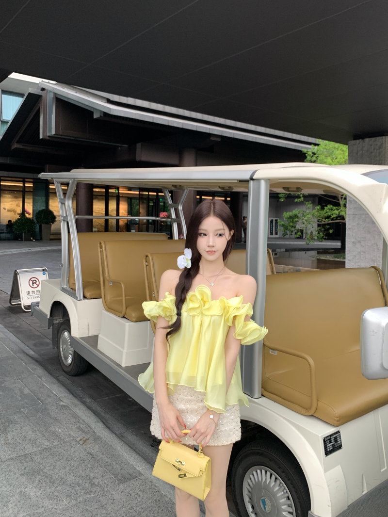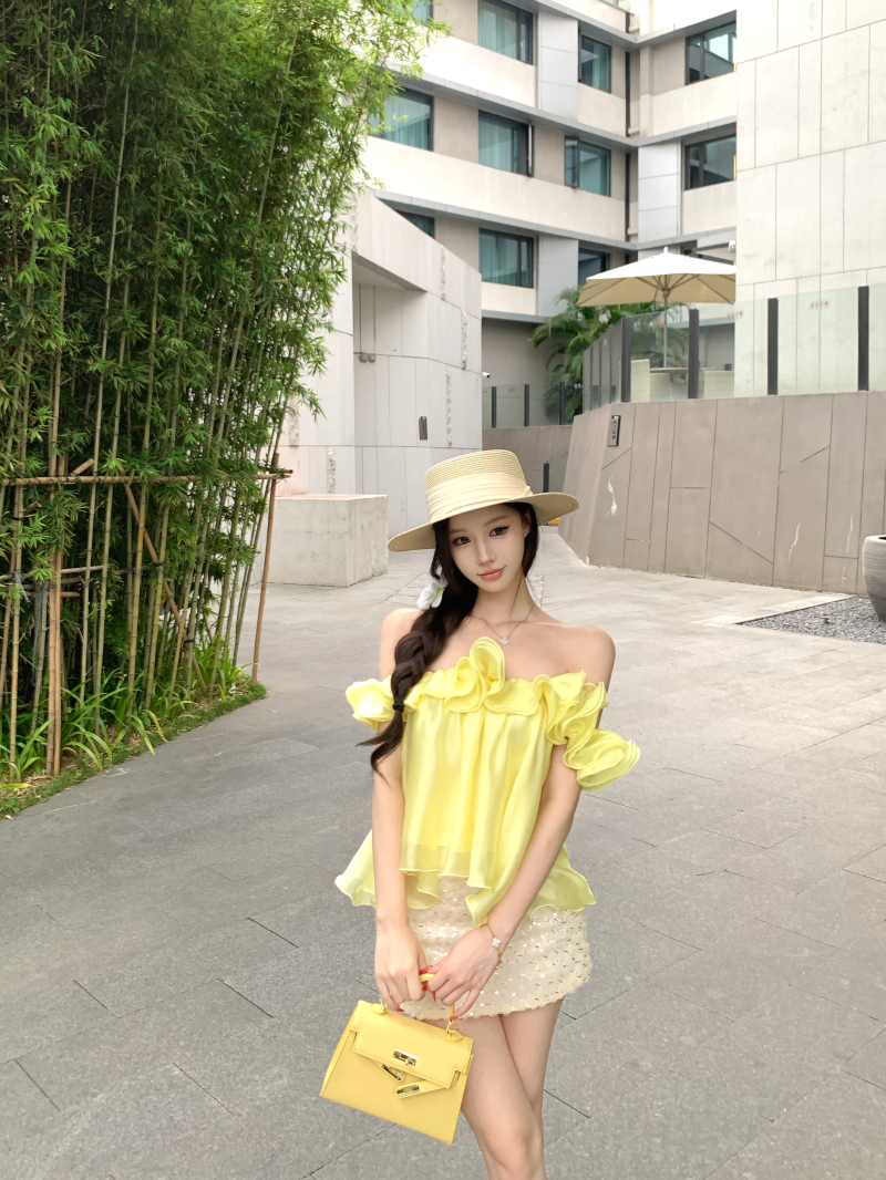 실사 정가 여름 편지 프릴 시폰 셔츠 여성 봄 미니멀리즘 루즈핏 슬림해 보이는 오프숄더 맨위