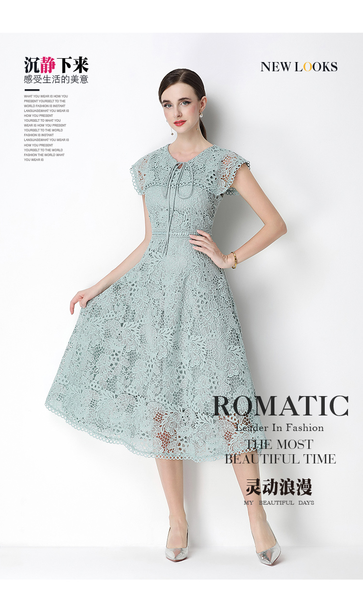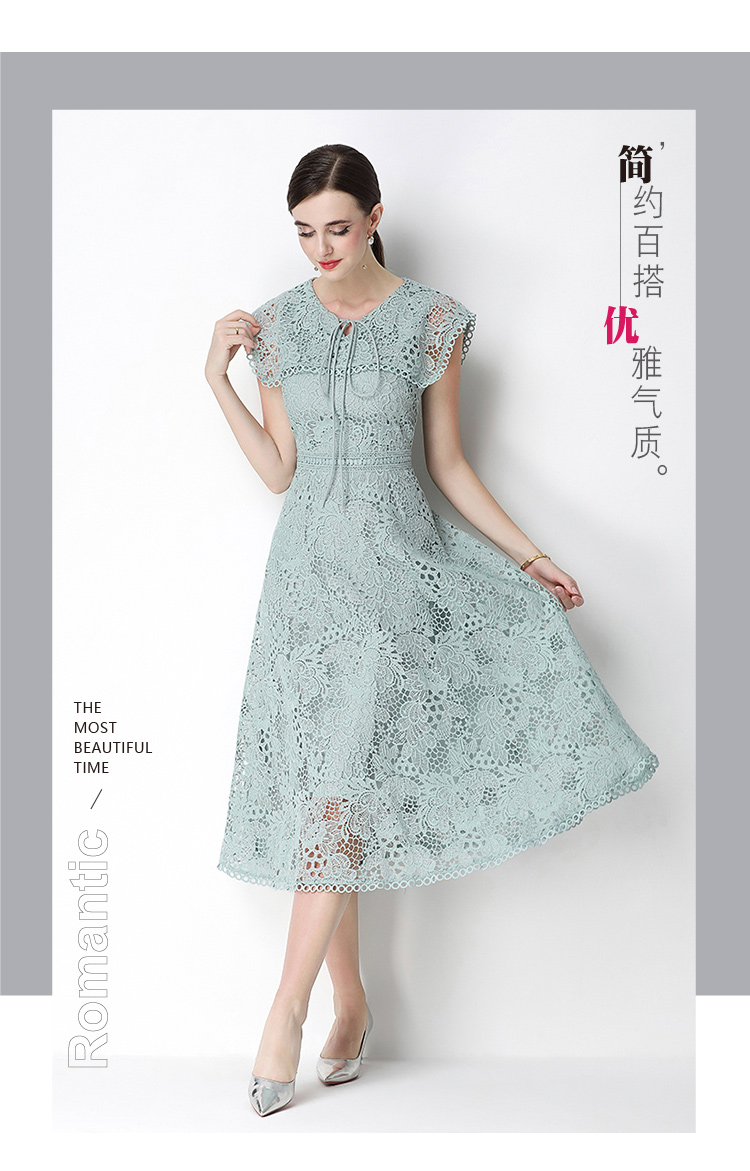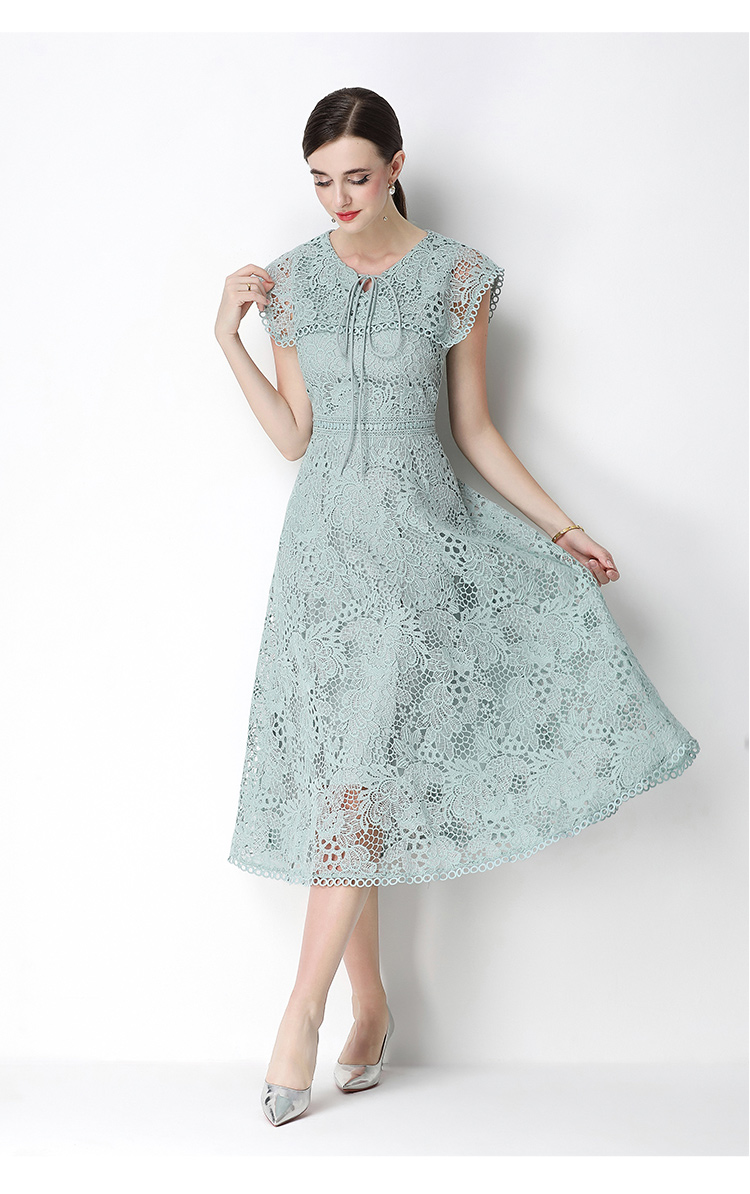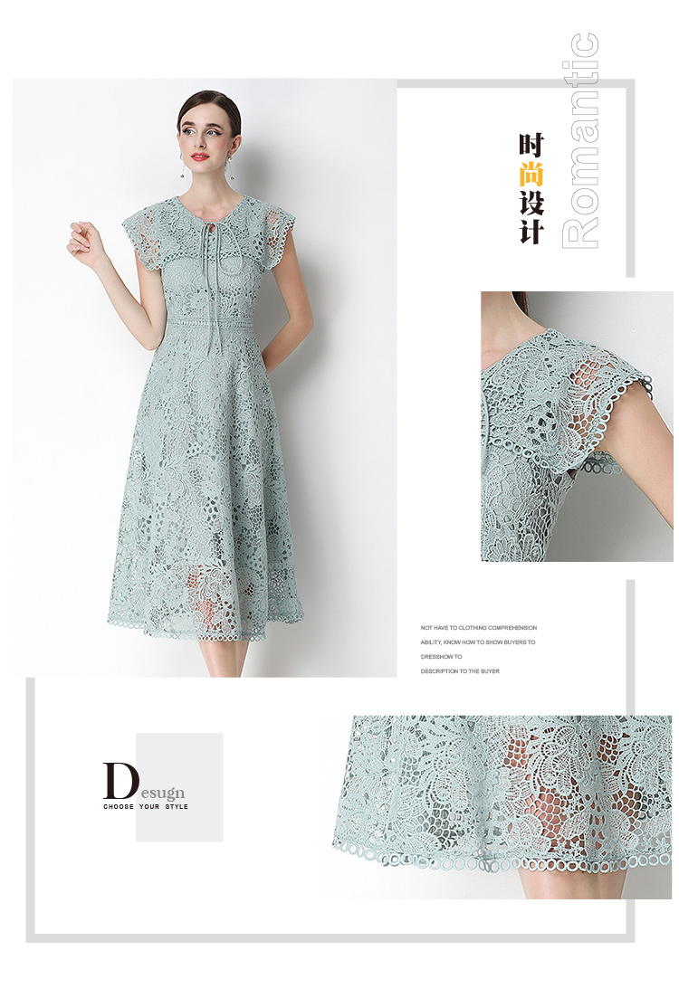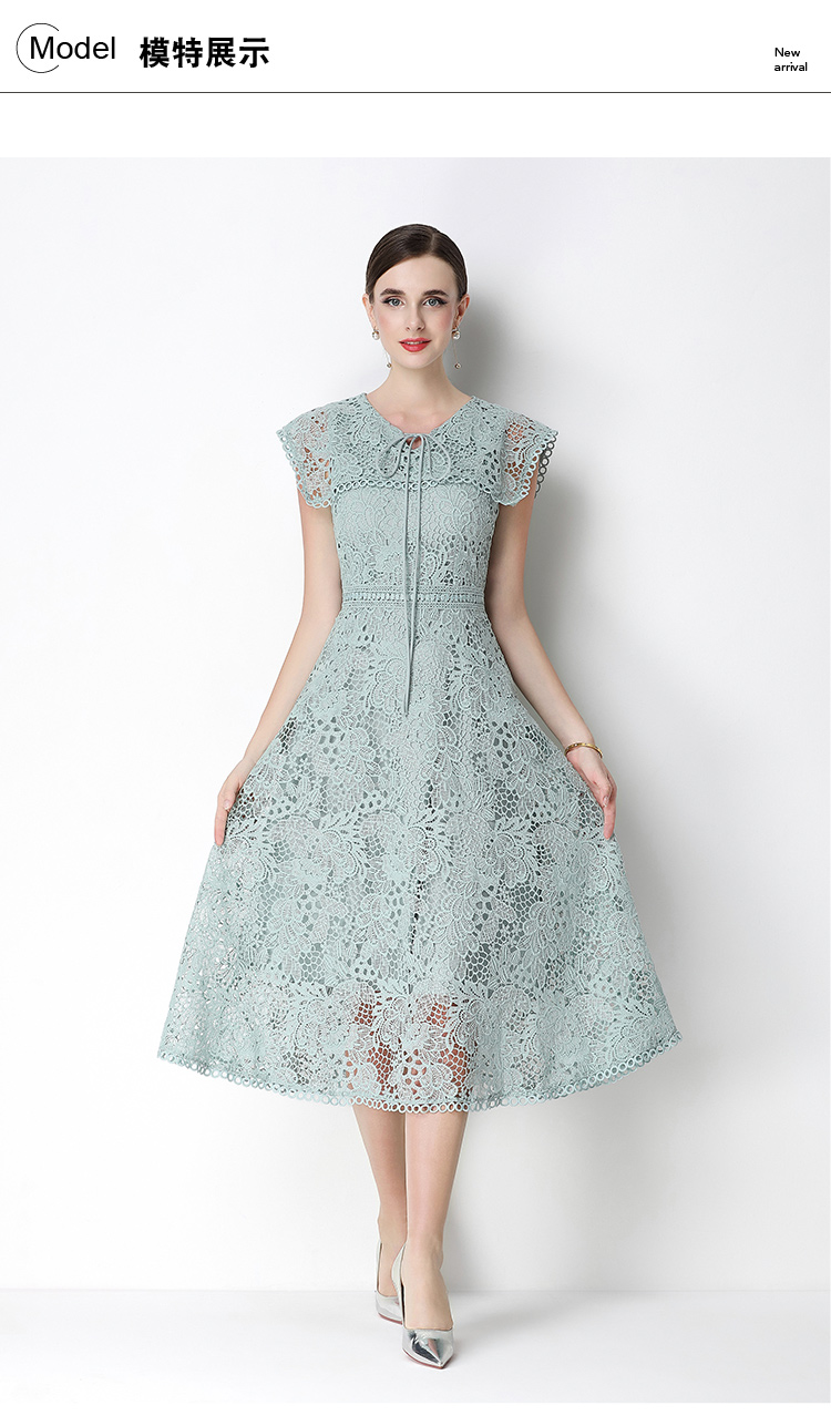 실사 반팔 슬림해 보이는 홀로우 아웃 물 용해 레이스 포지셔닝 중간 길이 드레스