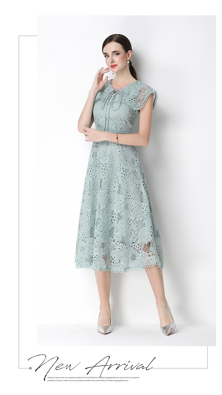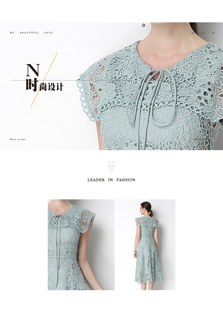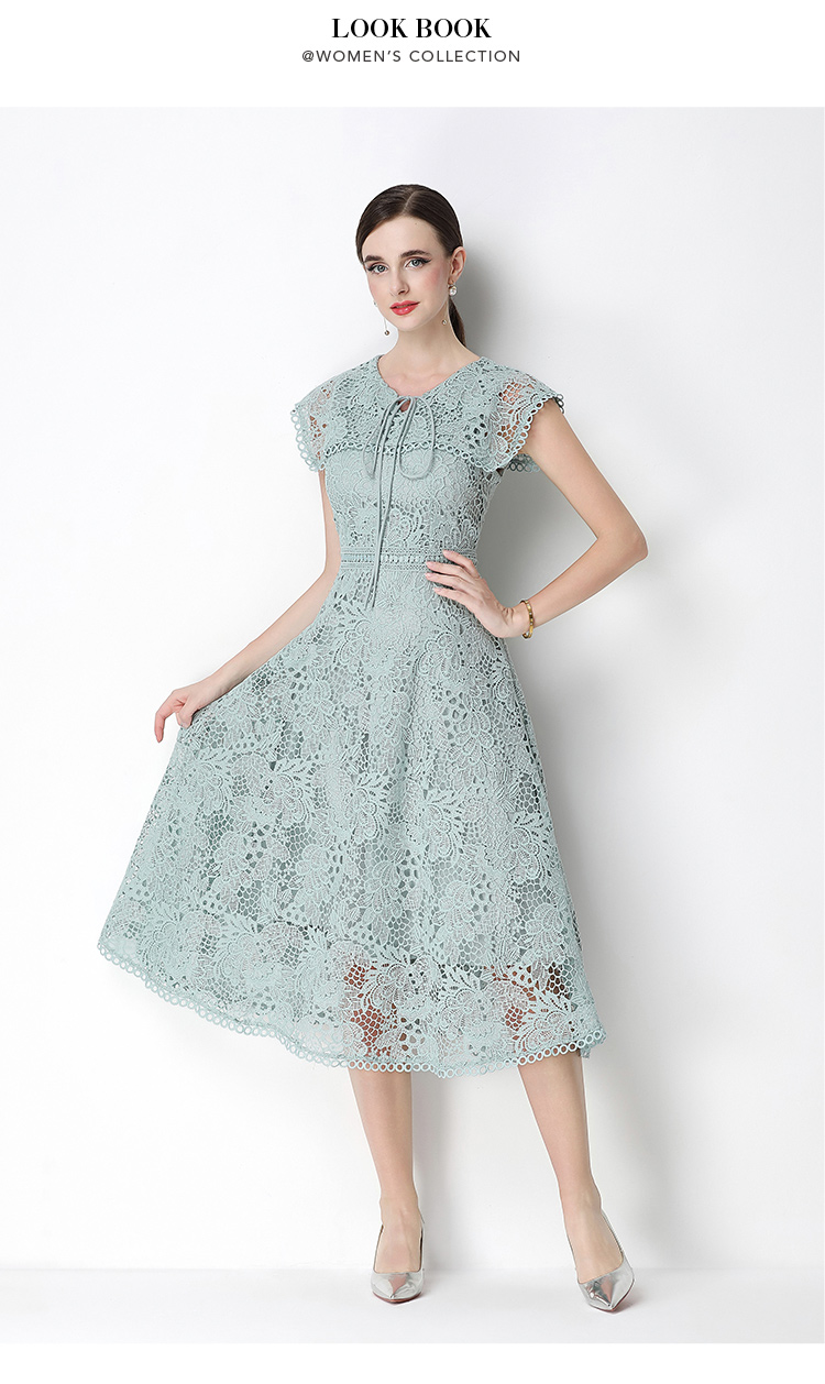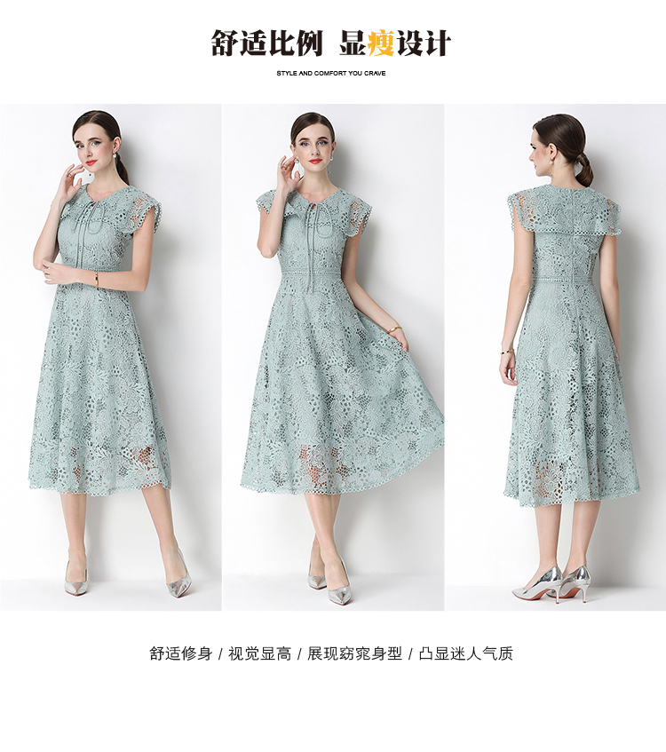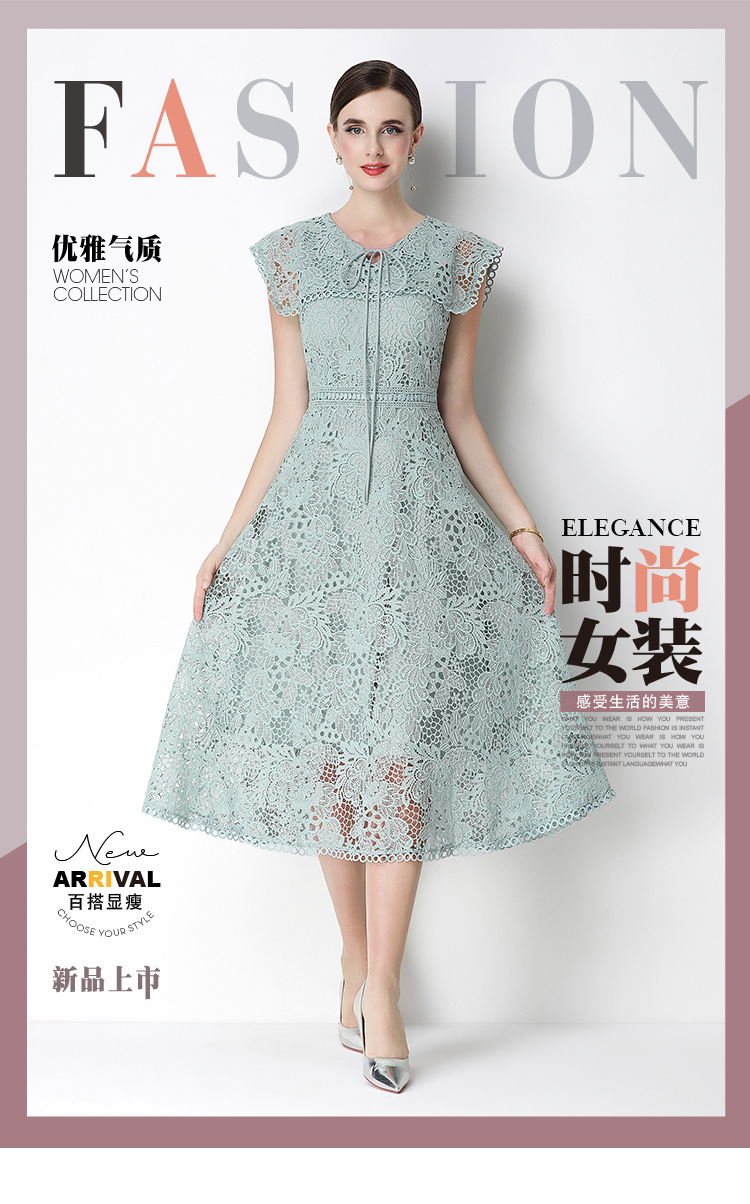 실사 반팔 슬림해 보이는 홀로우 아웃 물 용해 레이스 포지셔닝 중간 길이 드레스