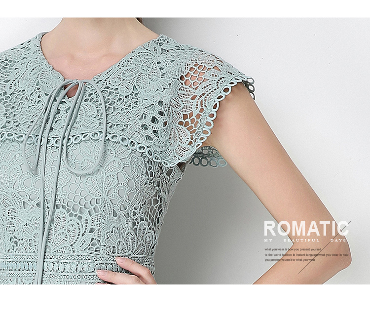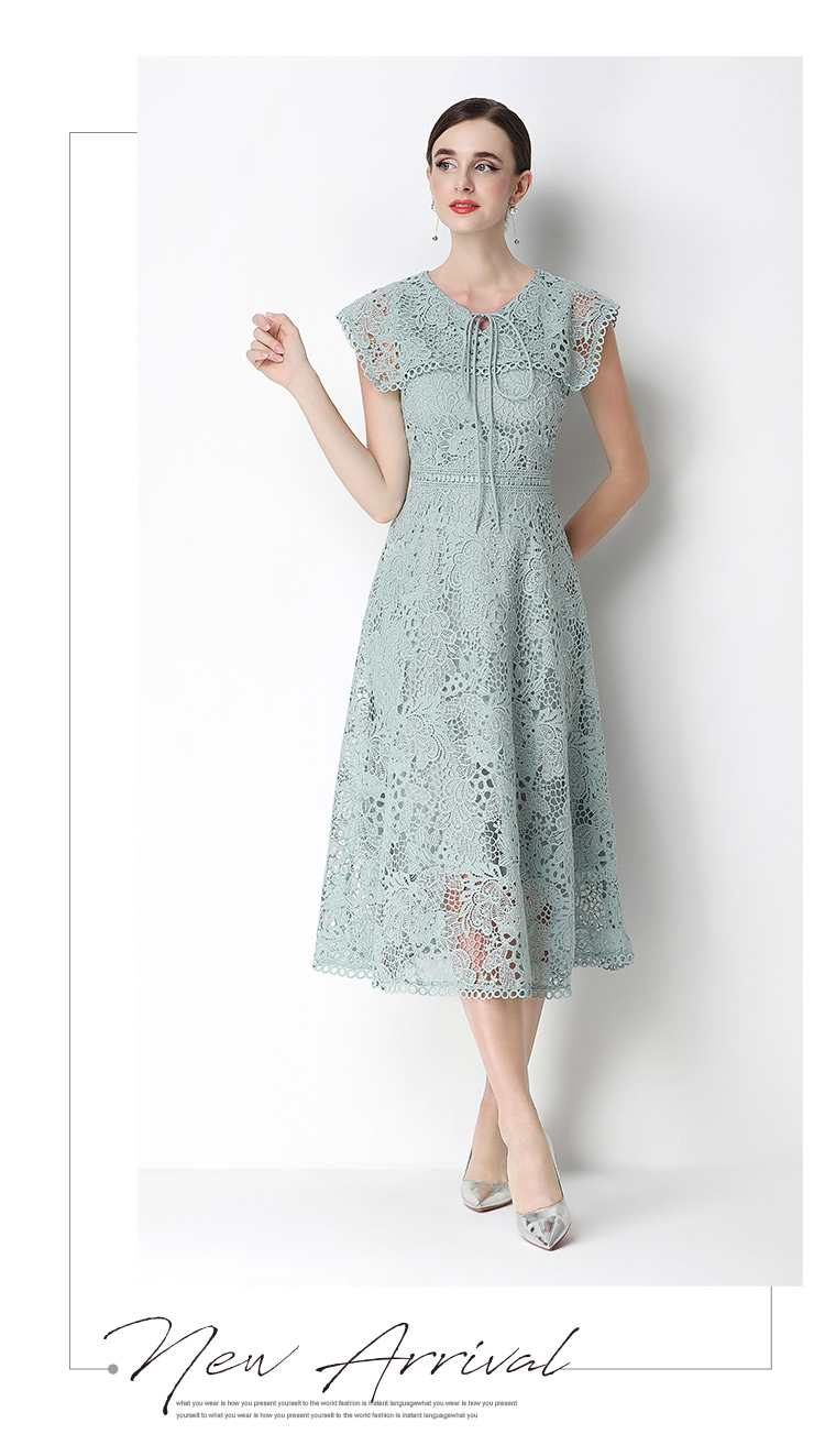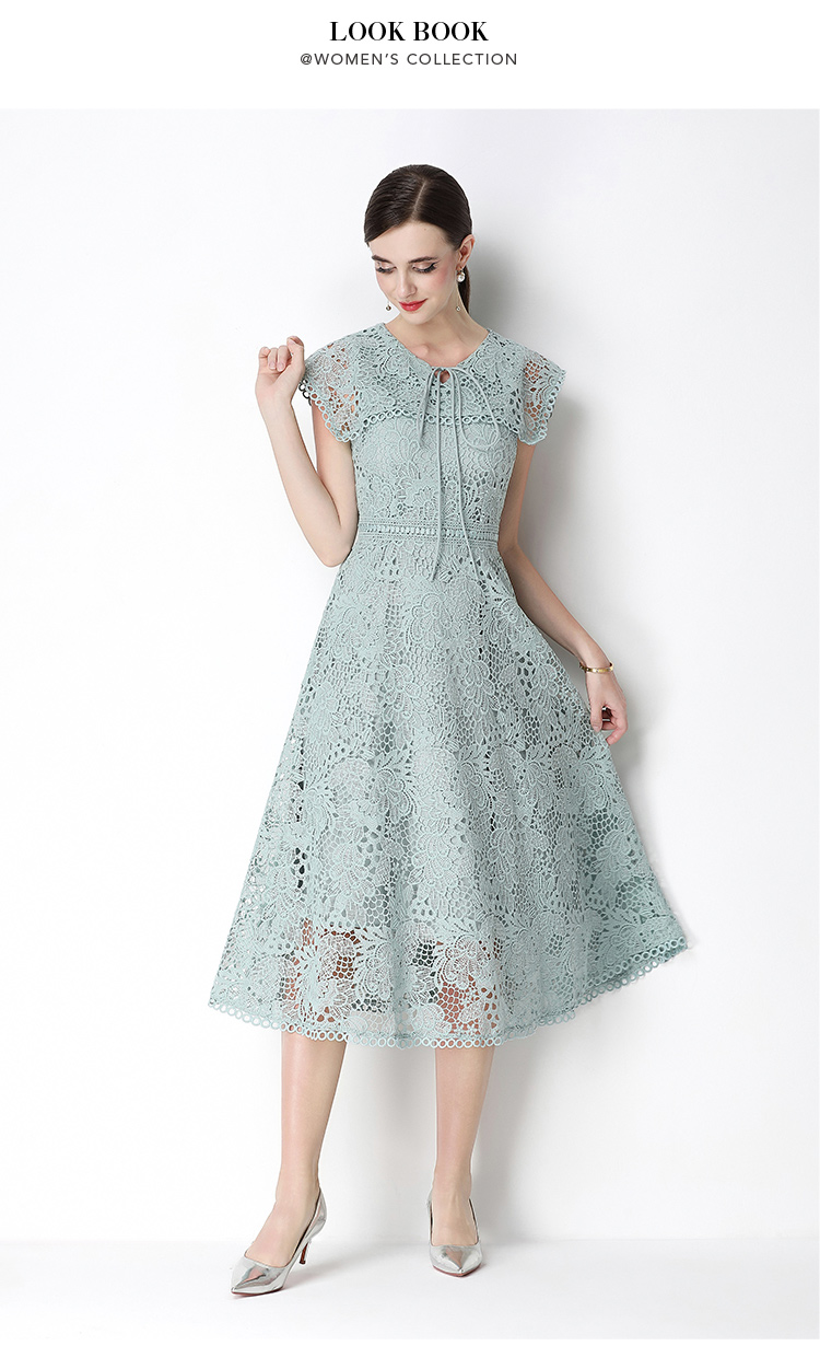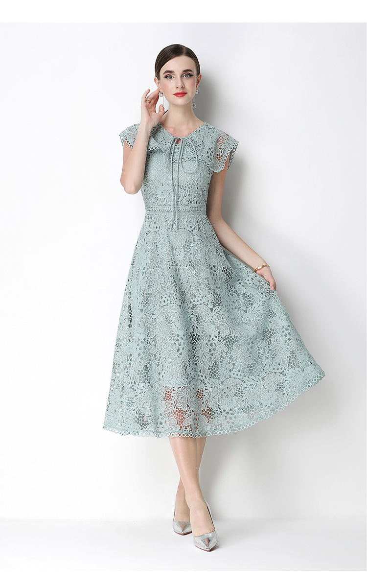 실사 반팔 슬림해 보이는 홀로우 아웃 물 용해 레이스 중간 길이 드레스