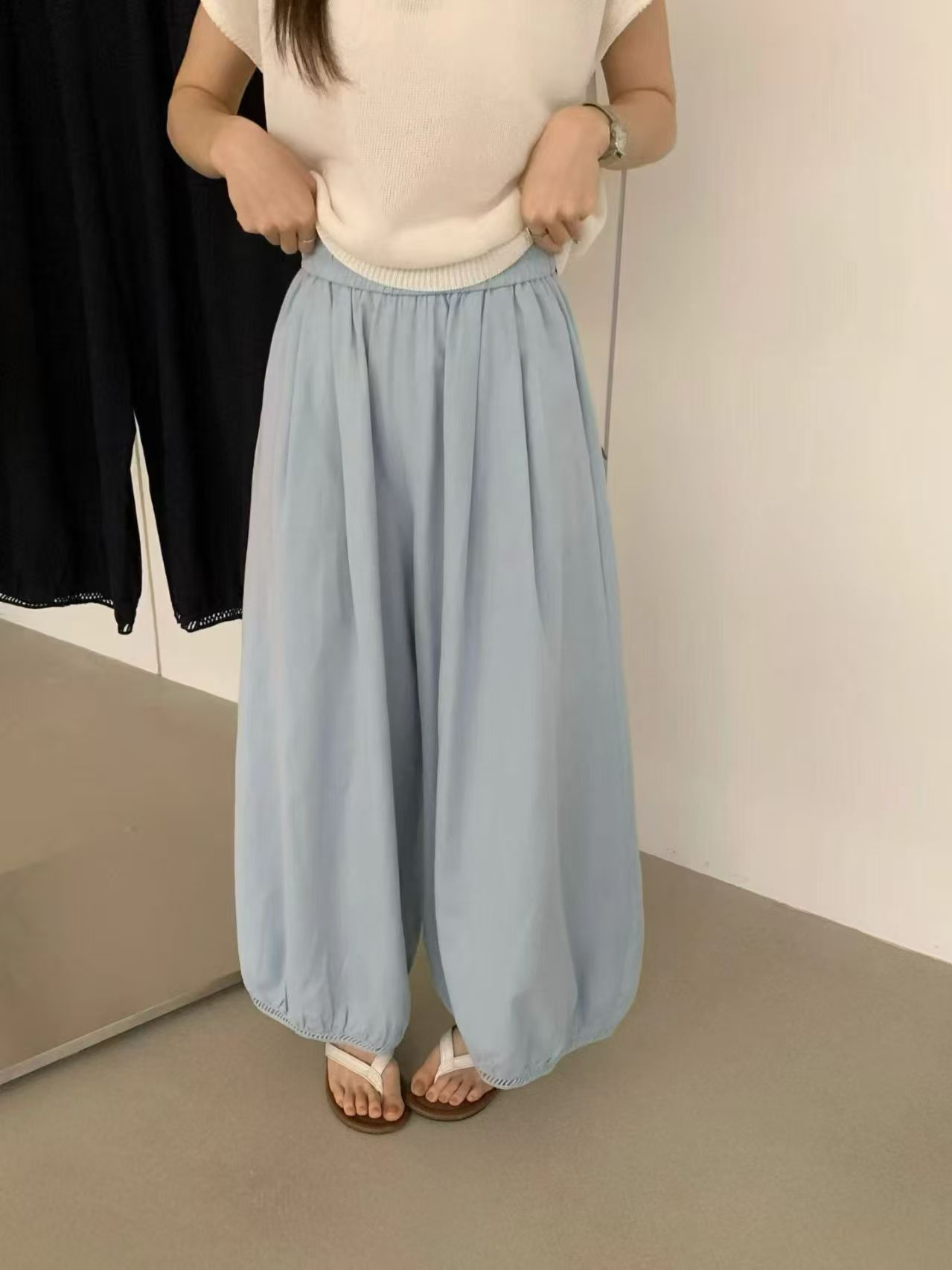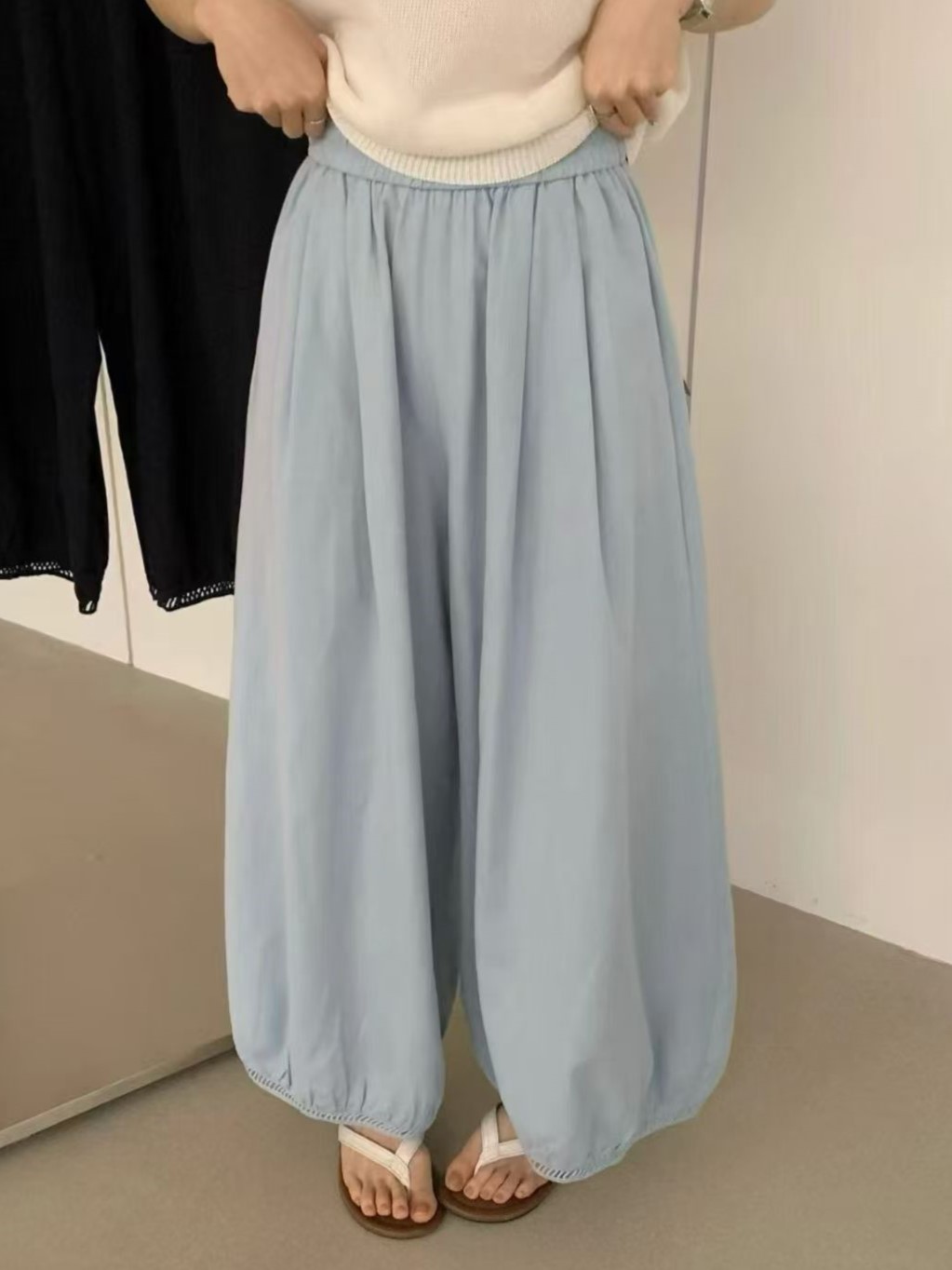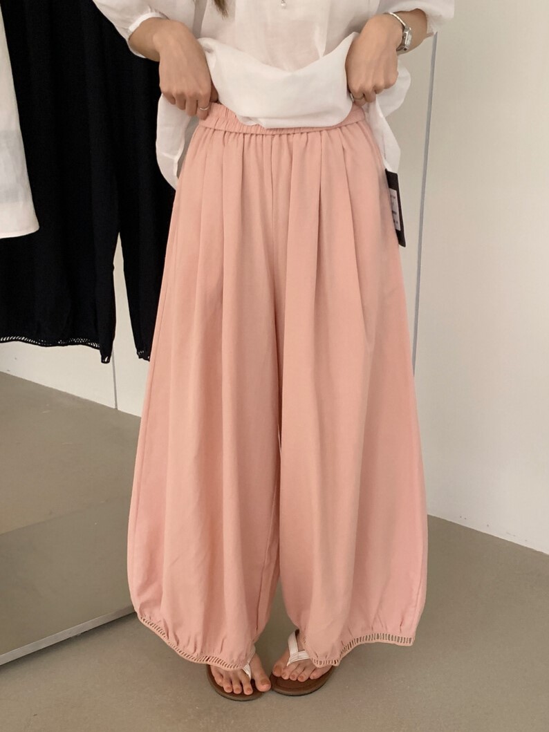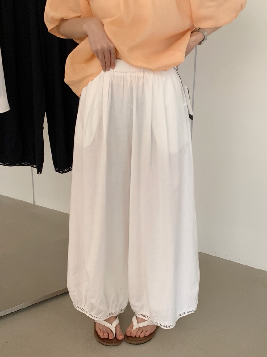 한국 스타일 프릴 9 포인트 꽃밭 바지 여성 여름 디자인 센스 허리밴드 루즈핏 와이드 레깅스 바지
