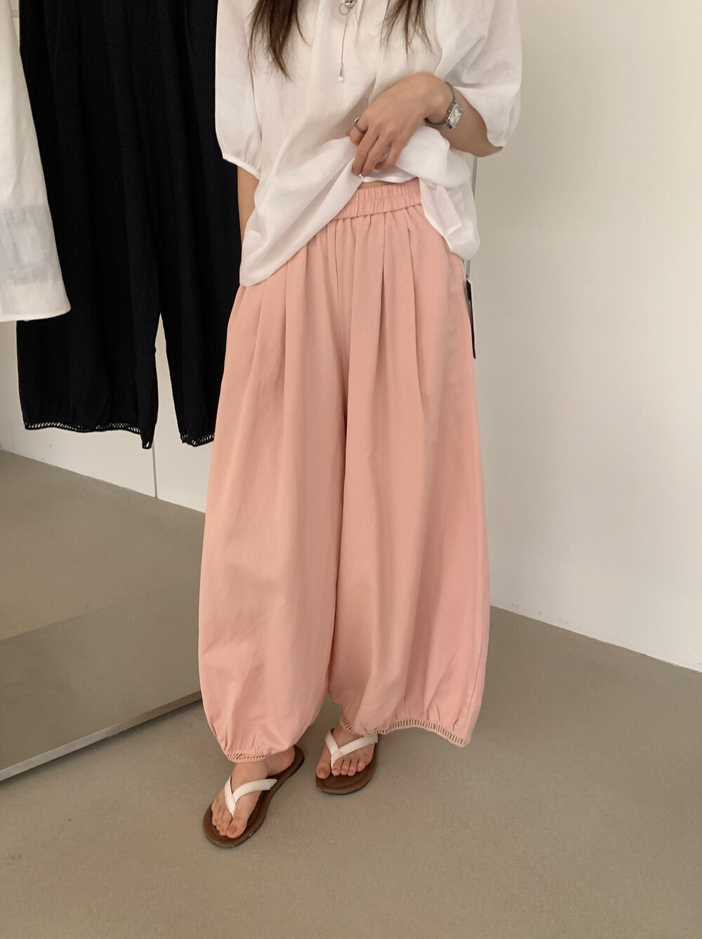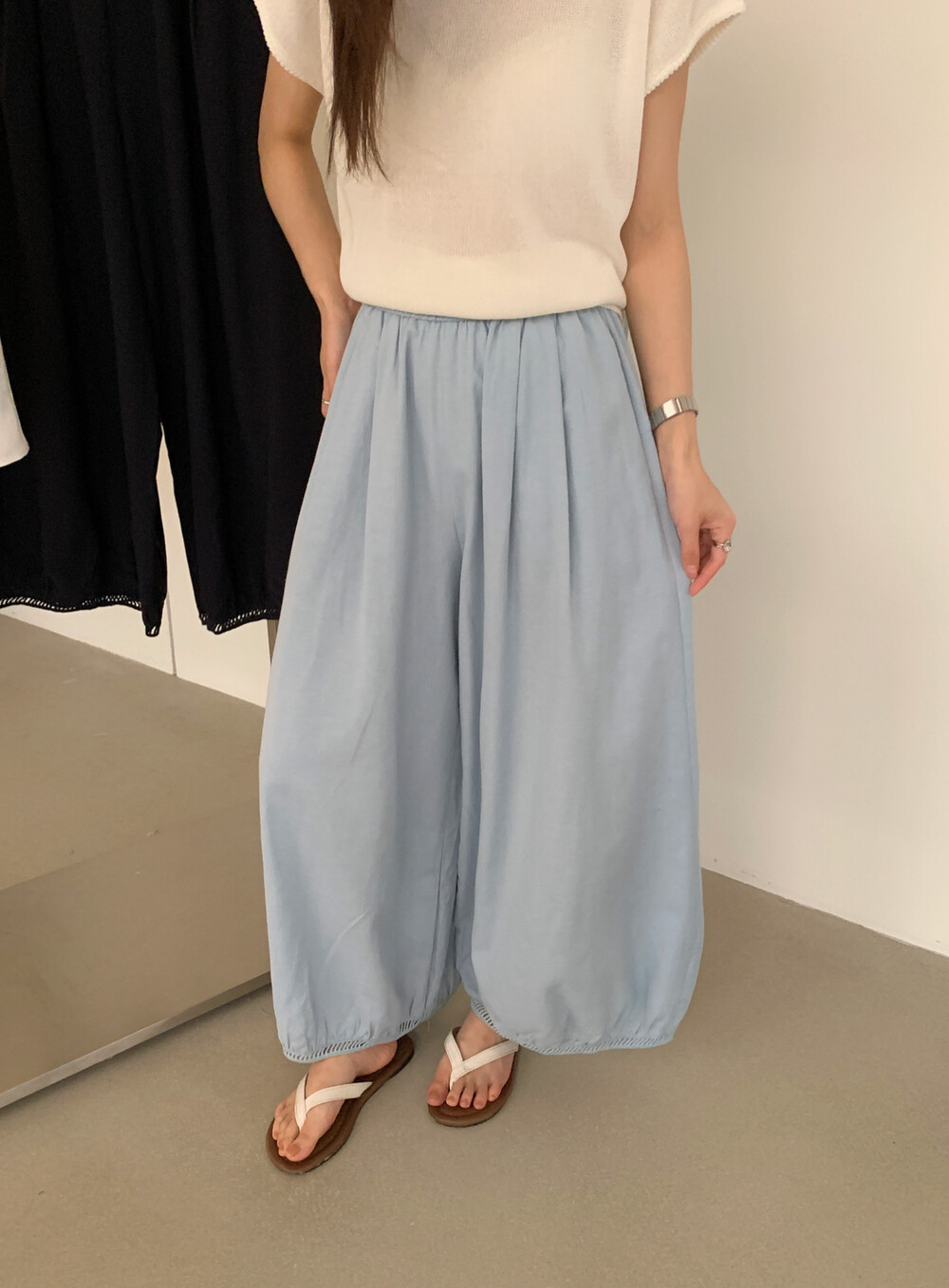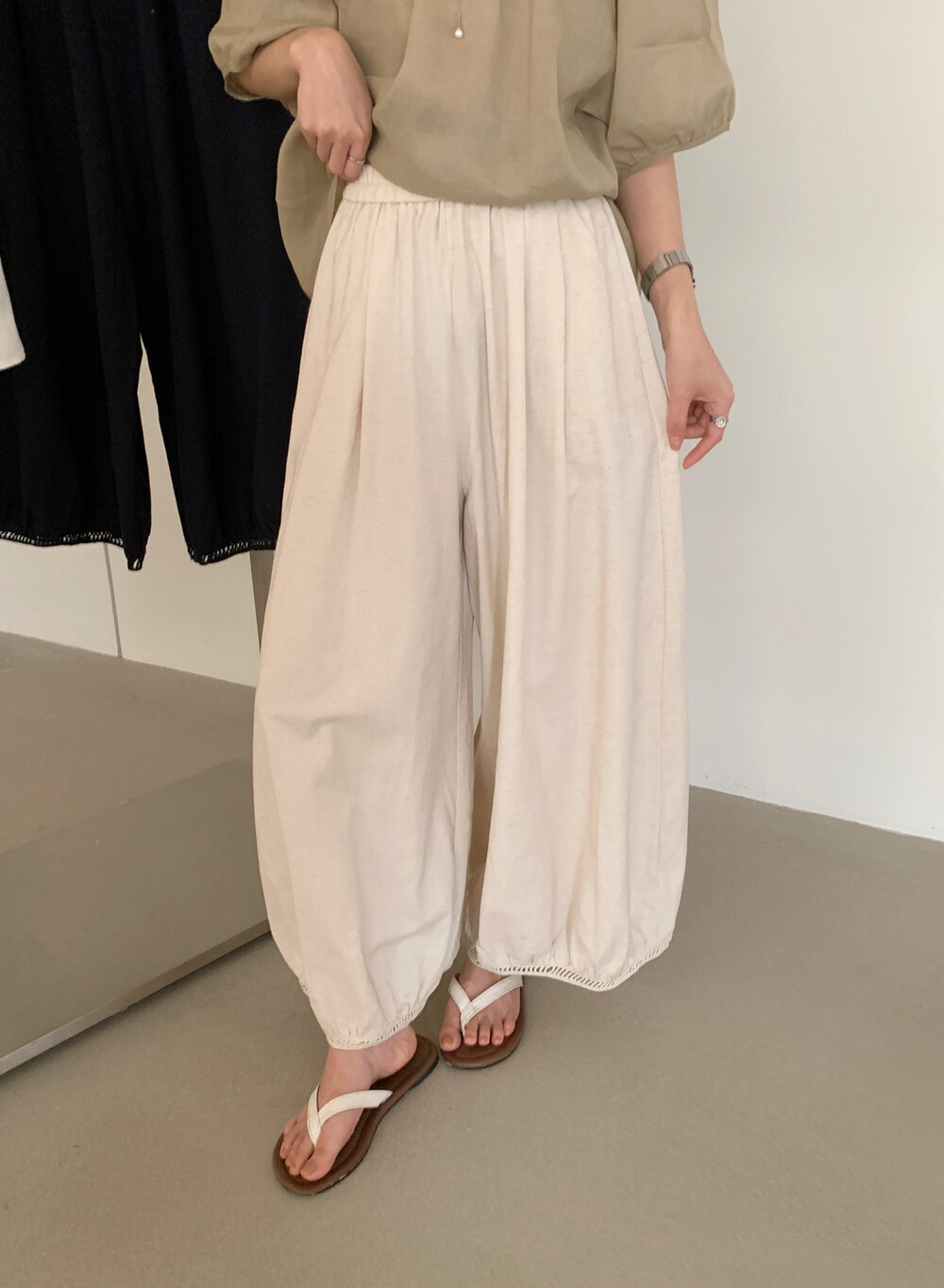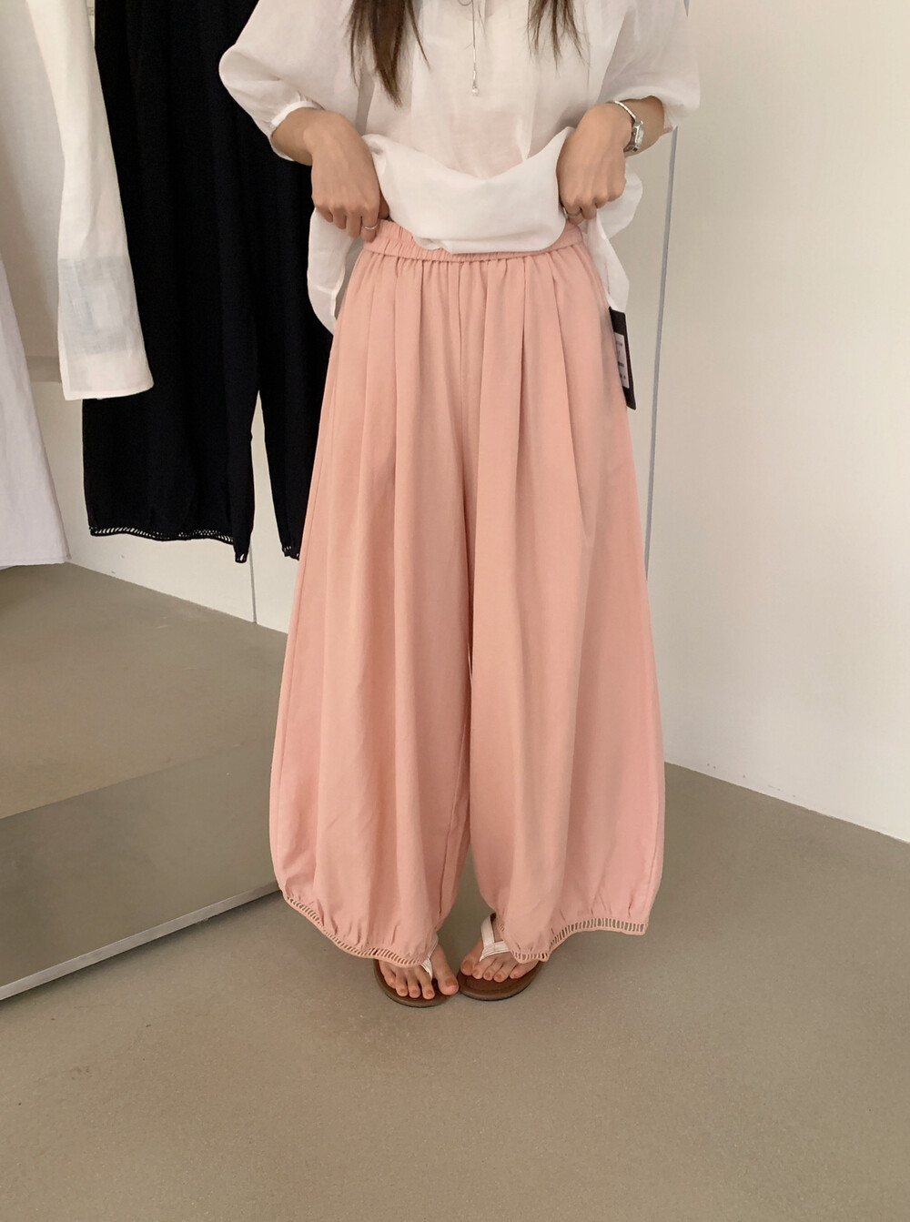 한국 스타일 프릴 9 포인트 꽃밭 바지 여성 여름 디자인 센스 허리밴드 루즈핏 와이드 레깅스 바지