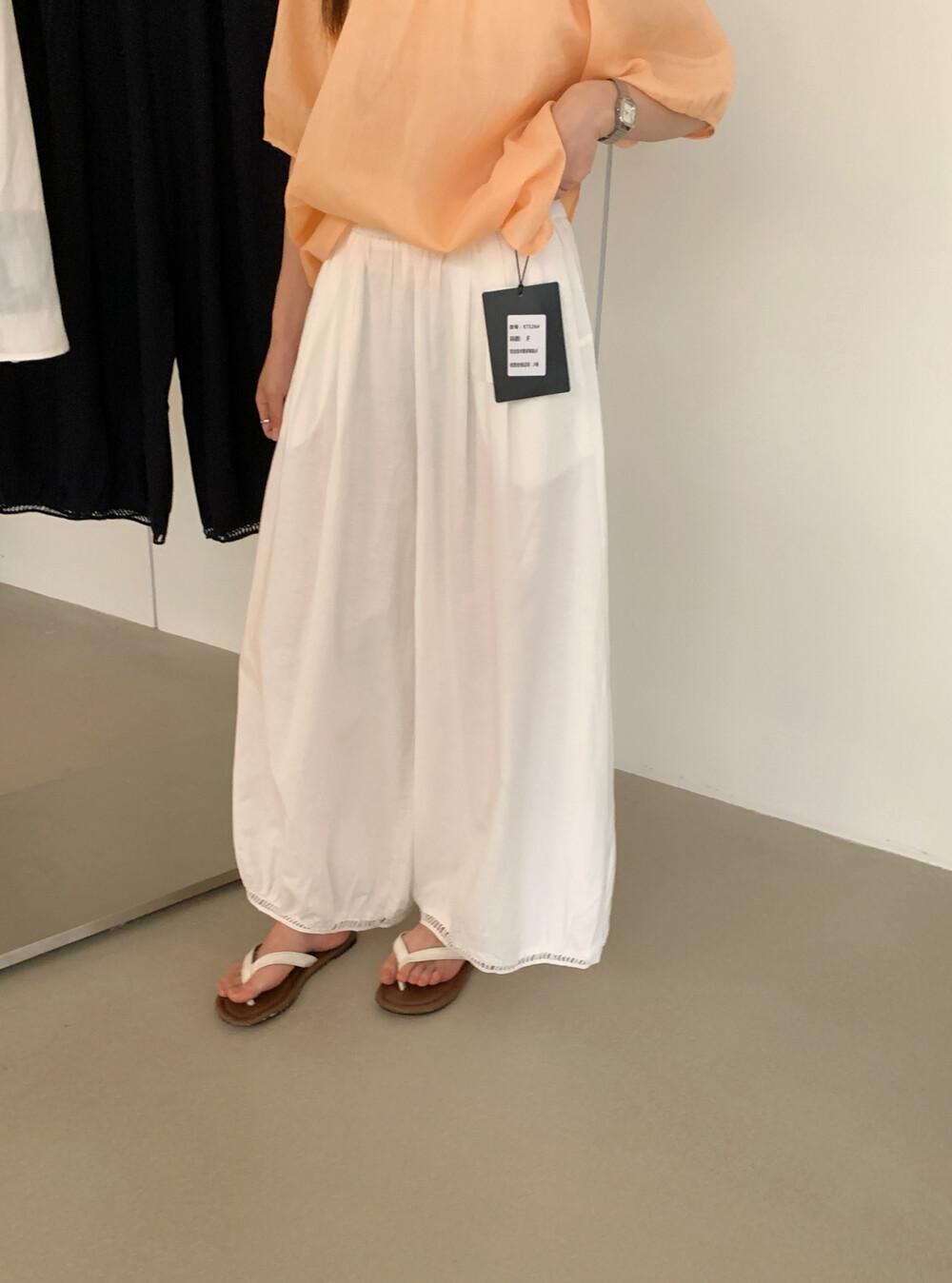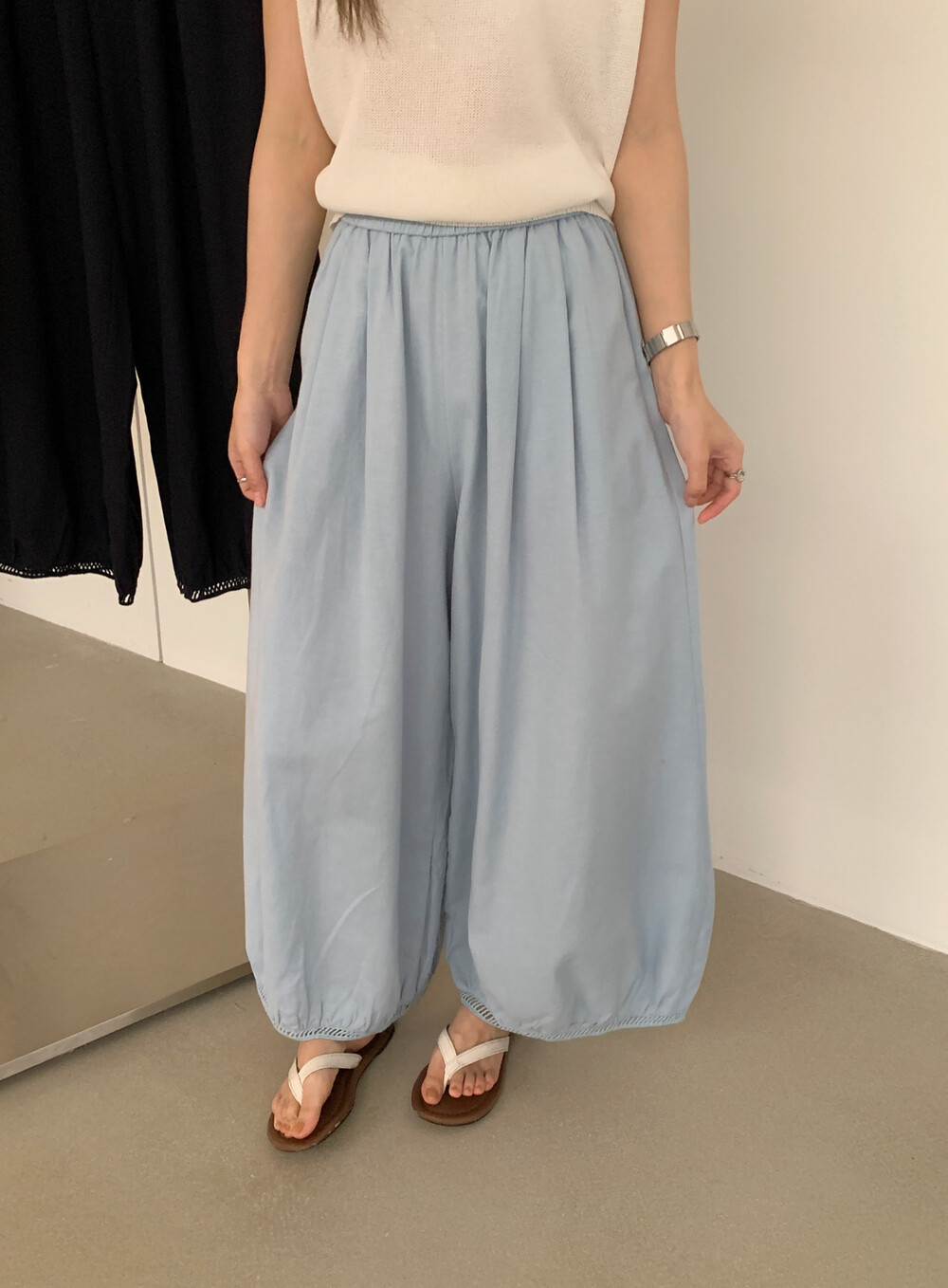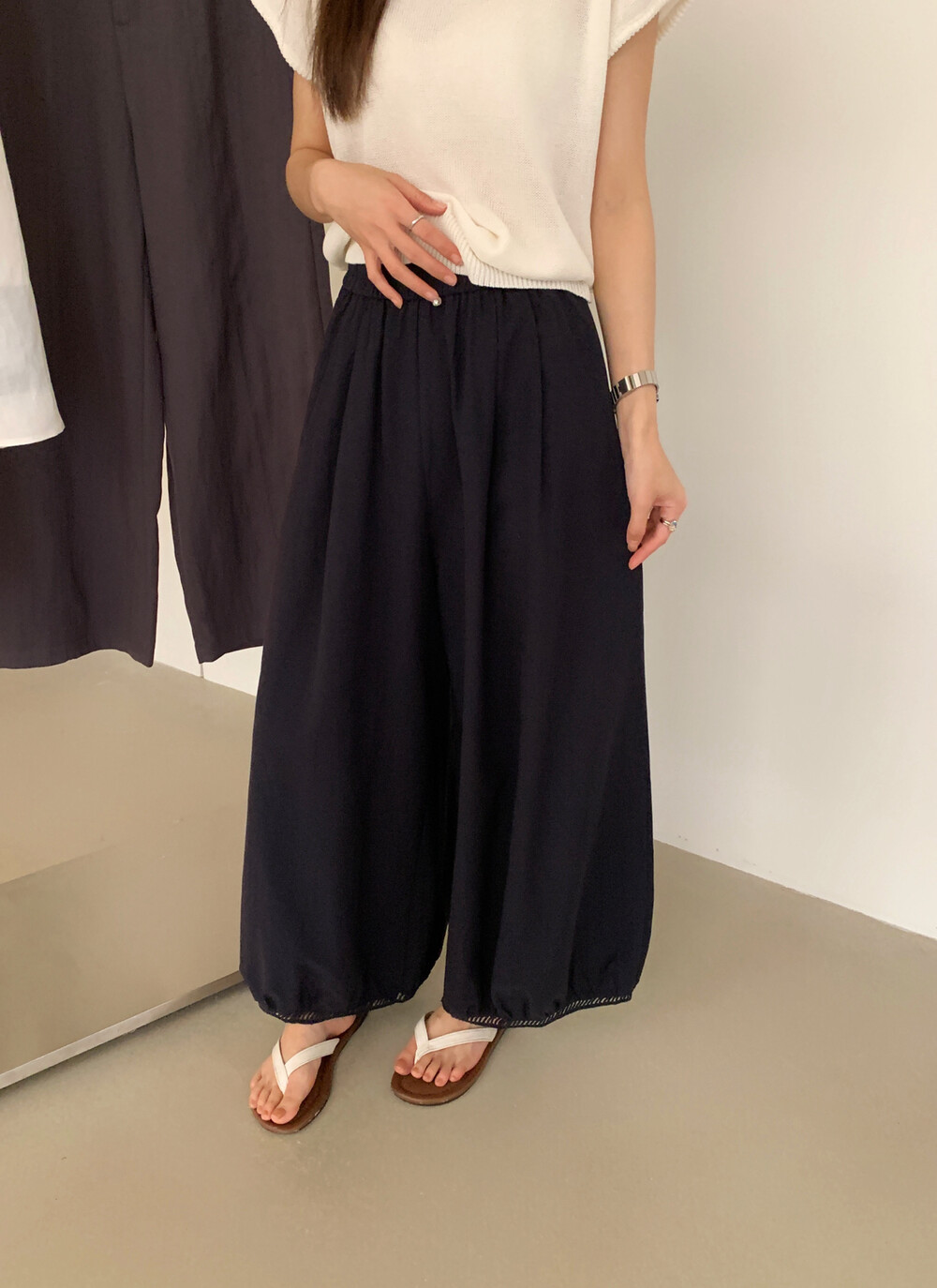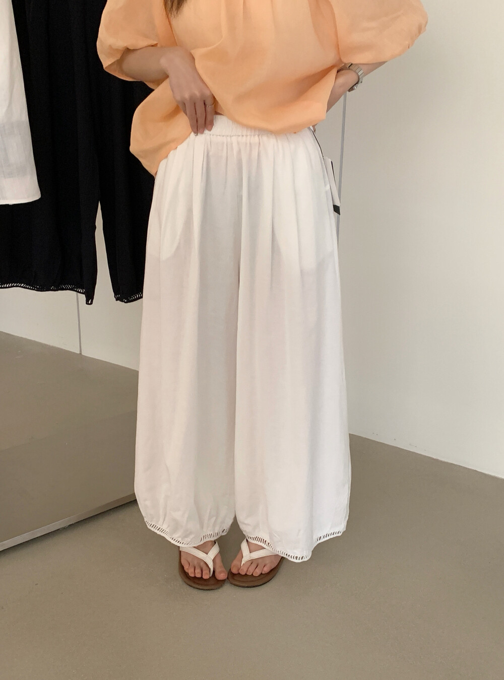한국 스타일 프릴 9 포인트 꽃밭 바지 여성 여름 디자인 센스 허리밴드 루즈핏 와이드 레깅스 바지