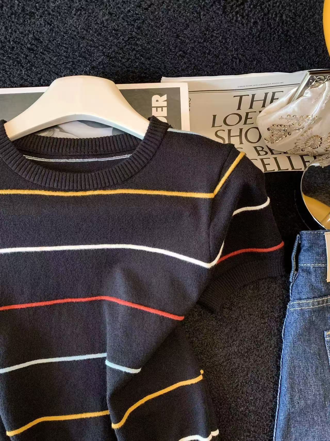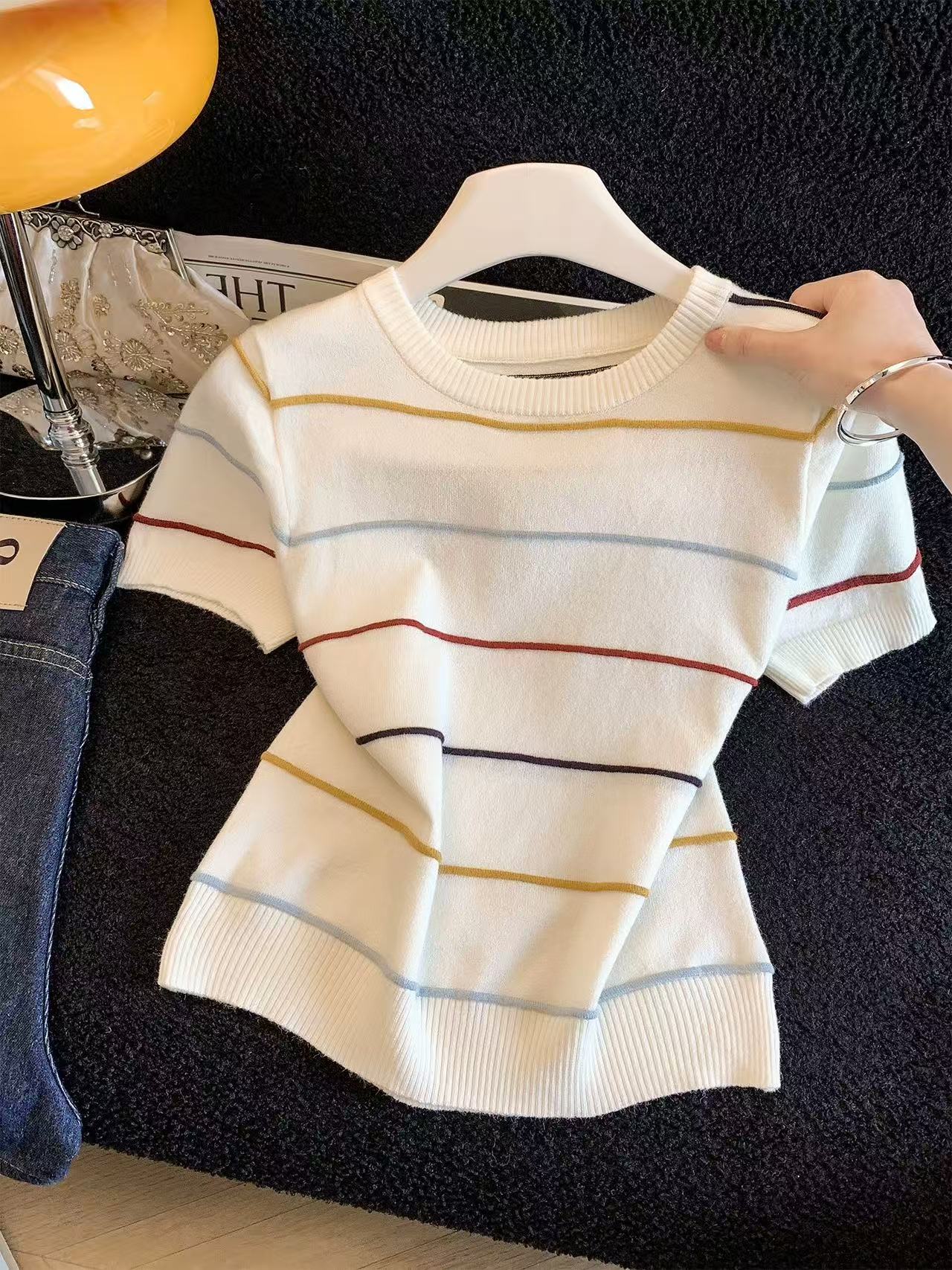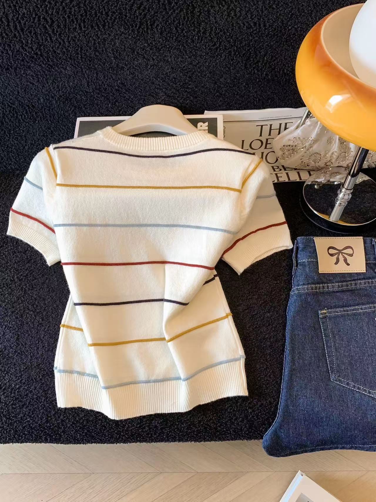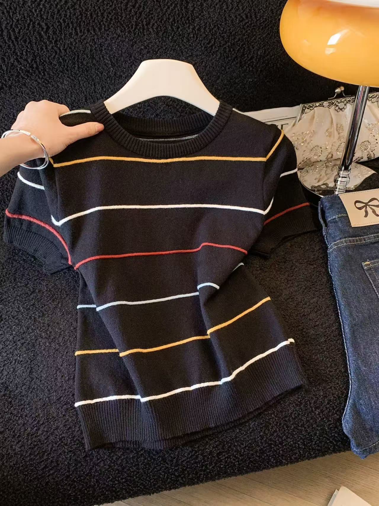 2025 여름 새로운 연령 감소 배색 스트라이프 라운드 넥 얼음 실크 니트 스웨터 반팔 티셔츠 여성 외국 가스 다용도 맨위
