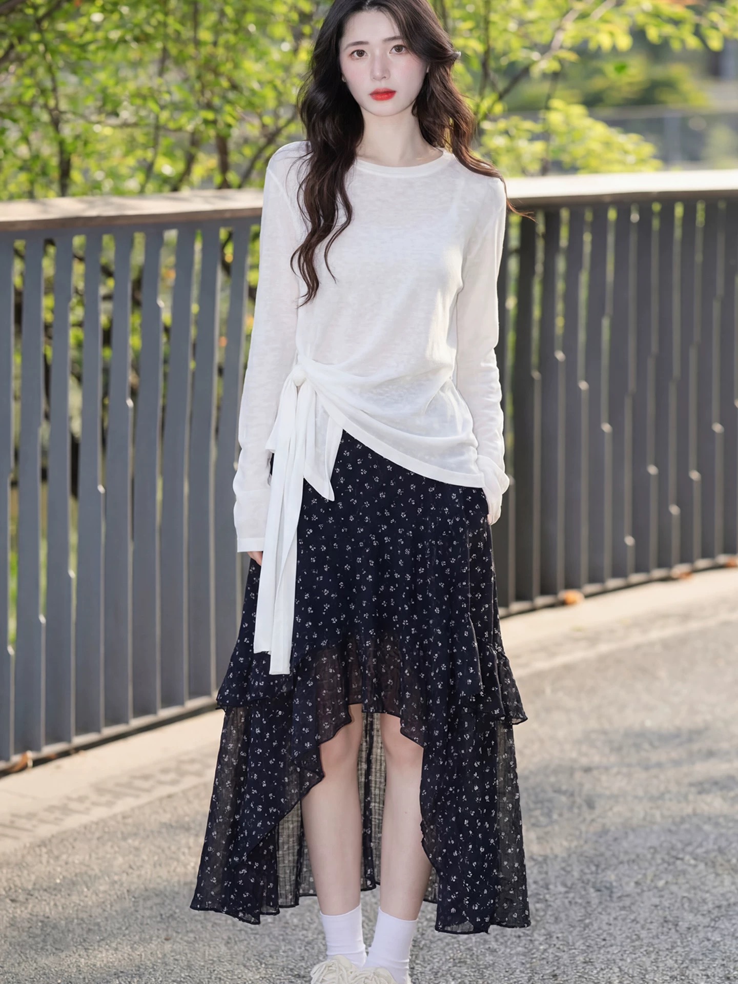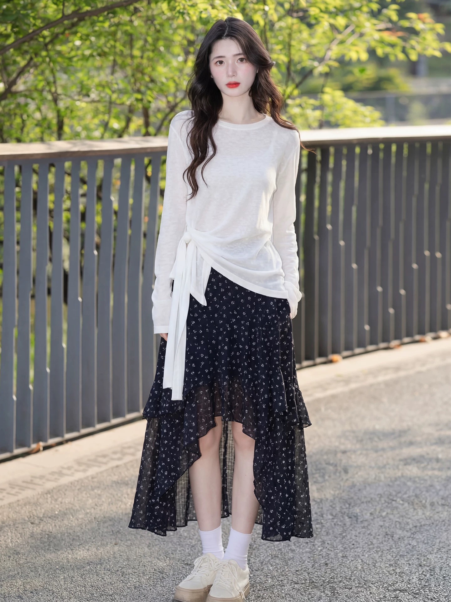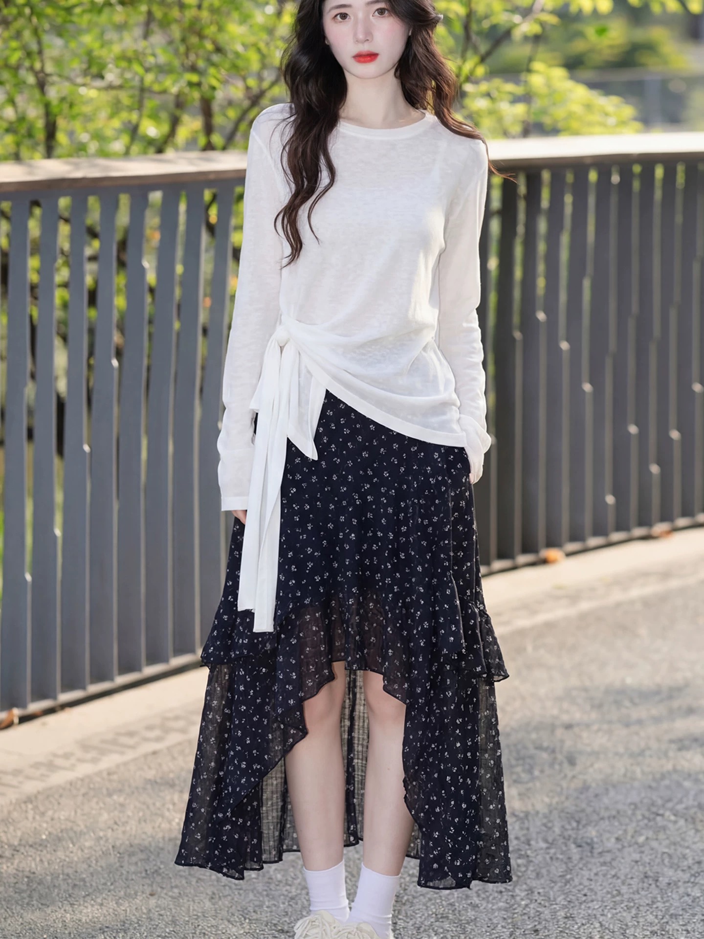 품격 슬림해 보이는 스트랩 긴팔 맨위 불규칙 하이웨이스트 다용도 꽃무늬 치마 세트 여성 열린 봄 착용 가져 가라. 전체 집합
