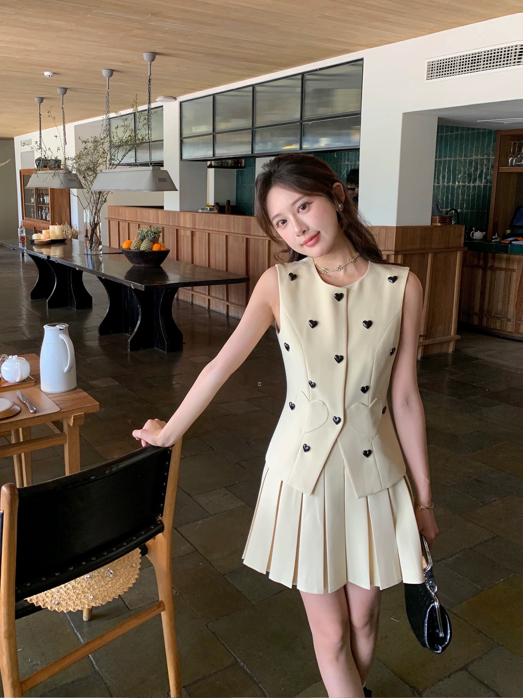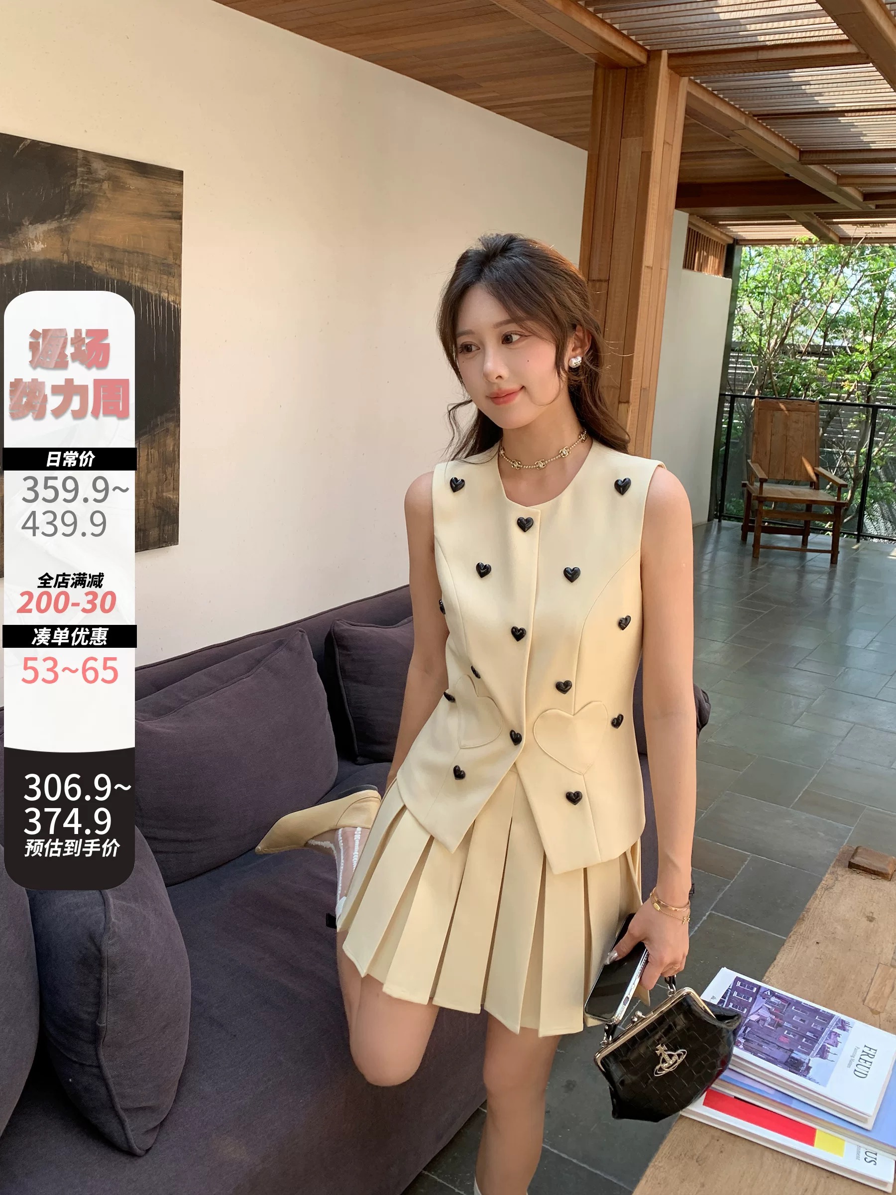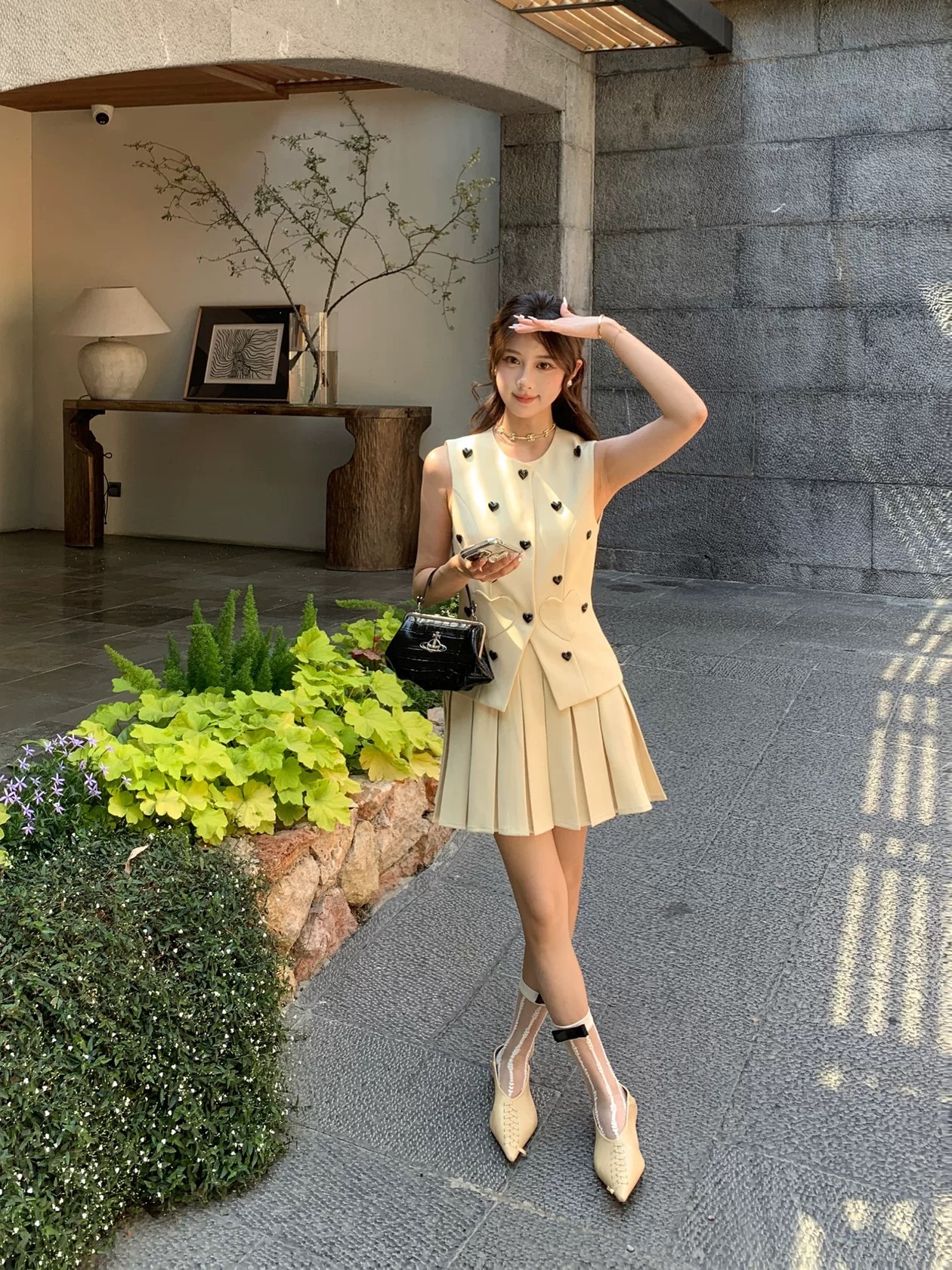 여름 홈 금속 하트 몸매 가꾸기 정장 베스트 조끼 플리츠 반신 미니 스커트 투피스 슈트 여성 여름 얇은 스타일