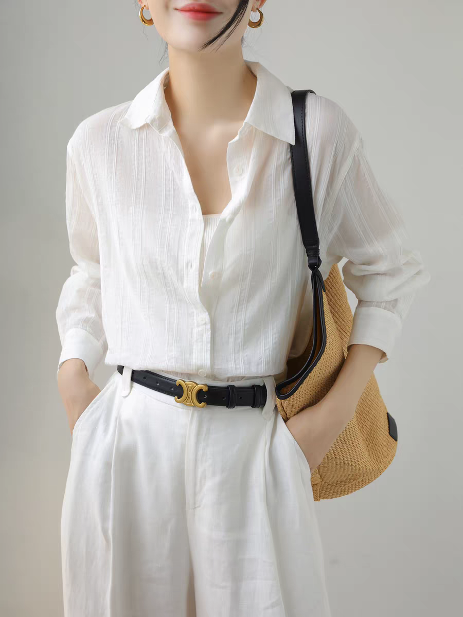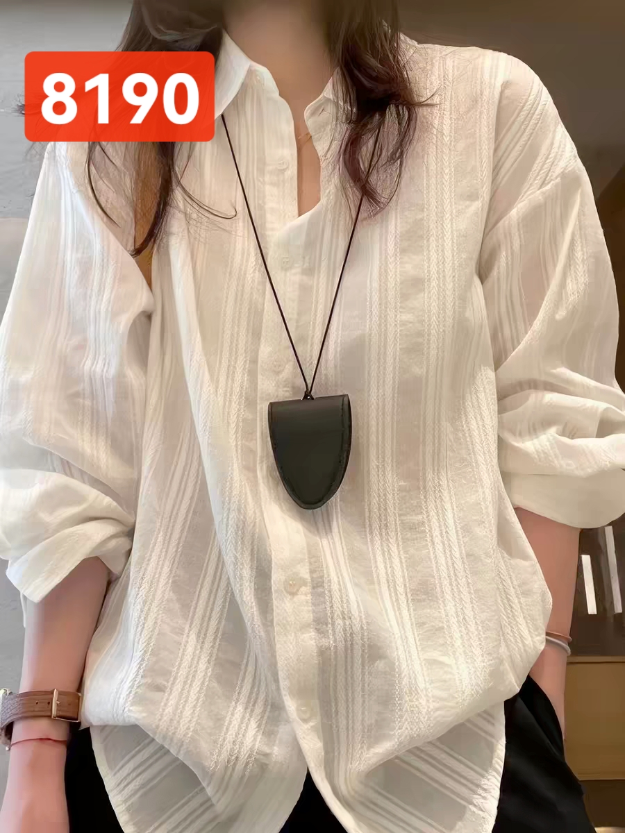 화이트 순면 자카드 질감 얇은 스타일 셔츠 여성 여름 루즈핏 가을 어깨 긴팔 맨위 다용도 캐주얼 셔츠