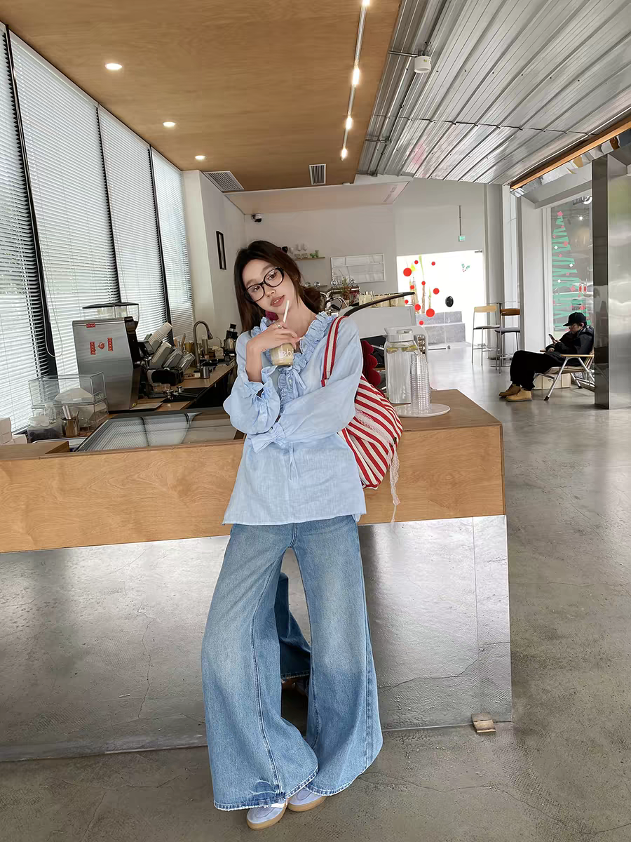 제직 섬 느슨함 느긋한 프랑스식 낭만주의 100 아마 수공 프릴 V넥 스트랩 여성 셔츠 2026 봄