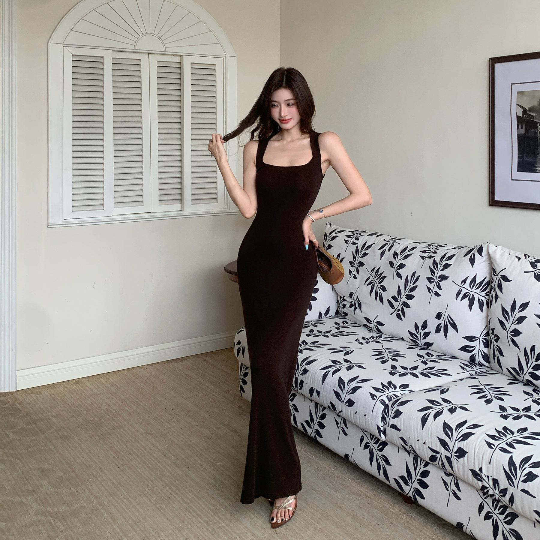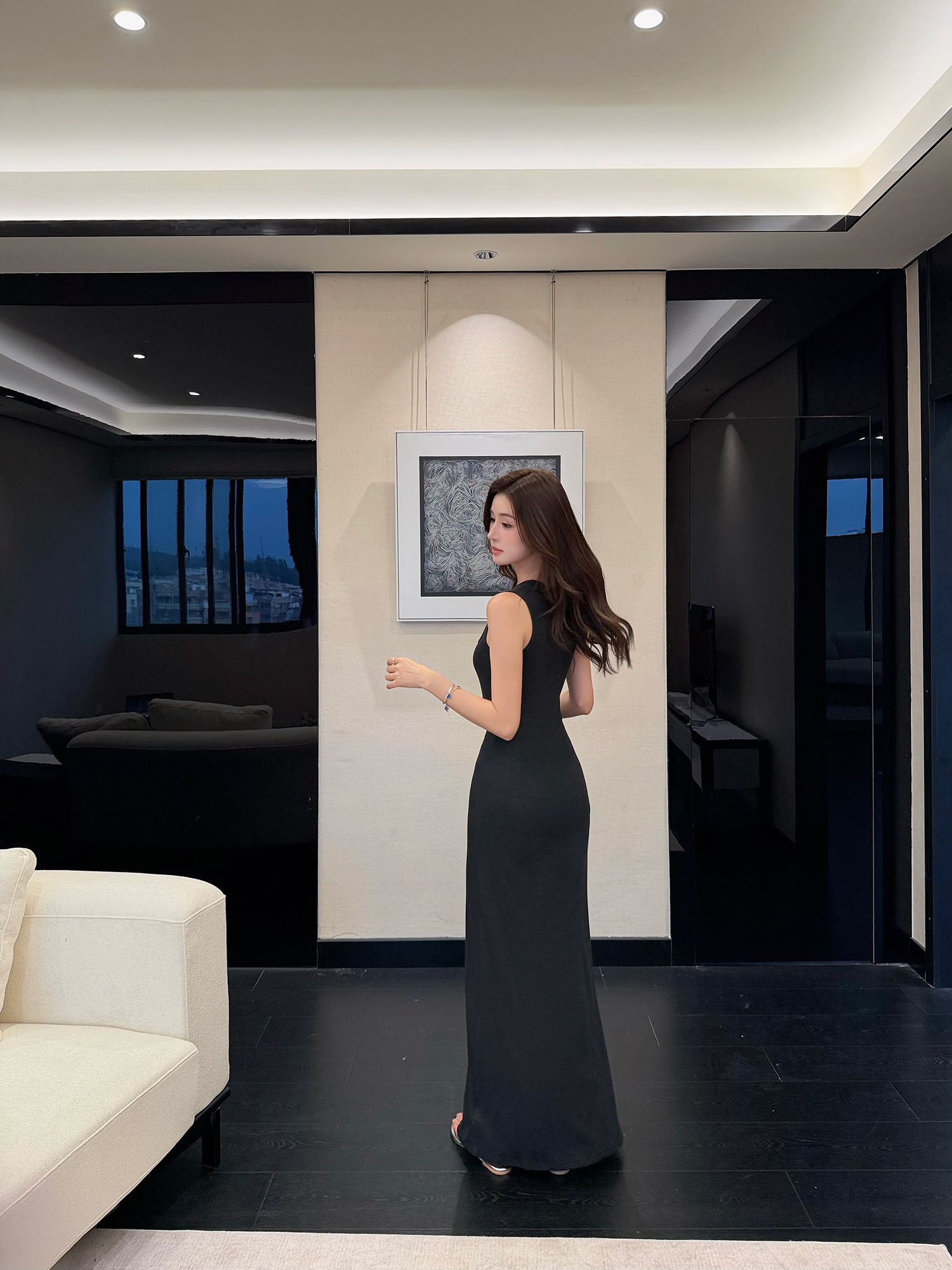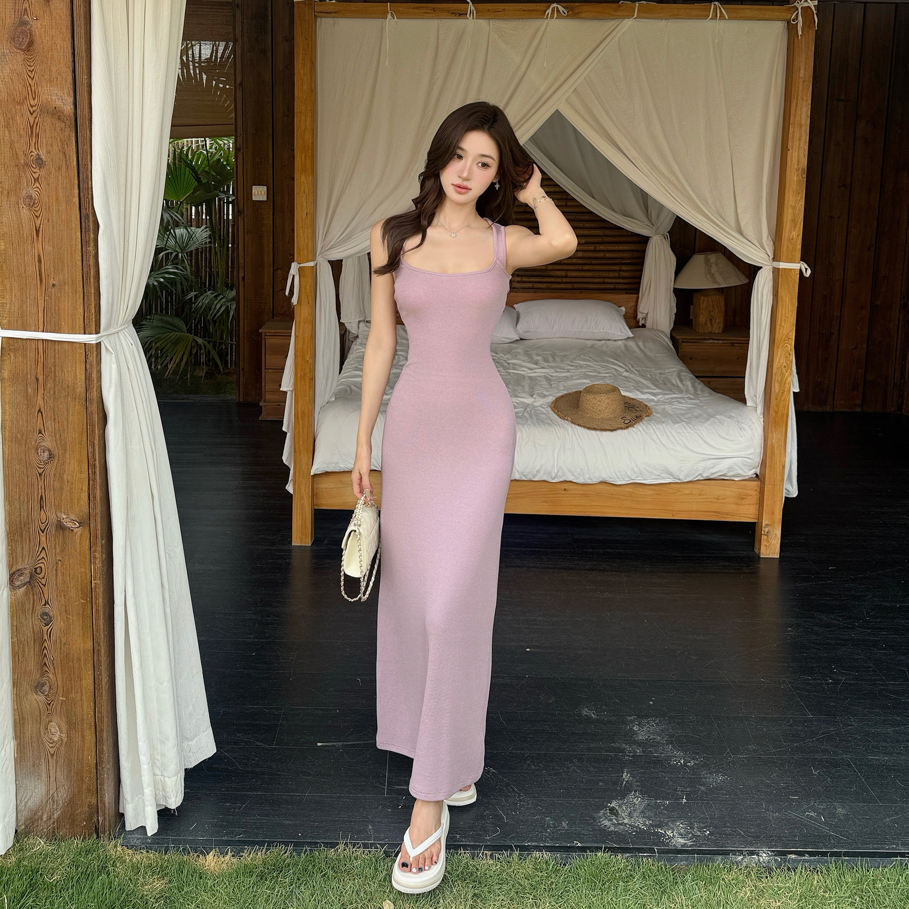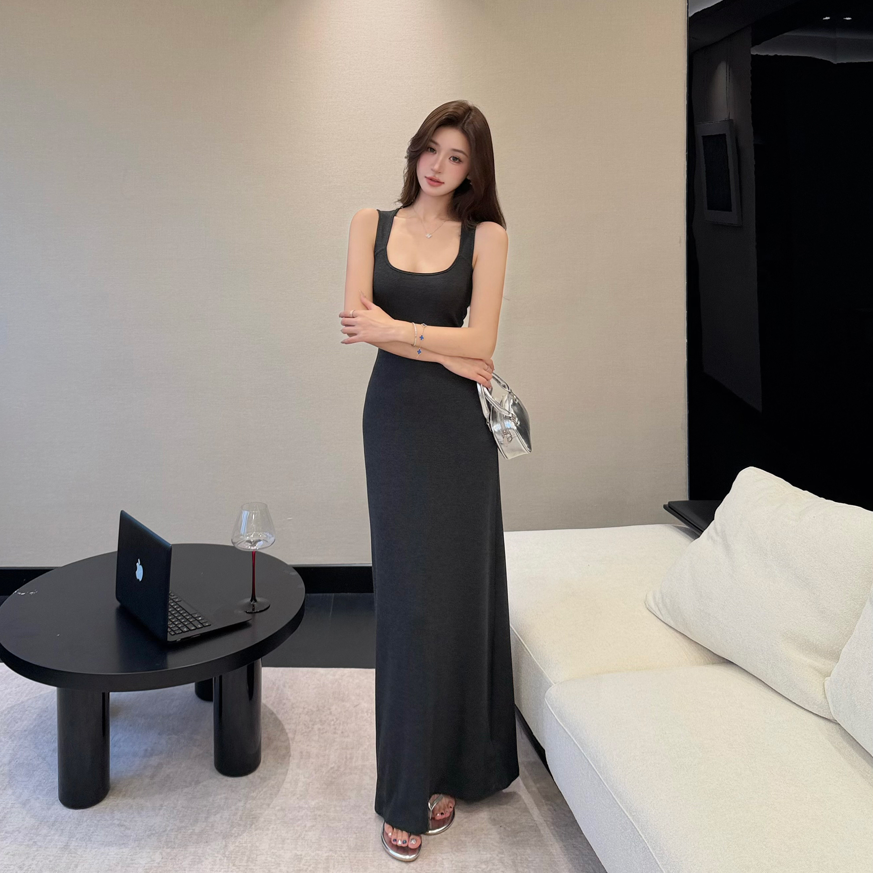 빛 럭셔리 바람 민소매 허리 수축 여성 드레스 트임 슬림해 보이는 디자인 센스 치마