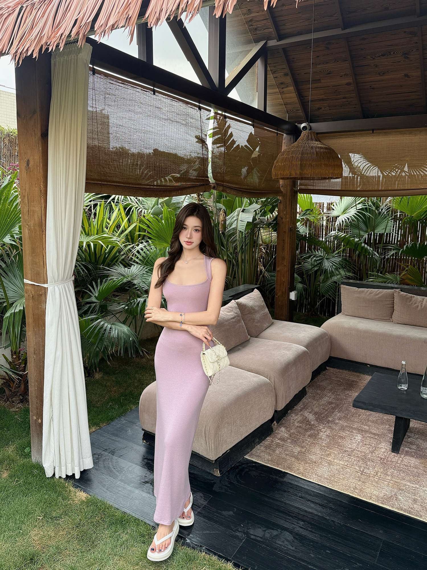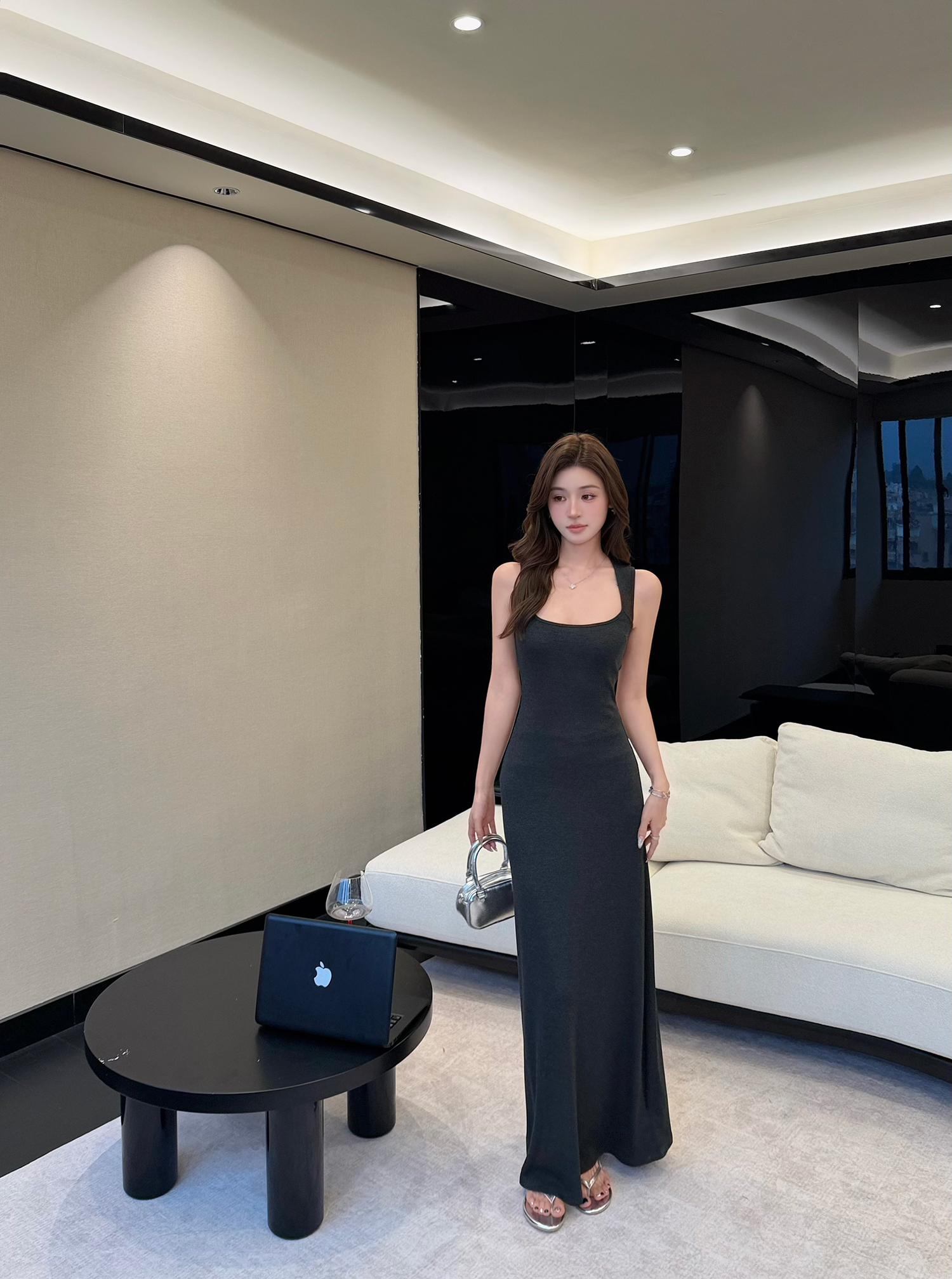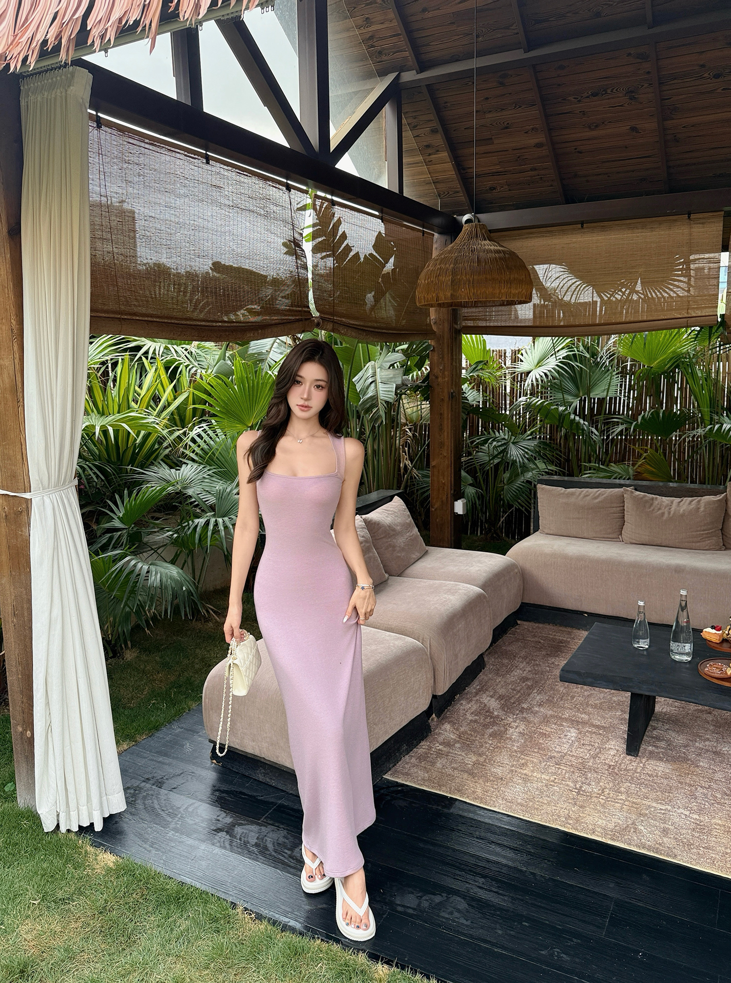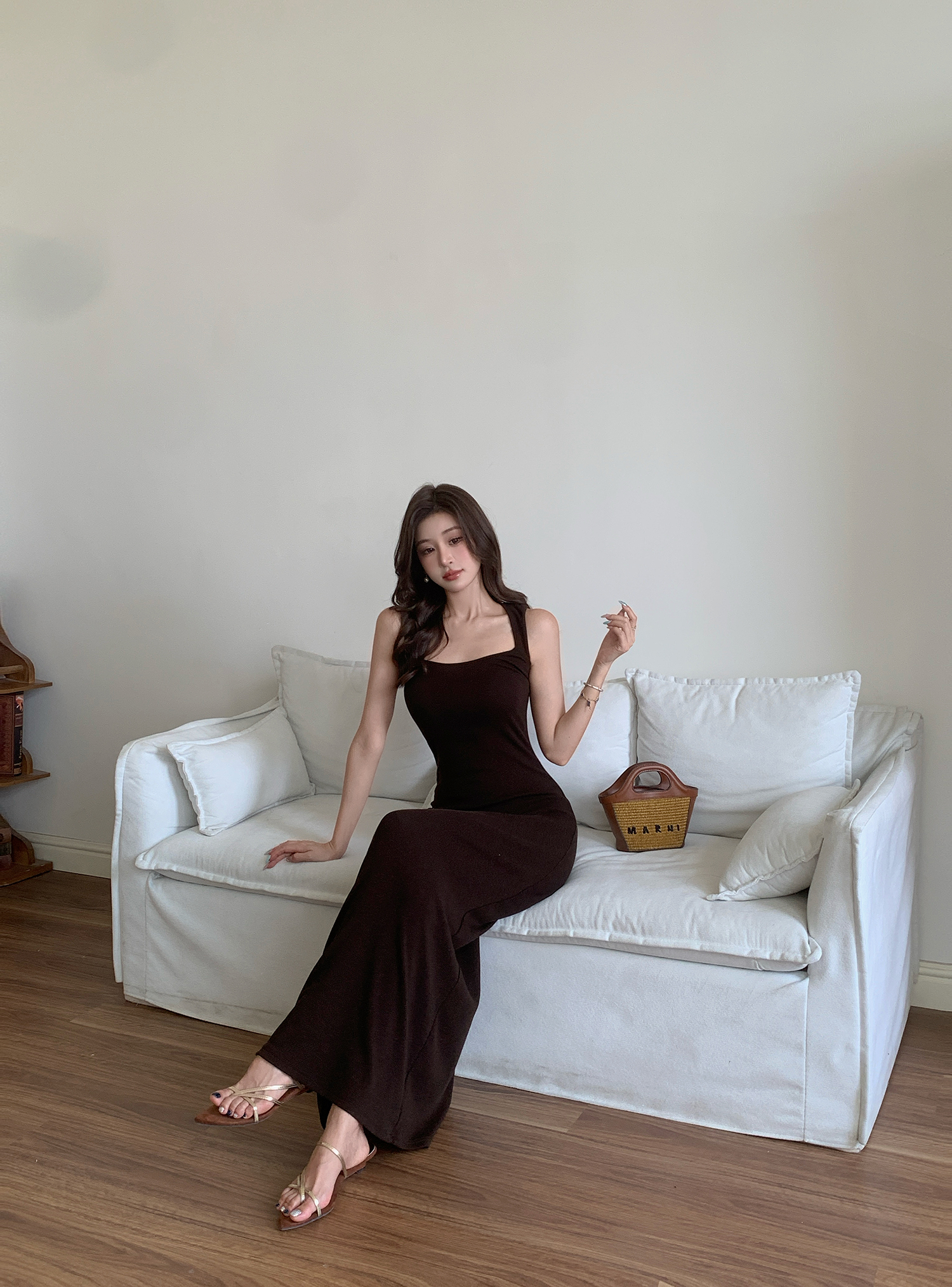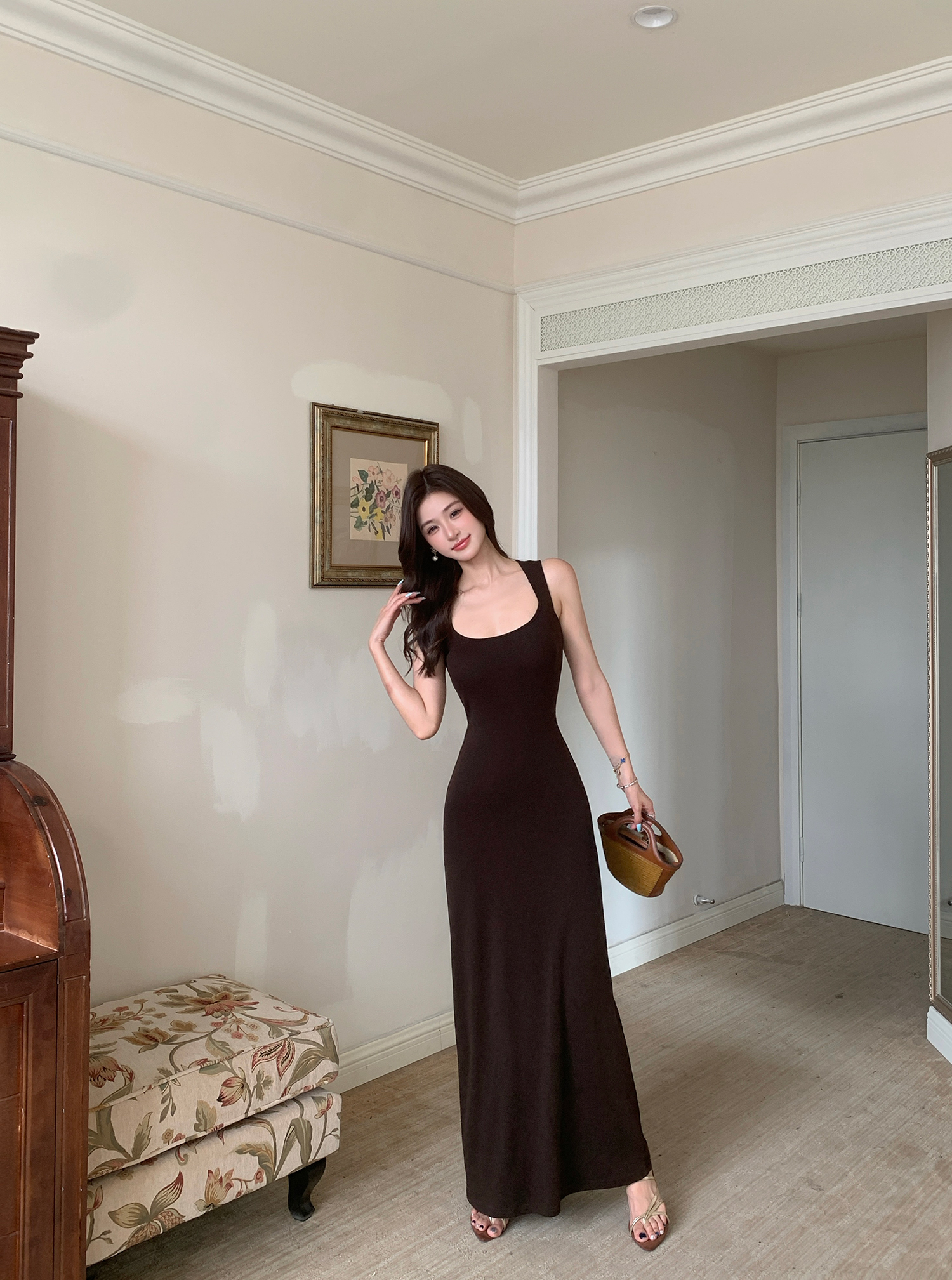 빛 럭셔리 바람 민소매 허리 수축 여성 드레스 트임 슬림해 보이는 디자인 센스 치마