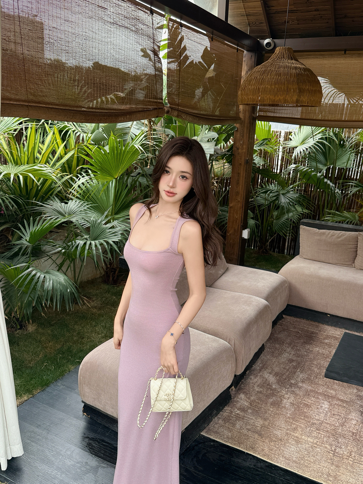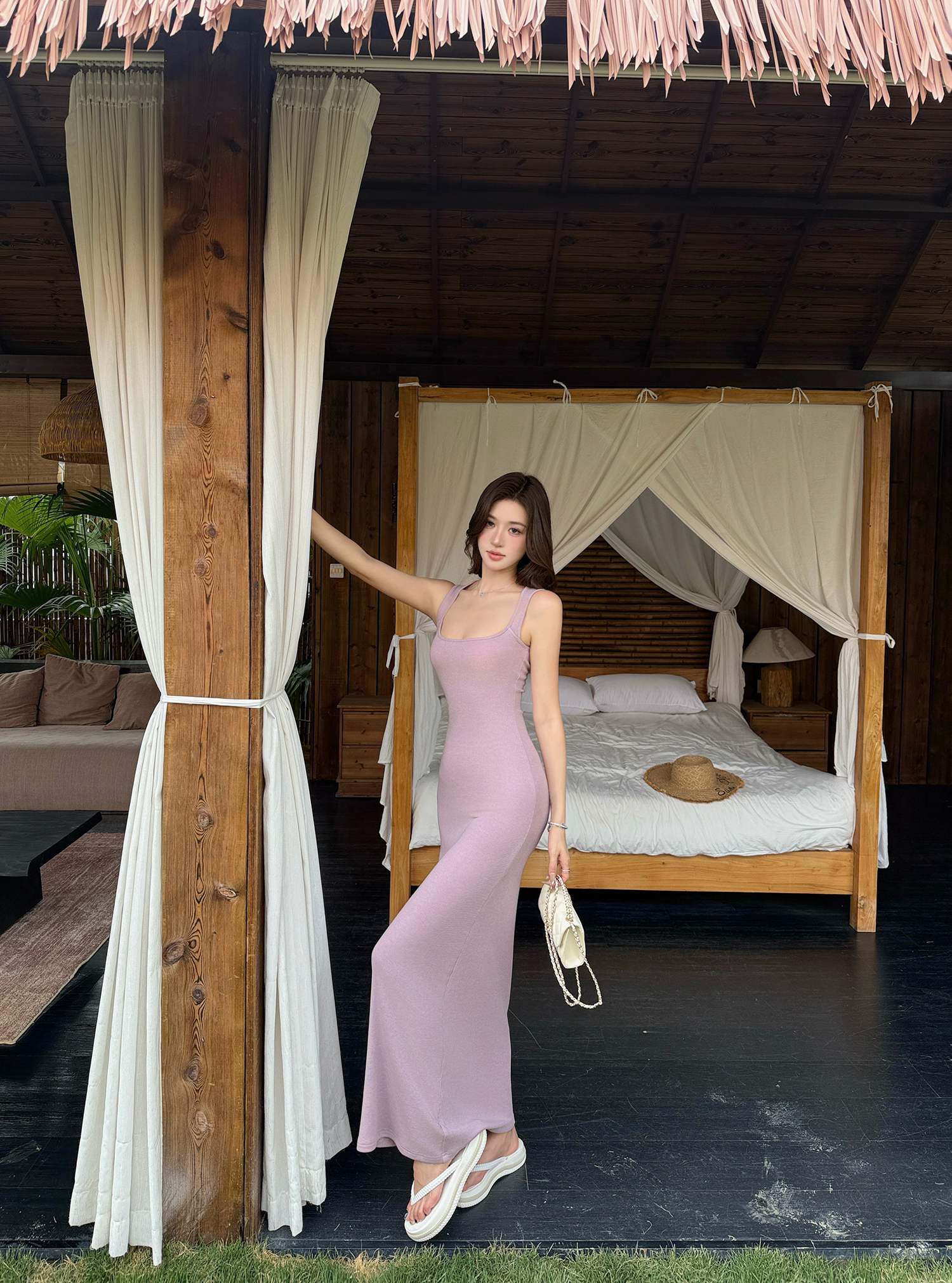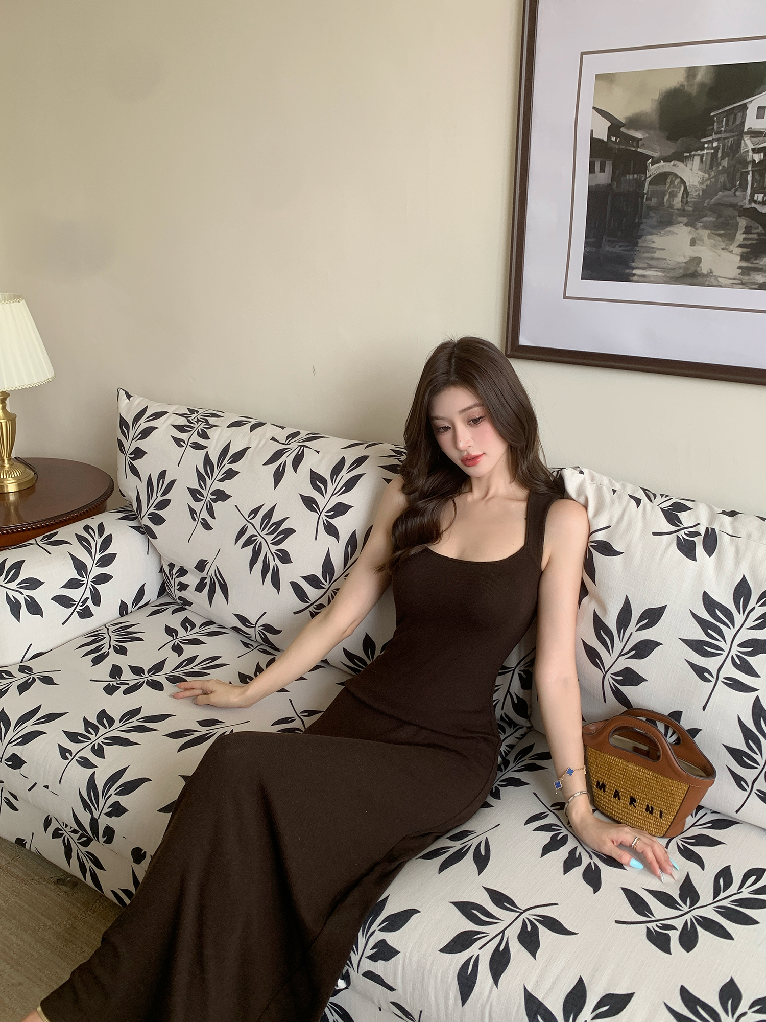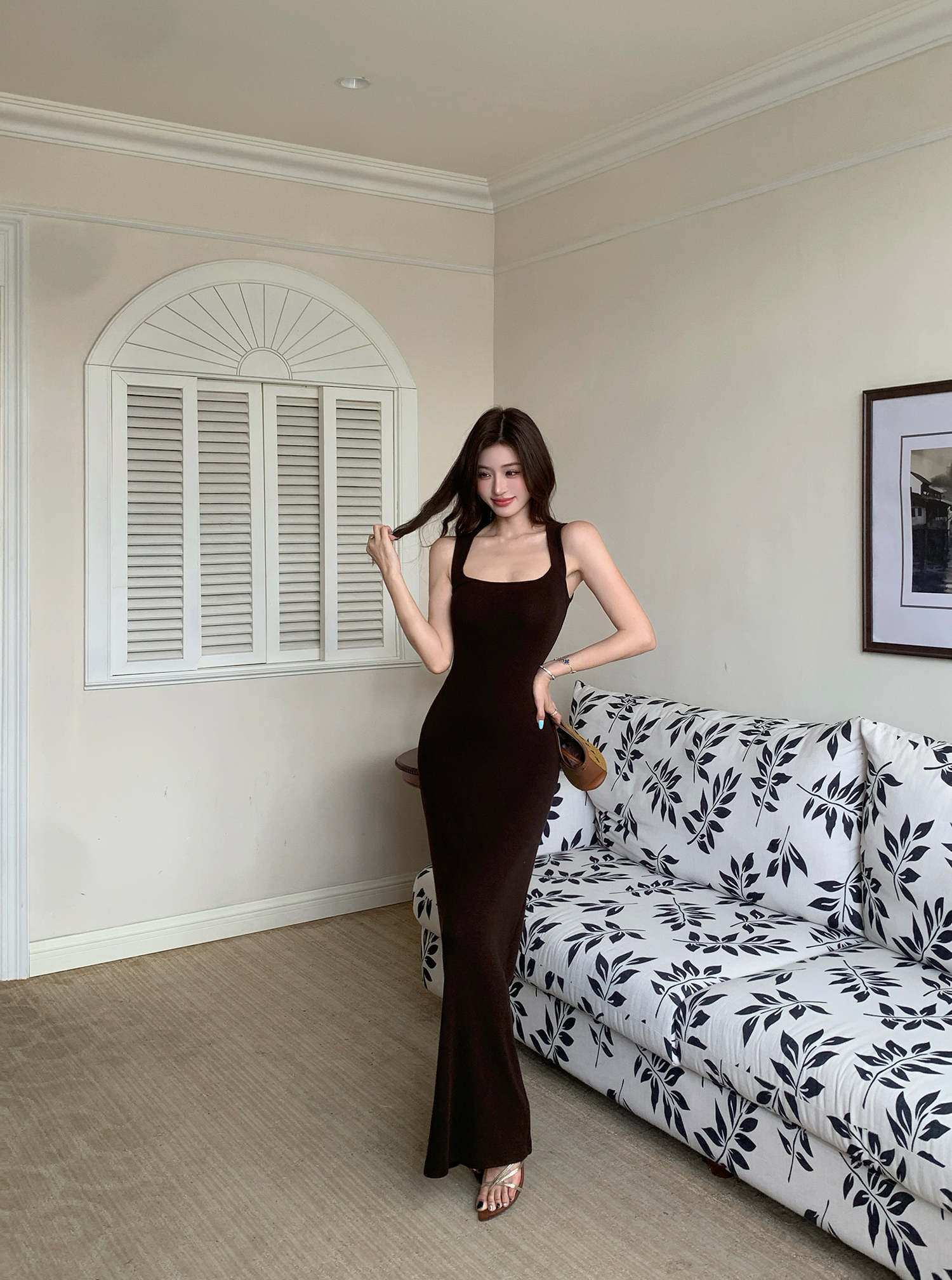 빛 럭셔리 바람 민소매 허리 수축 여성 드레스 트임 슬림해 보이는 디자인 센스 치마