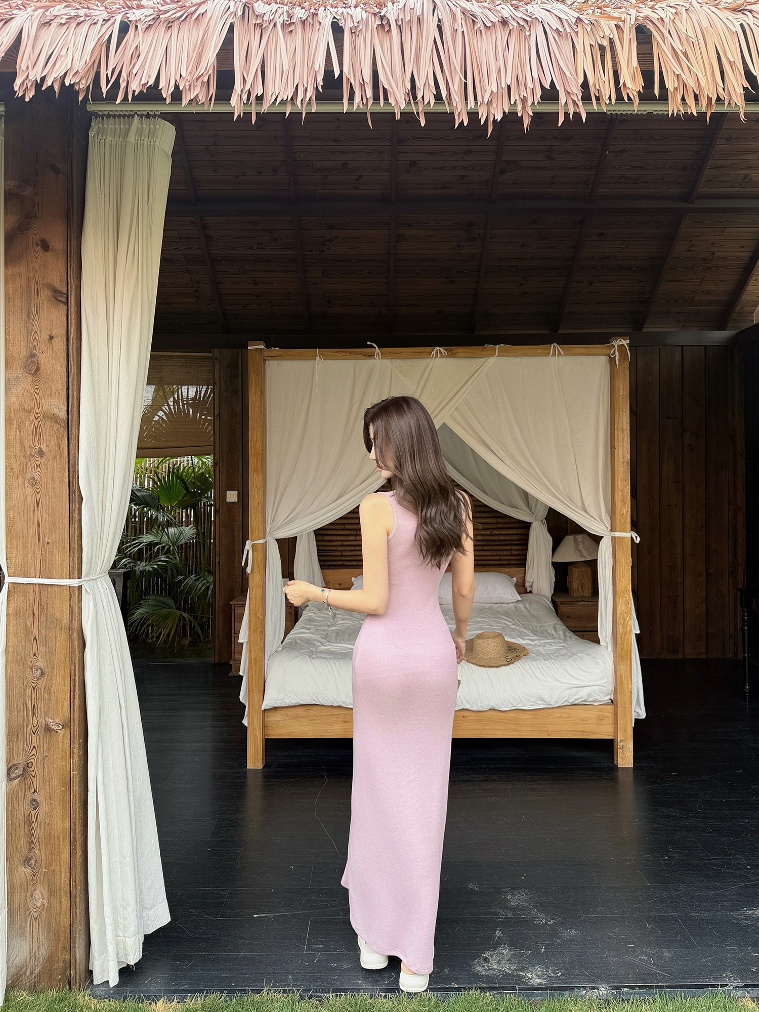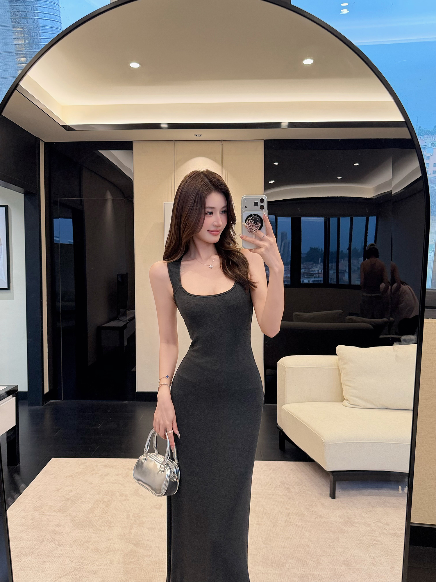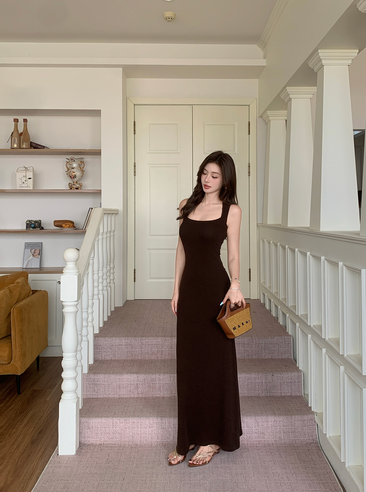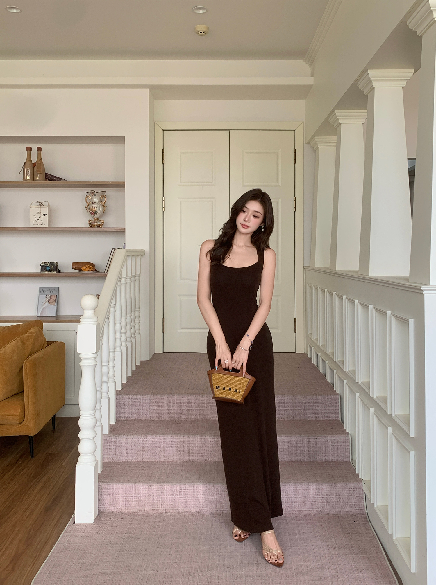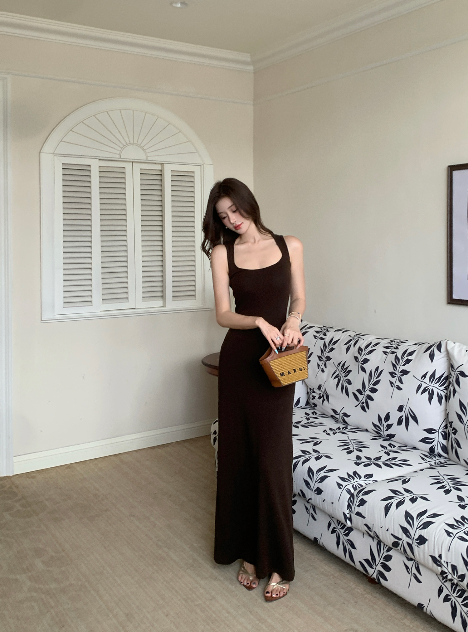 빛 럭셔리 바람 민소매 허리 수축 여성 드레스 트임 슬림해 보이는 디자인 센스 치마