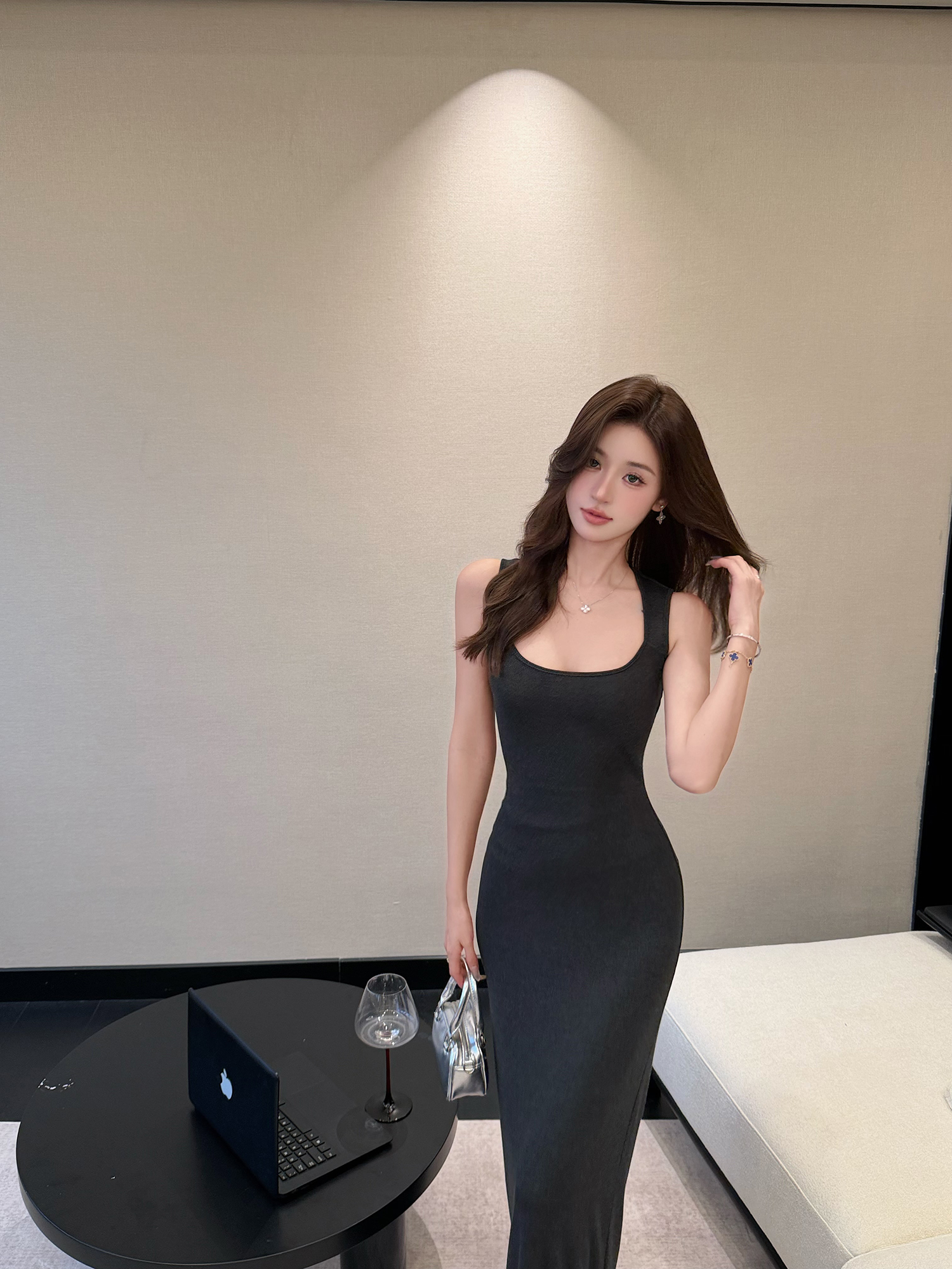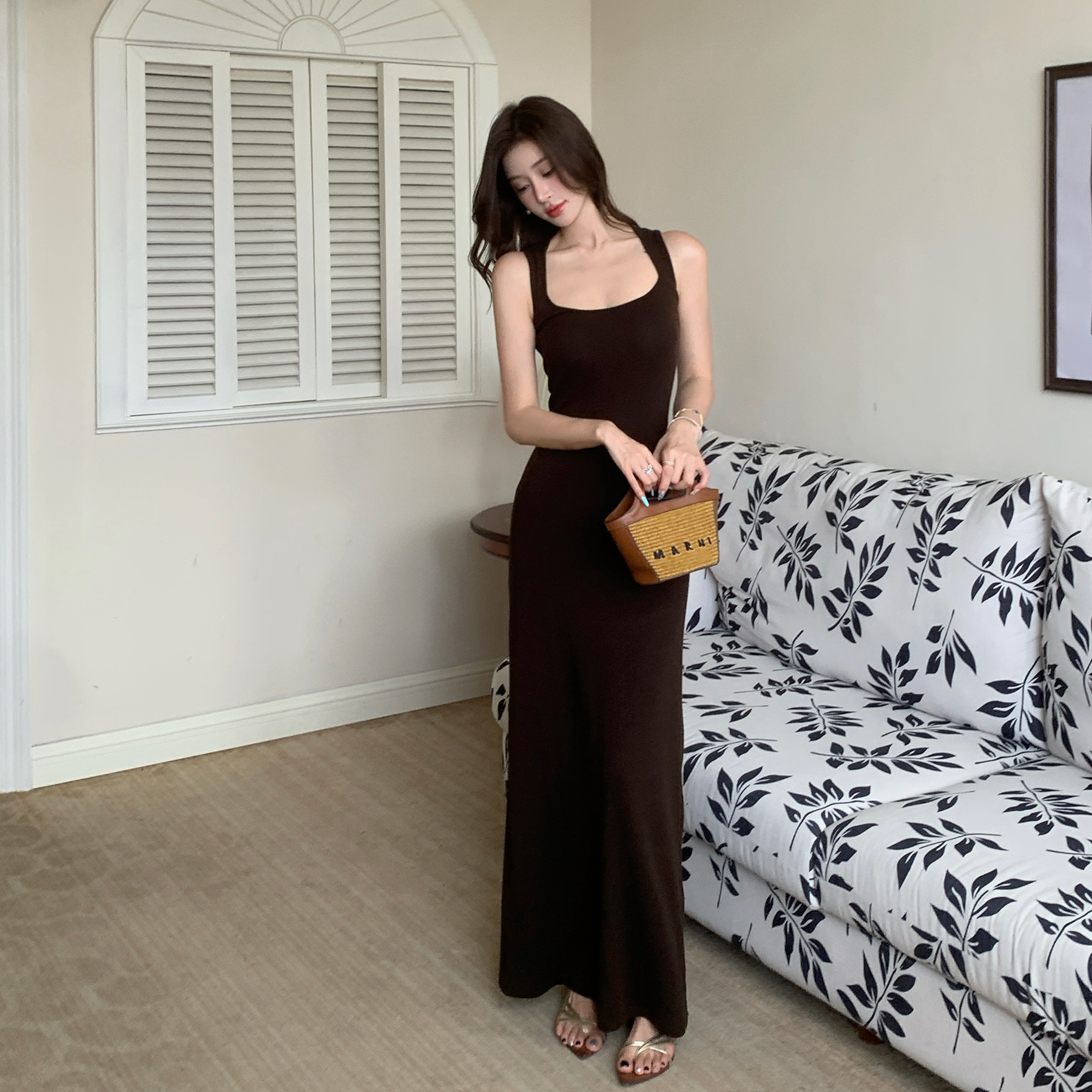 여름 새로운 연필 치마 매듭 켄 콩 미니멀리즘 센스 품격 비틀림 민소매 드레스 허리 수축 트임 롱 스커트