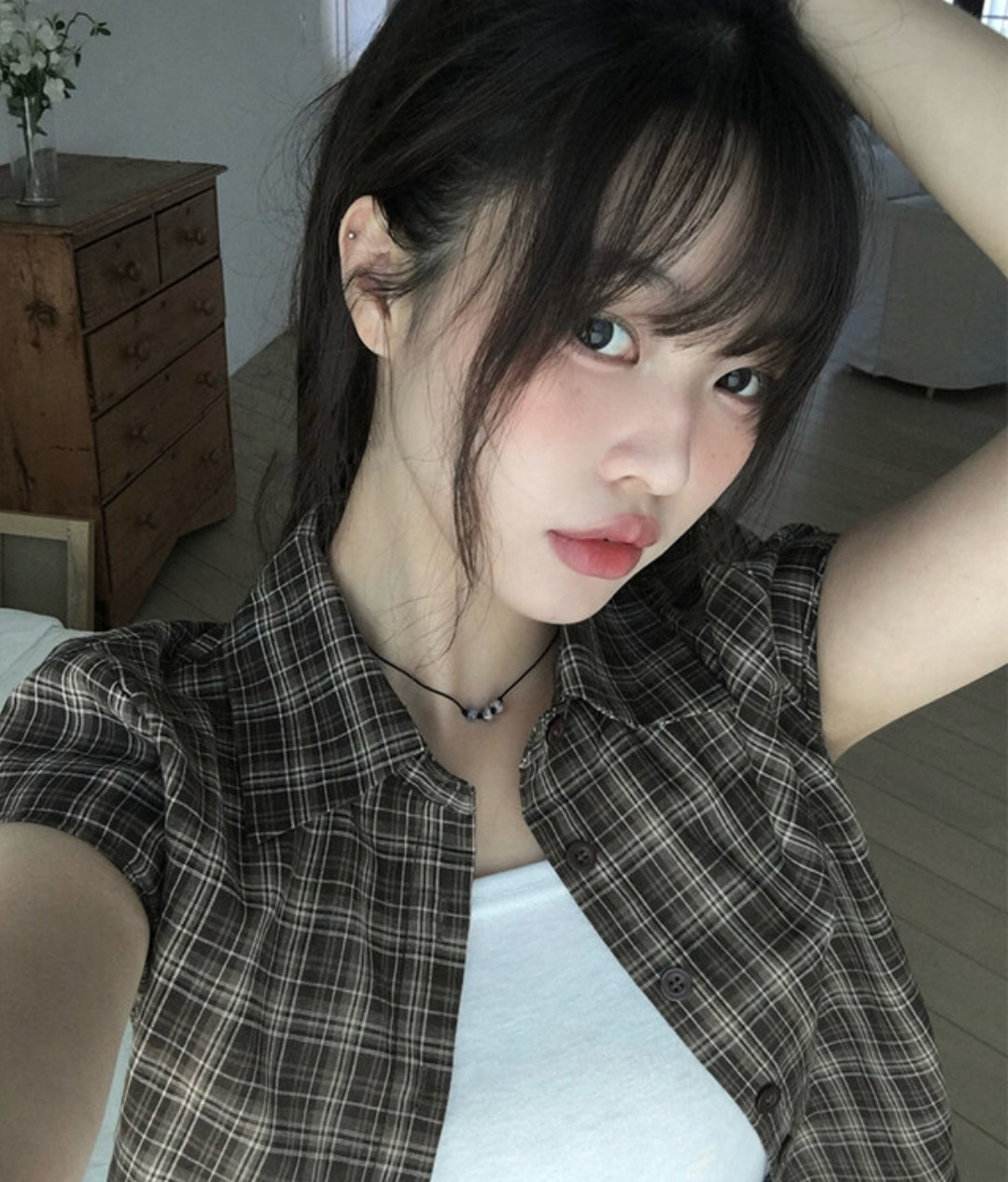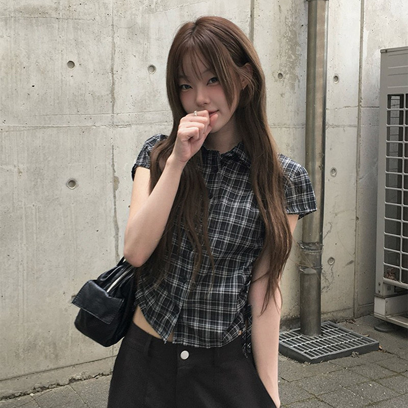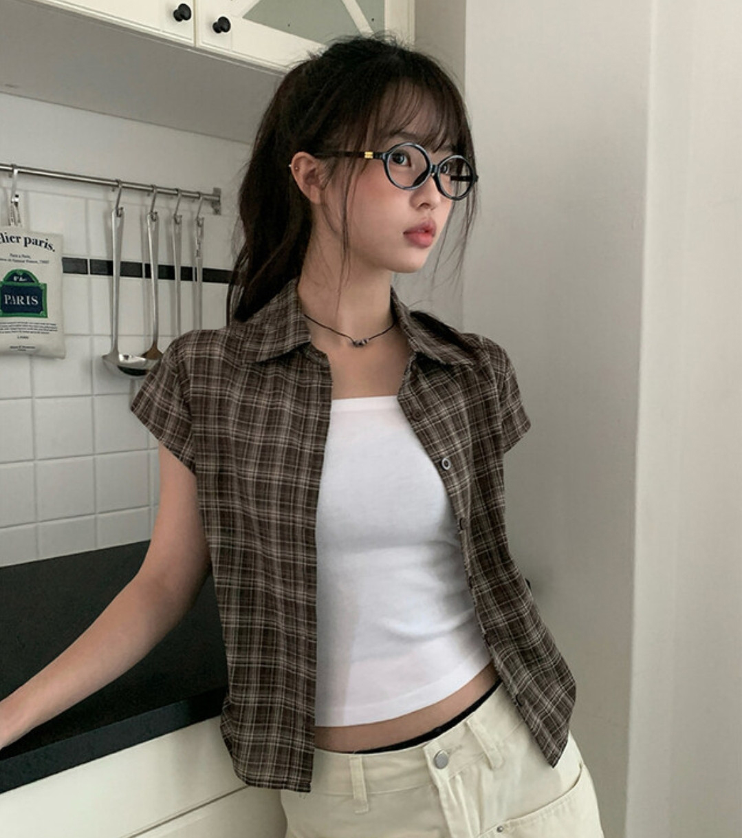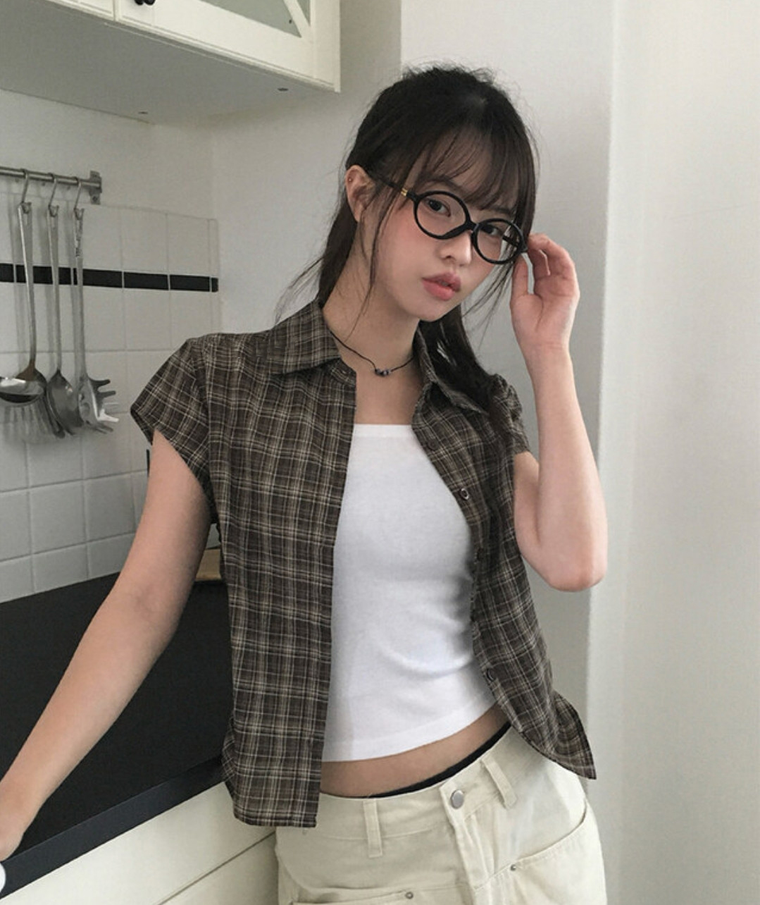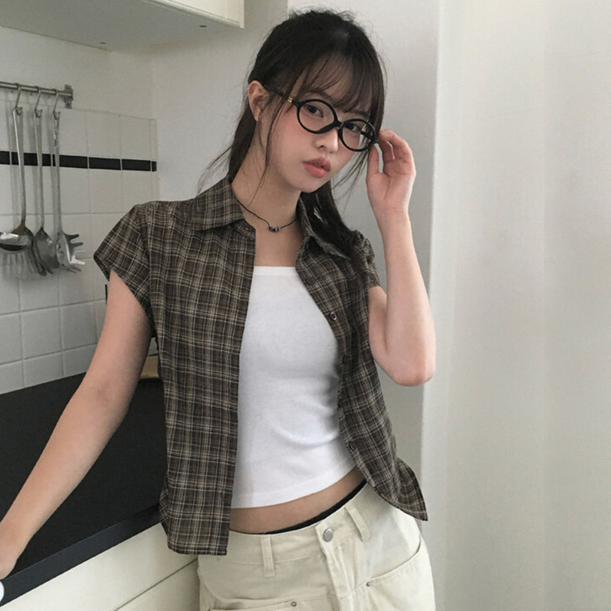 ins 보 주님 섹션 프랑스식 레트로 체크무늬 품격 다용도 민소매 맨위 쇼트 스타일 작은 셔츠