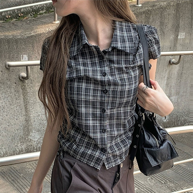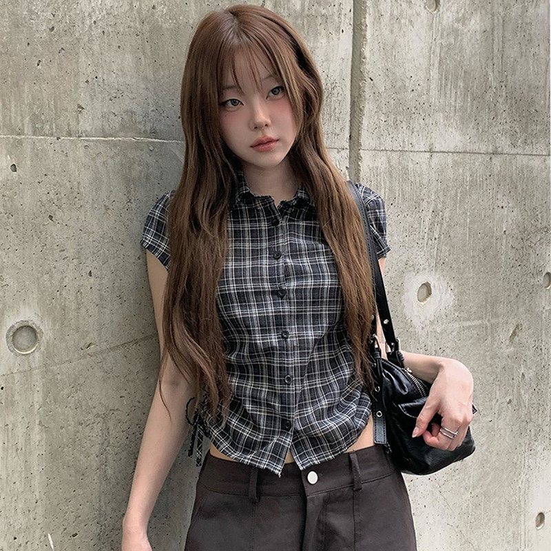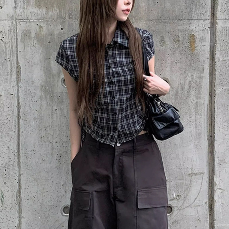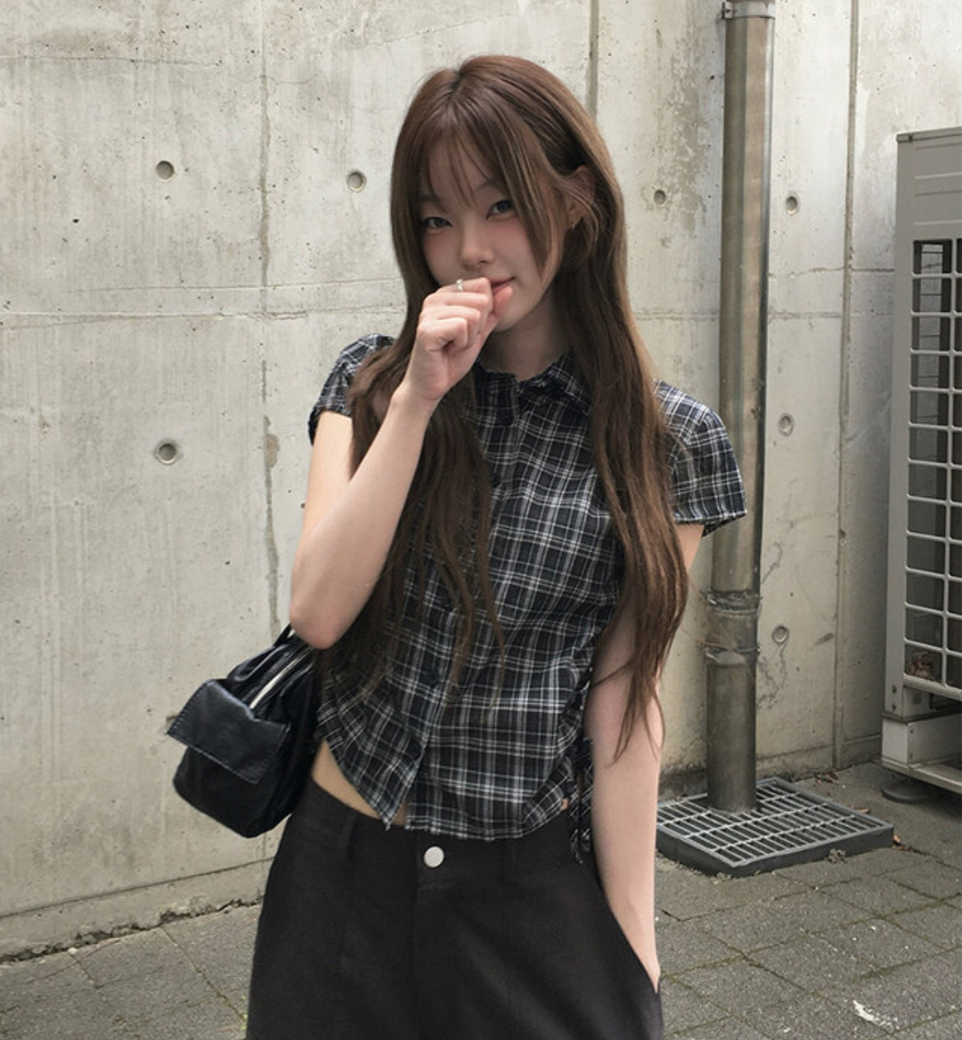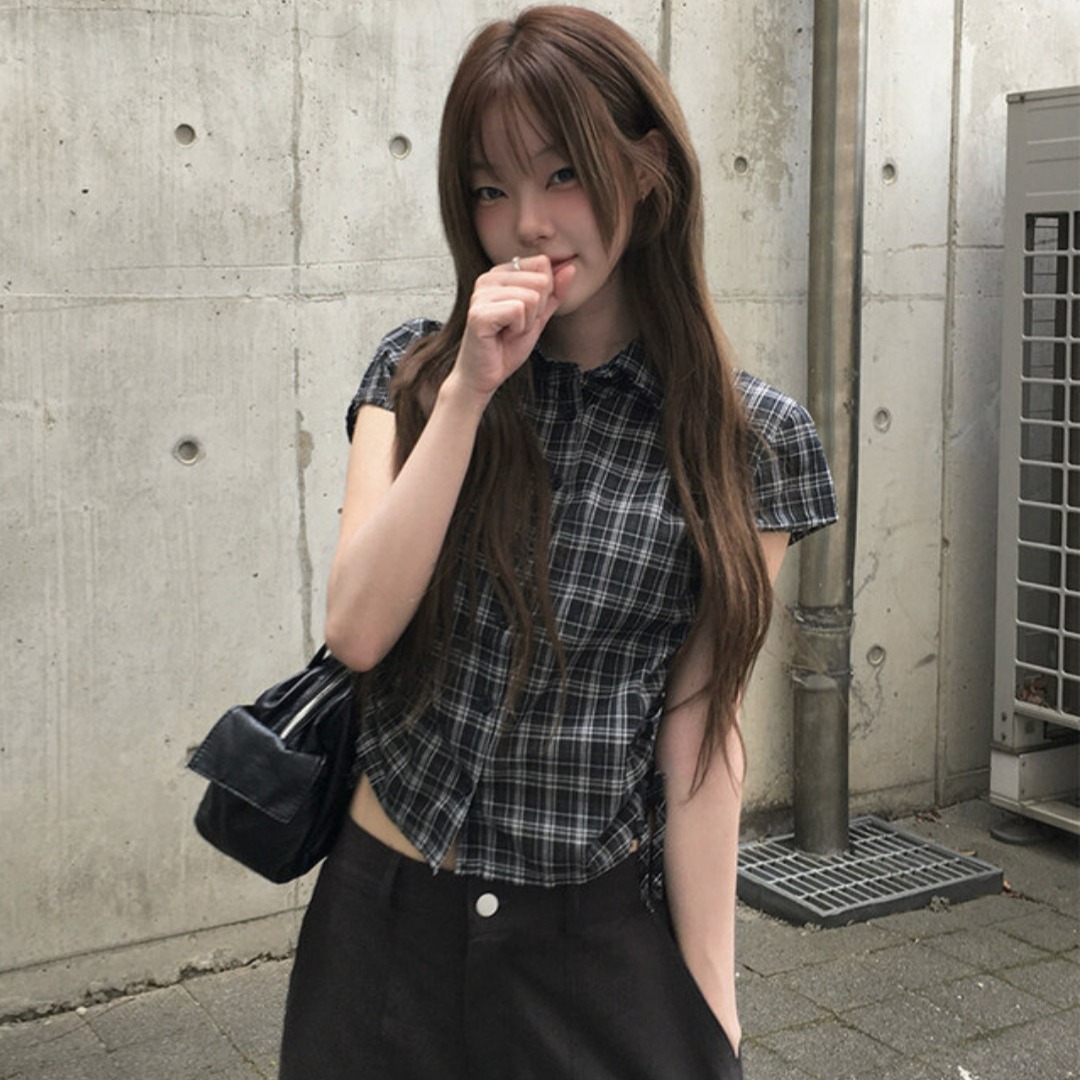 ins 보 주님 섹션 프랑스식 레트로 체크무늬 품격 다용도 민소매 맨위 쇼트 스타일 작은 셔츠