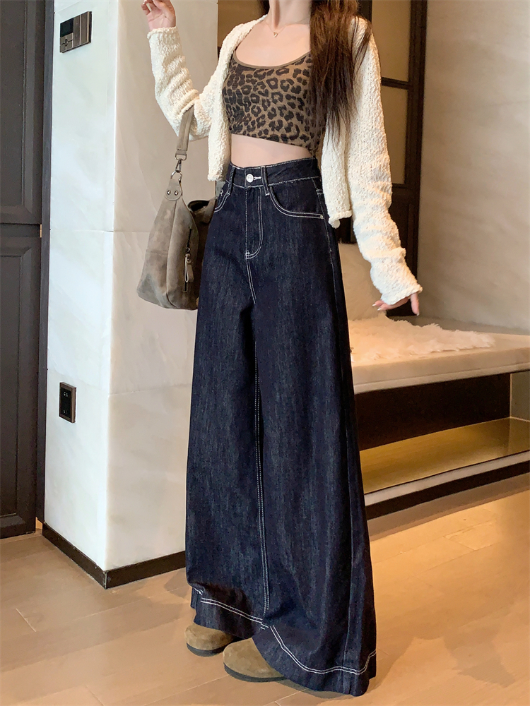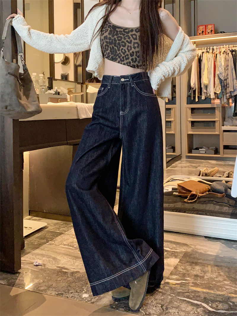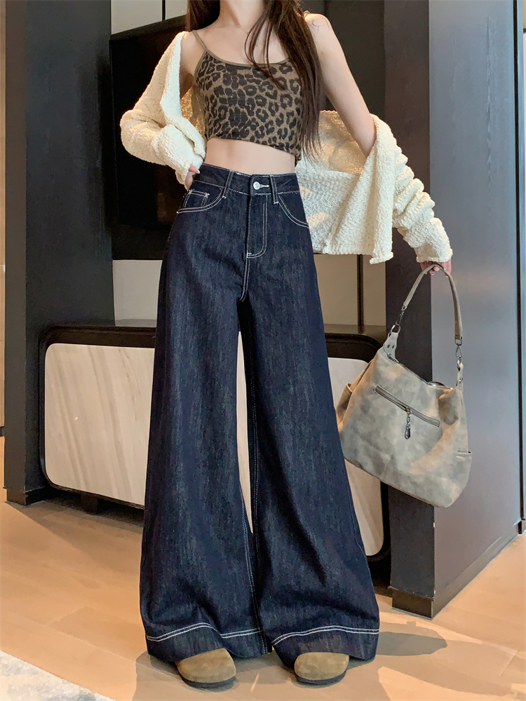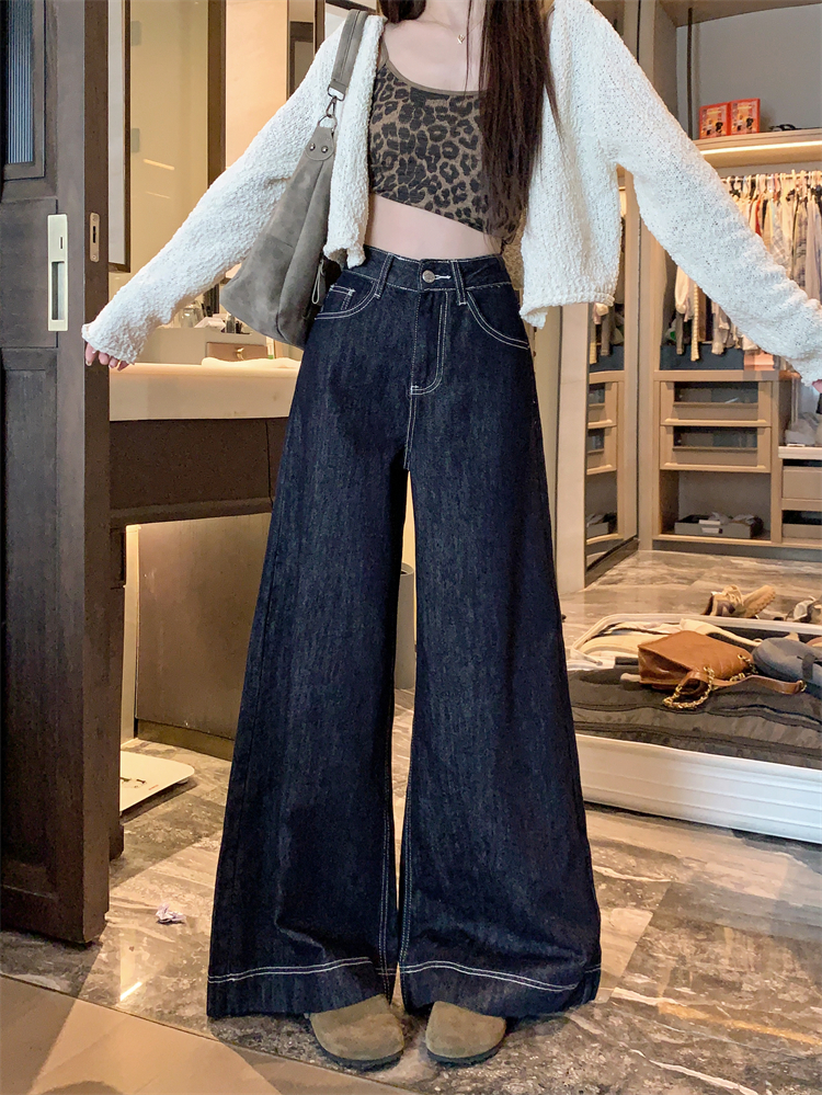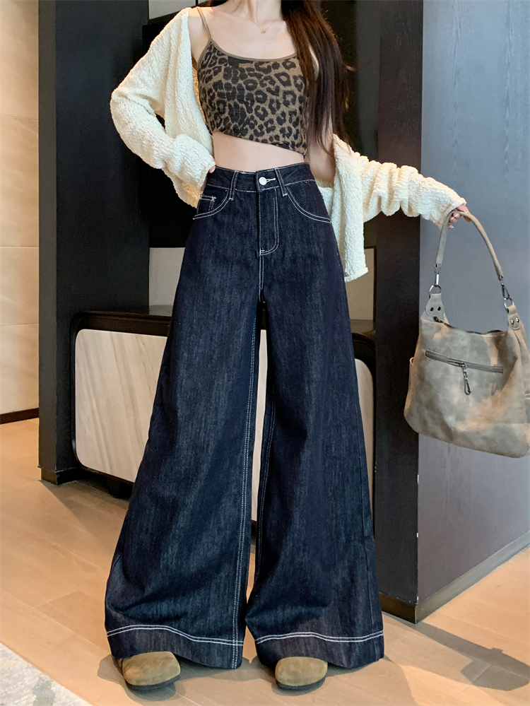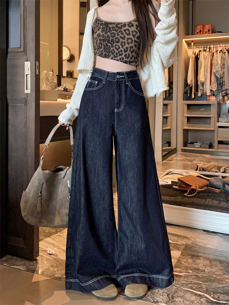 실사 새로운 빅 사이즈 여성 의류 아메리칸 레트로 루즈핏 대 나팔 청바지 핫걸 넓은 다리 스트레이트 바닥 청소 바지