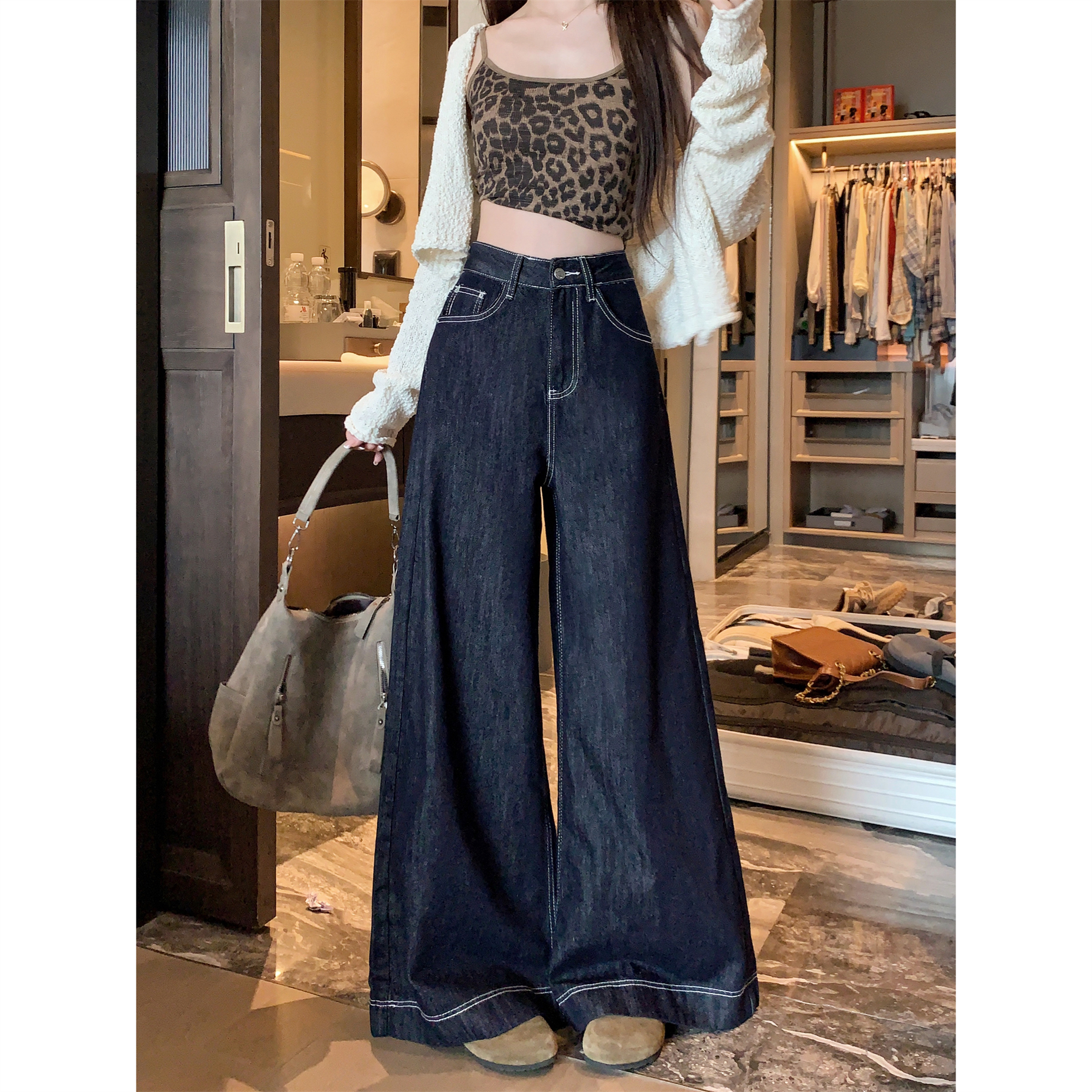 실사 새로운 빅 사이즈 레트로 작은 심장 기계 주머니 디자인 넓은 다리 청바지 루즈핏 스트레이트 나팔 바닥 청소 바지