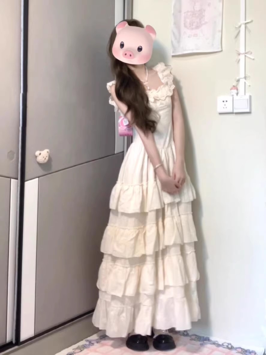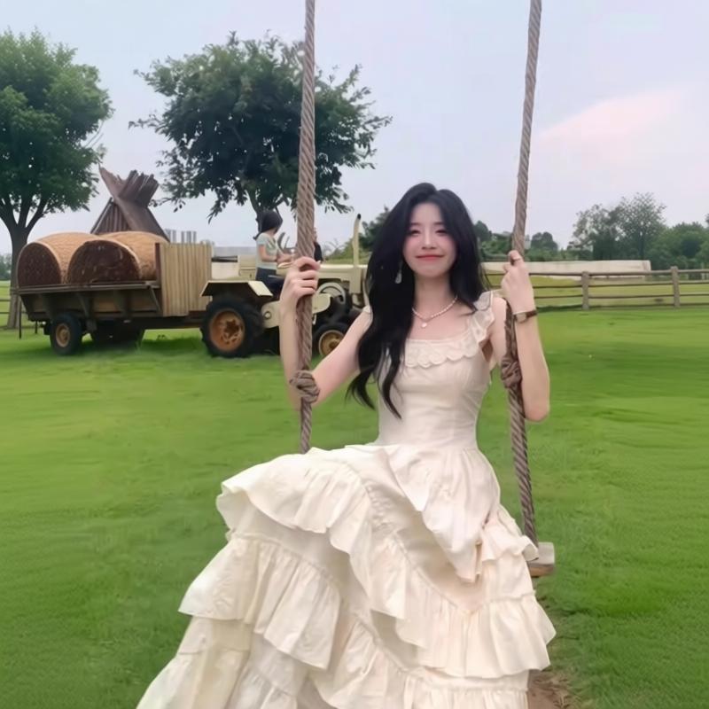 초기 꿈 pokemeng 정향 재스민 자카드 프랑스식 거품 소매 허리 수축 드레스 롱 스커트 A라인 스커트 여성 여름