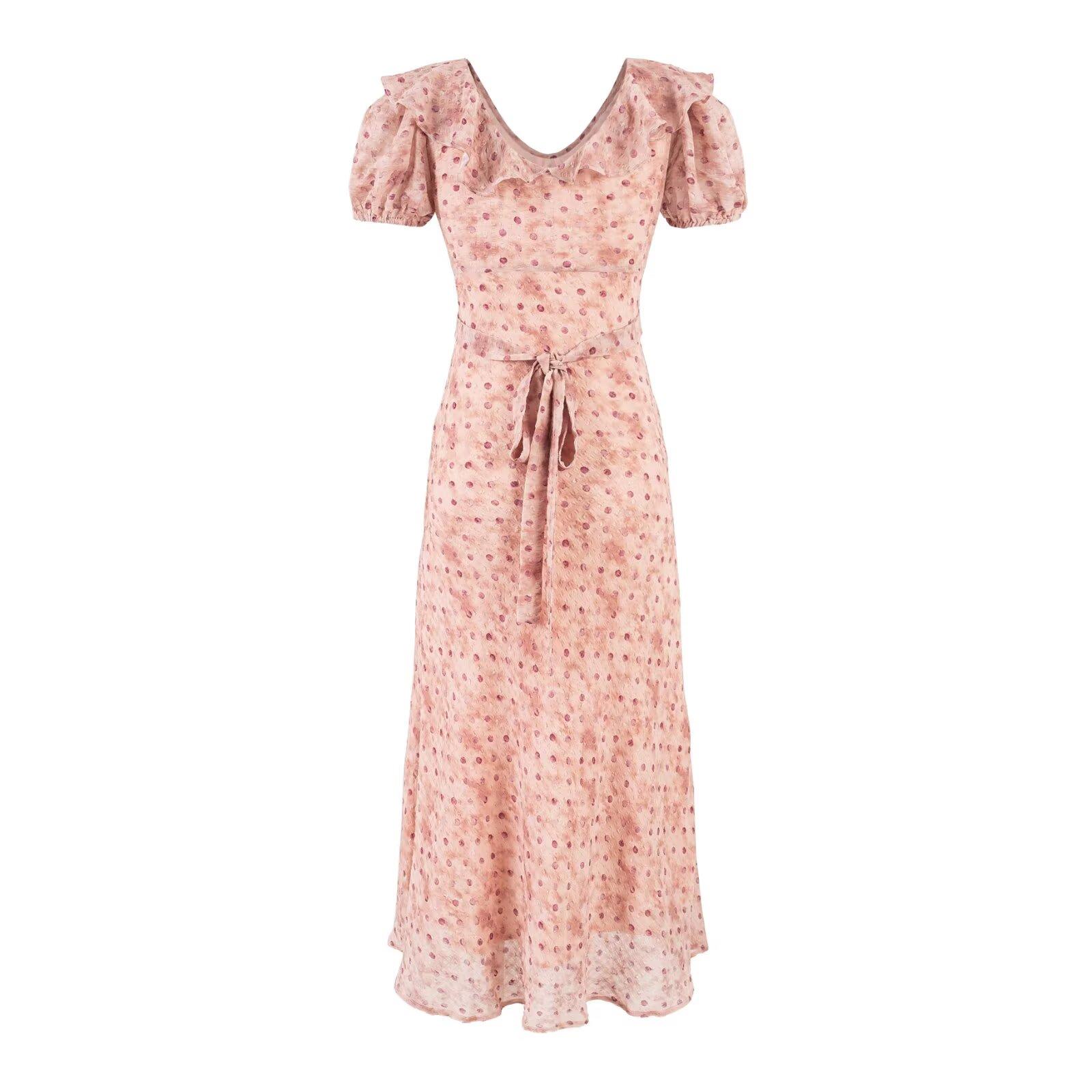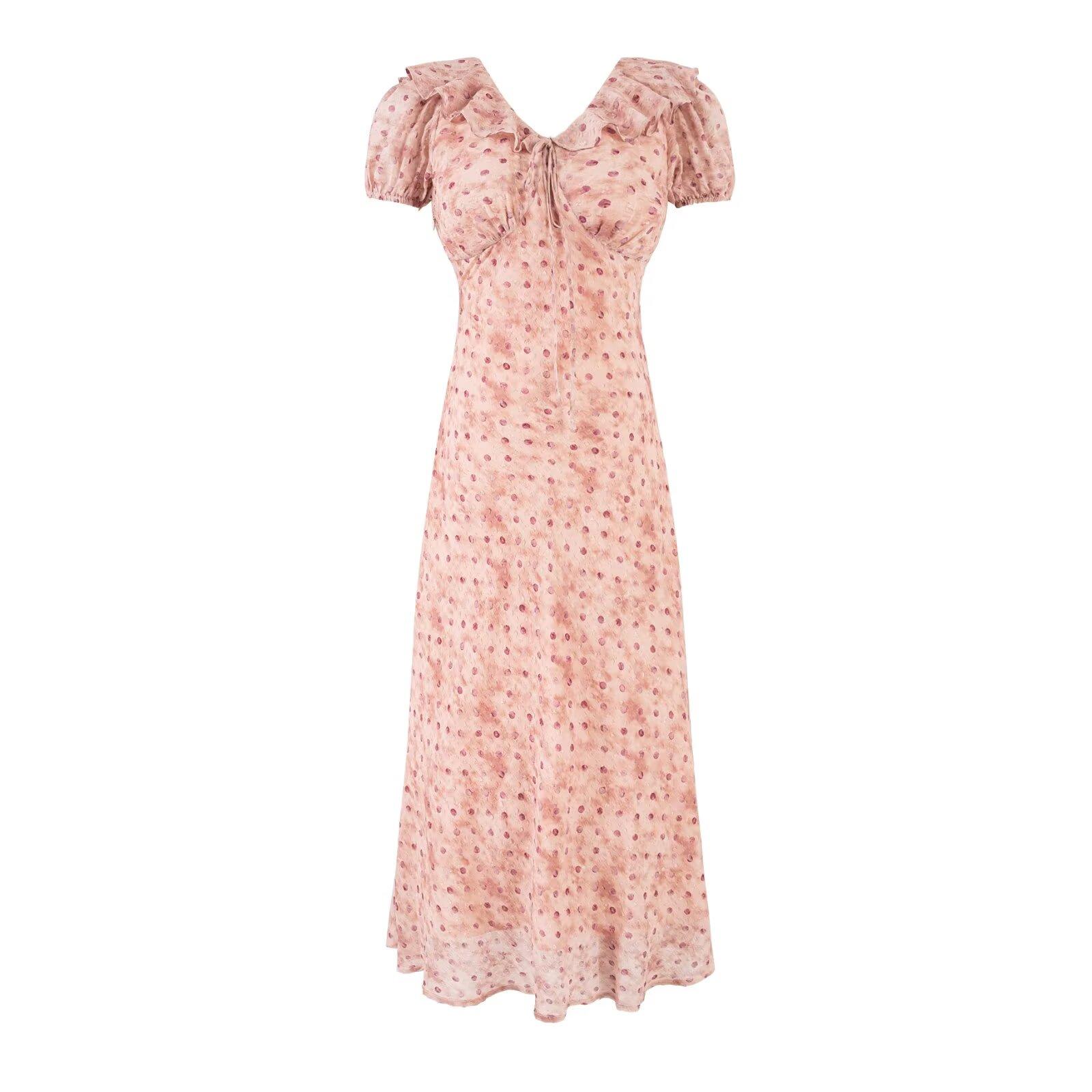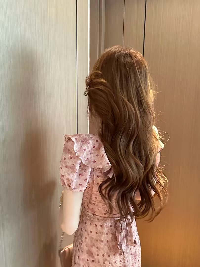 빅 사이즈 프랑스식 품격 허리 수축 슬림해 보이는 홀치기 염색 핑크색 도트 무늬 중간 길이 원 웨이 프릴 드레스 길다 치마