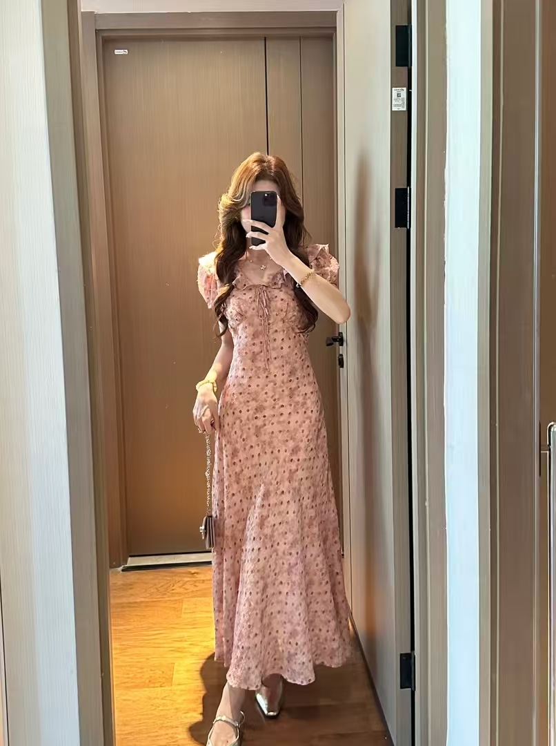 빅 사이즈 여름 켜기 새로운 프랑스식 분말 리플 깨진 부드러운 부드러운 바람 꽃무늬 허리 수축 슬림해 보이는 반팔 드레스