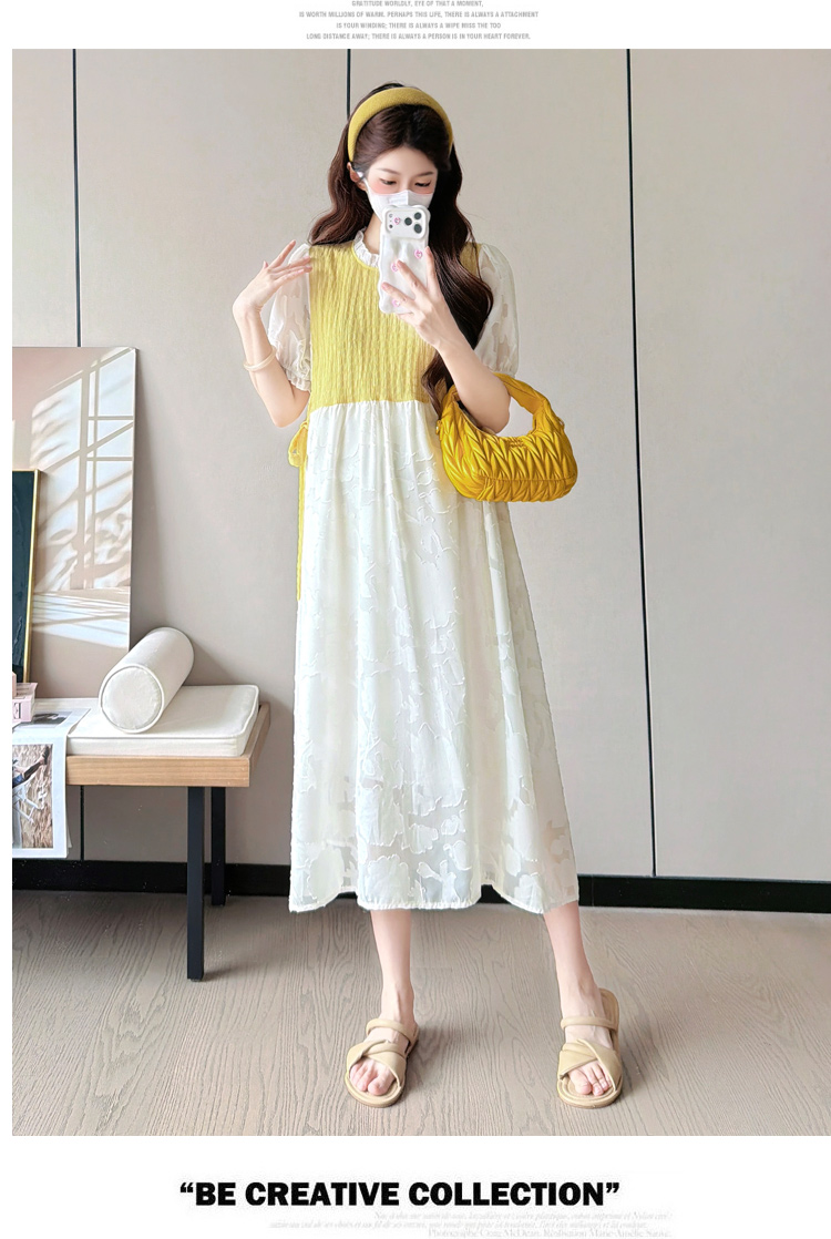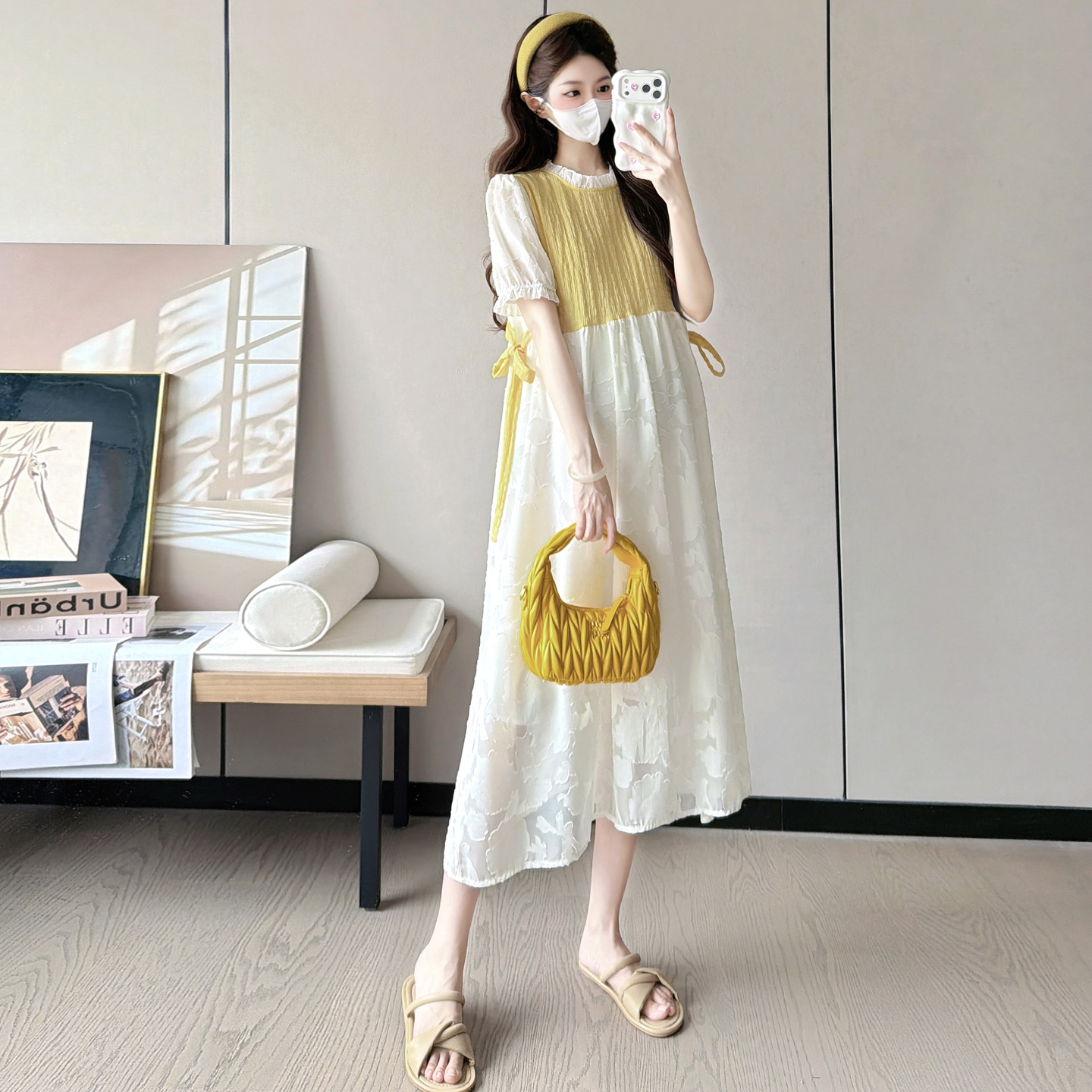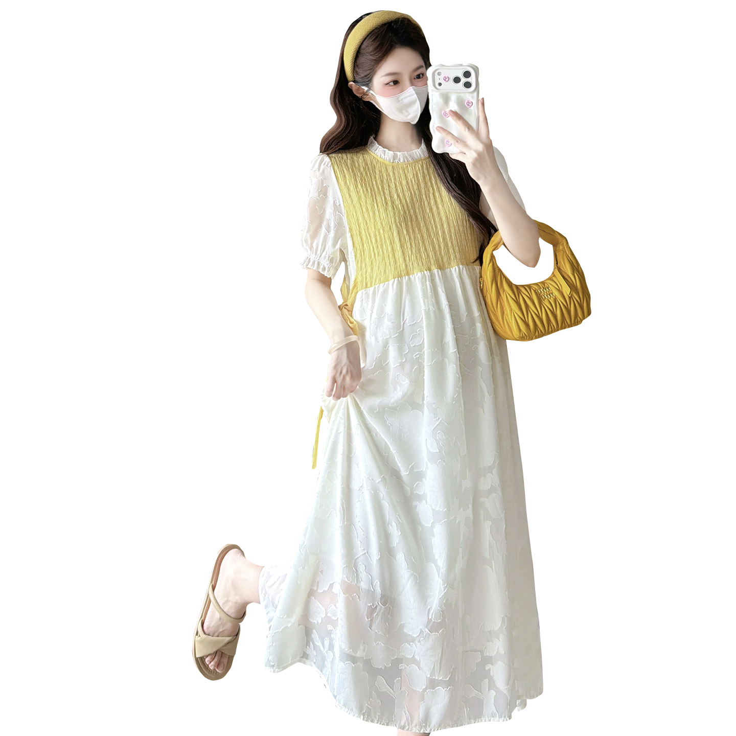 실사 2026 출산 착용 여름 새로운 체크무늬 패치워크 레이스 루즈핏 슬림해 보이는 임산부 드레스