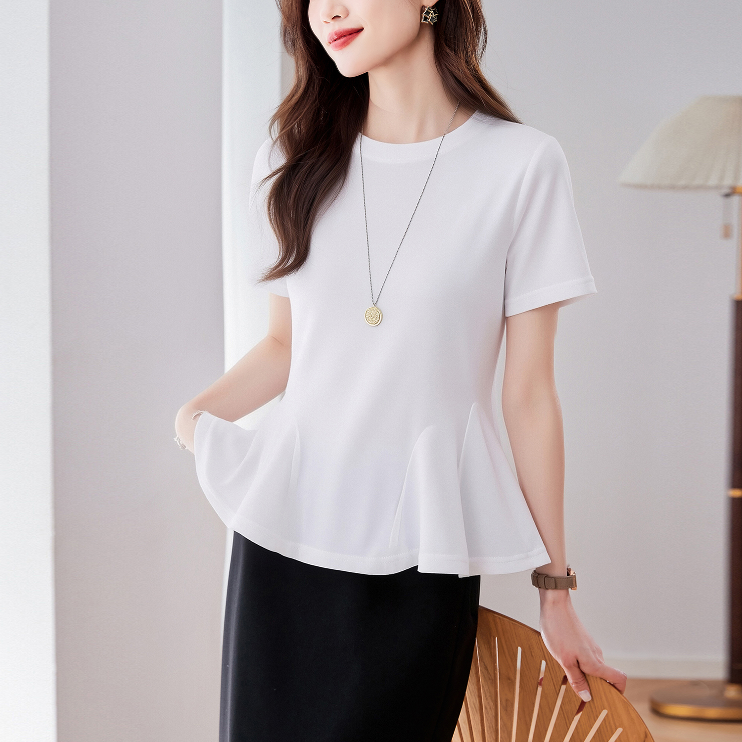 실사 여름 신제품 빛 럭셔리 외국 가스 라운드 넥 티셔츠 여성 2026 여름 새로운 여성용 짧은 소매 맨위 슬림해 보이는 작은 셔츠