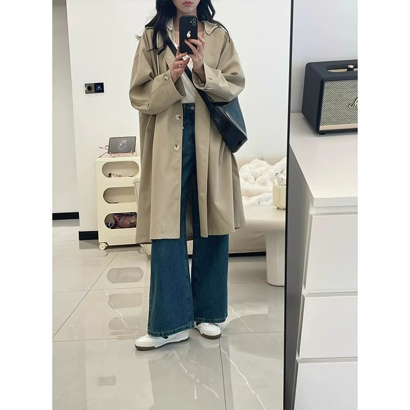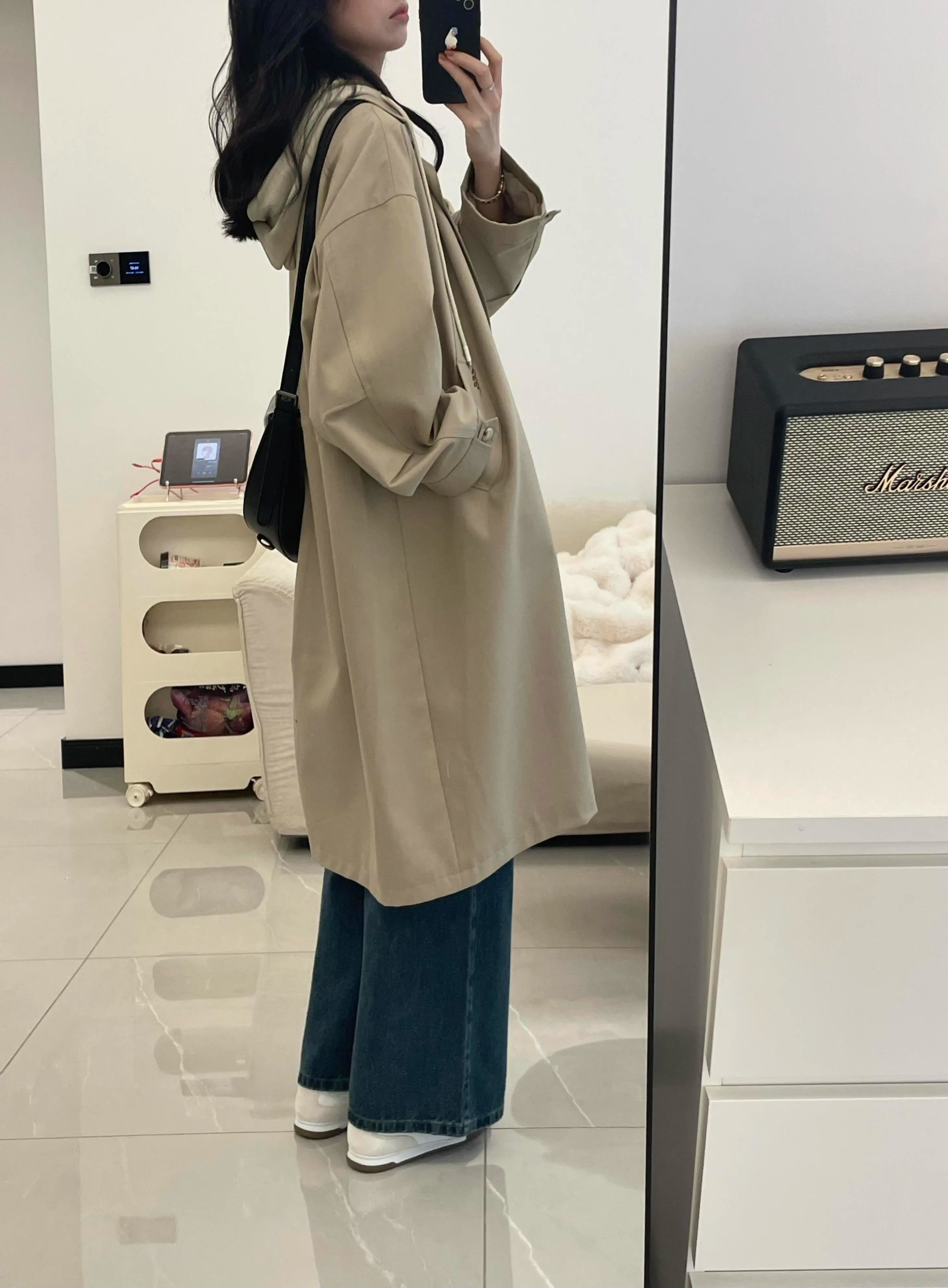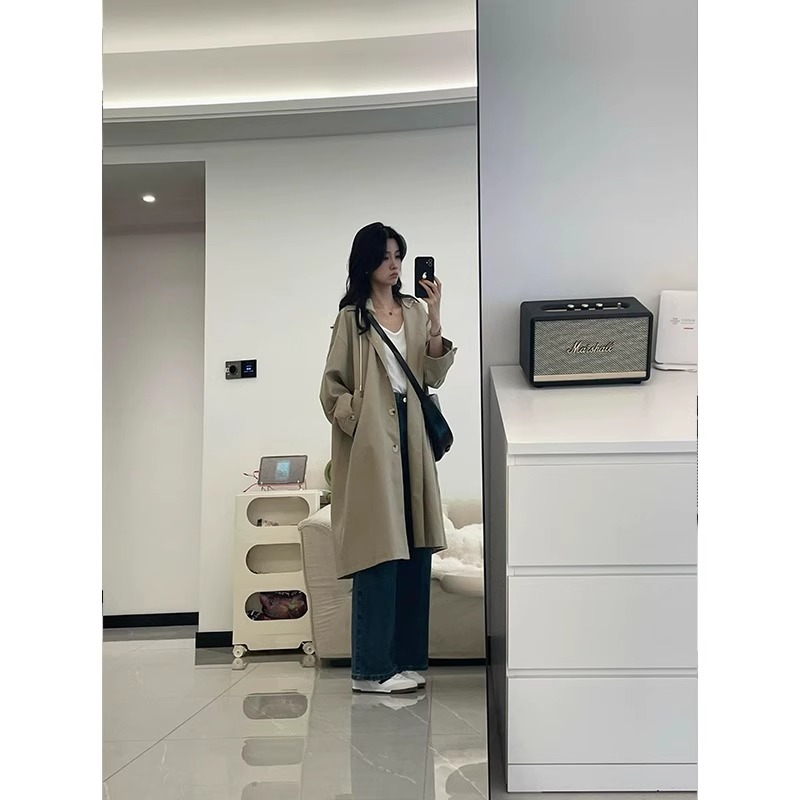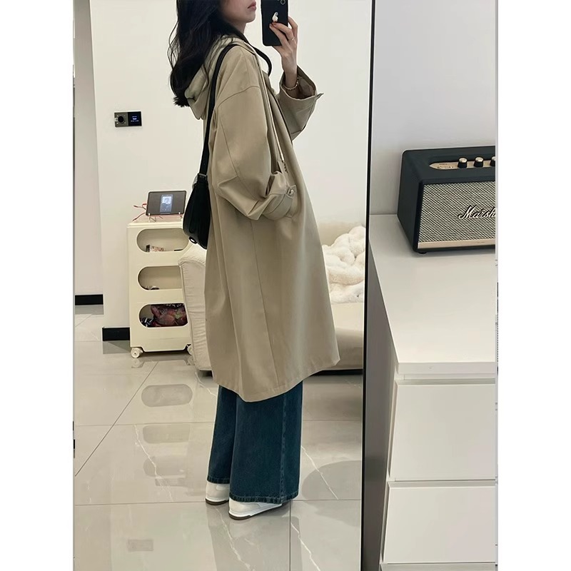카키 색 중간 길이 후드 바람막이 여성 코트 봄 드레스 빅 사이즈 지방 mm 고급 루즈핏 다용도 영국식 바람 코트