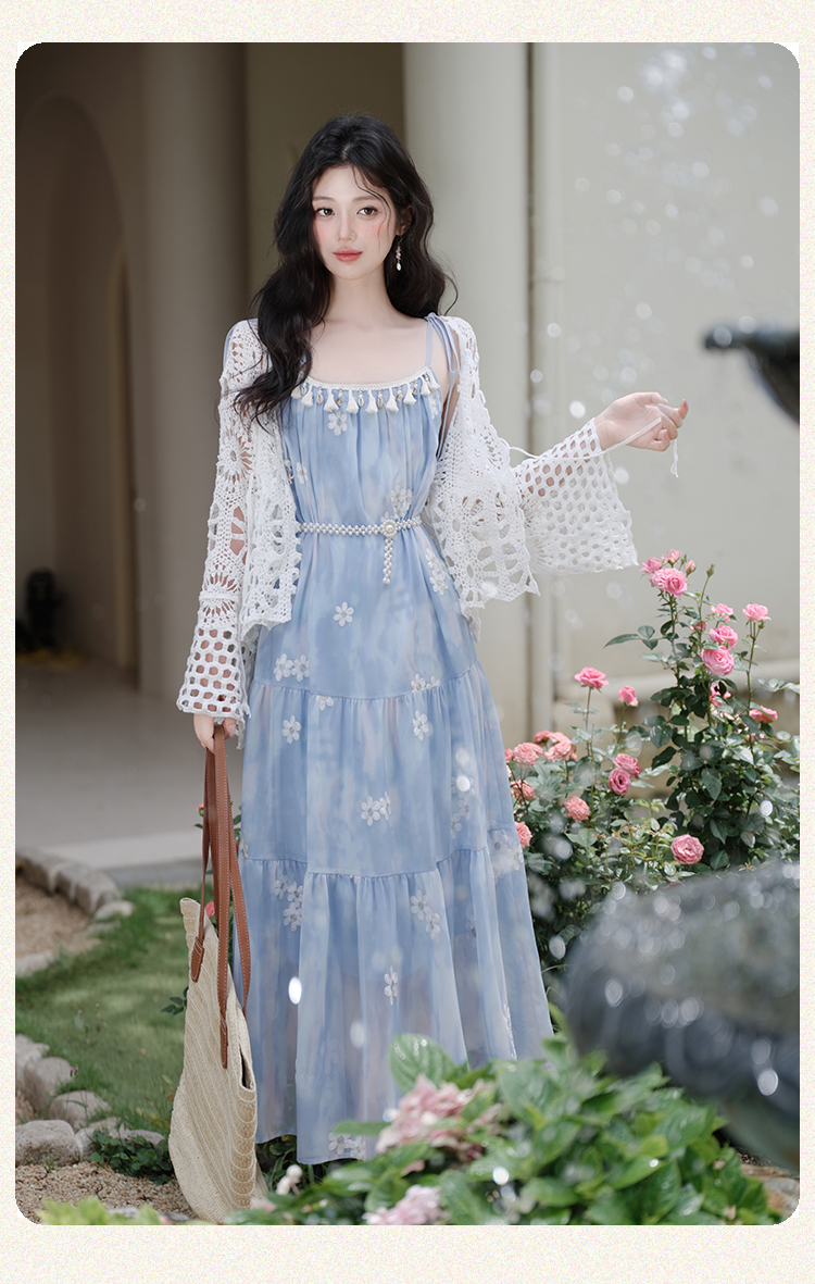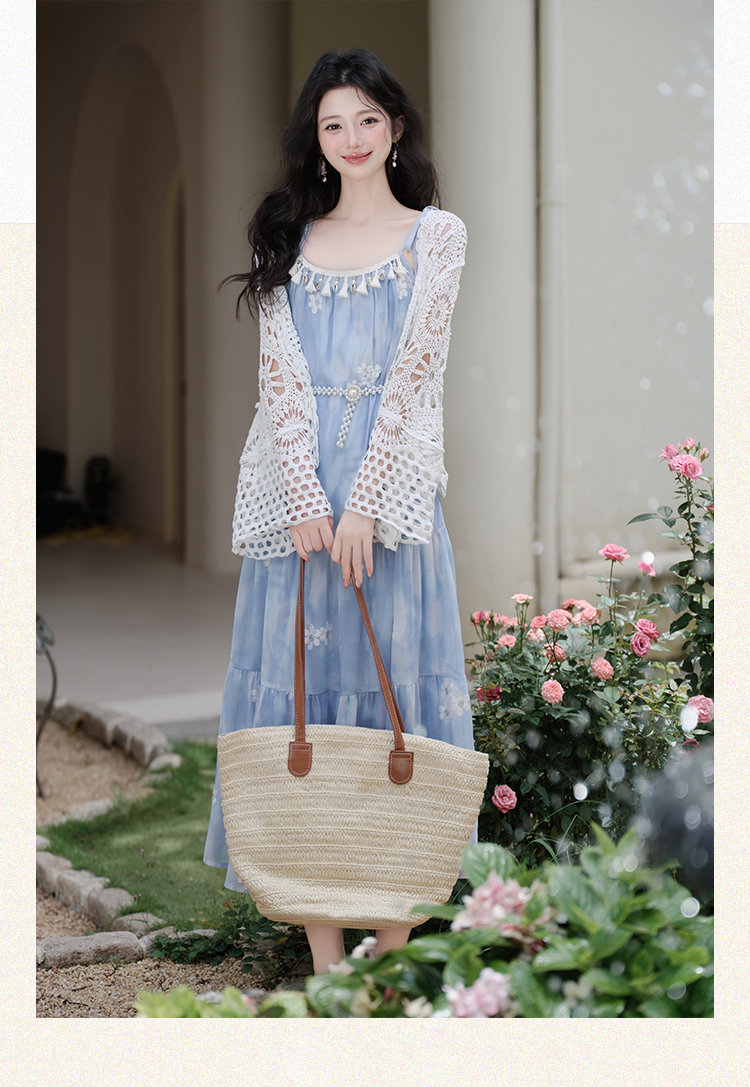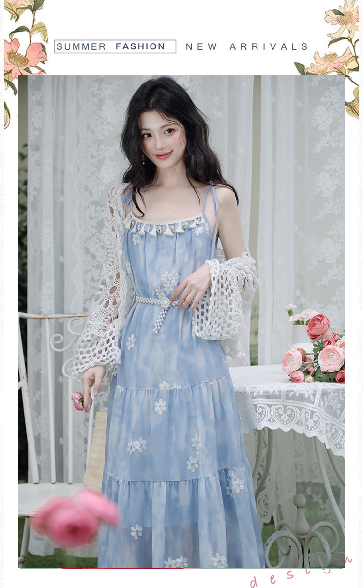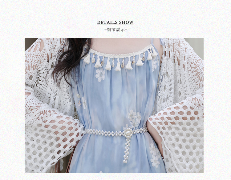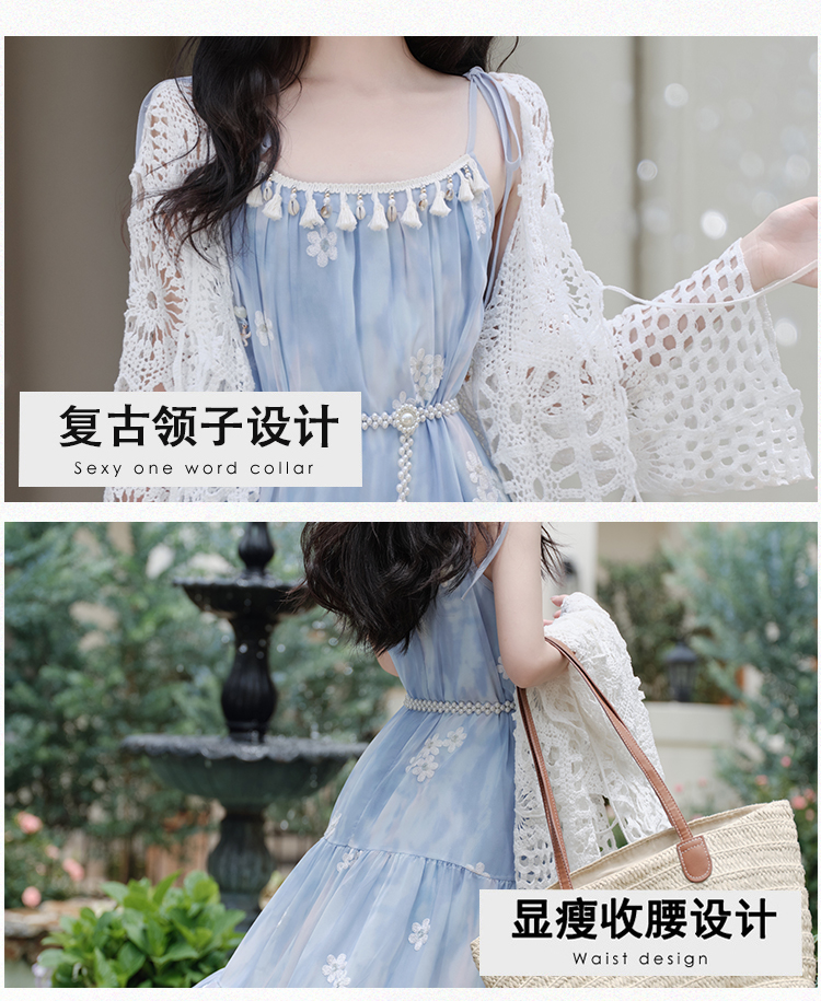 언어 그리스어 진짜 사진 찍기 새로운 작은 청신 슬립 꽃 치마 코디 자외선 차단 재킷 투피스 세트 세트 드레스