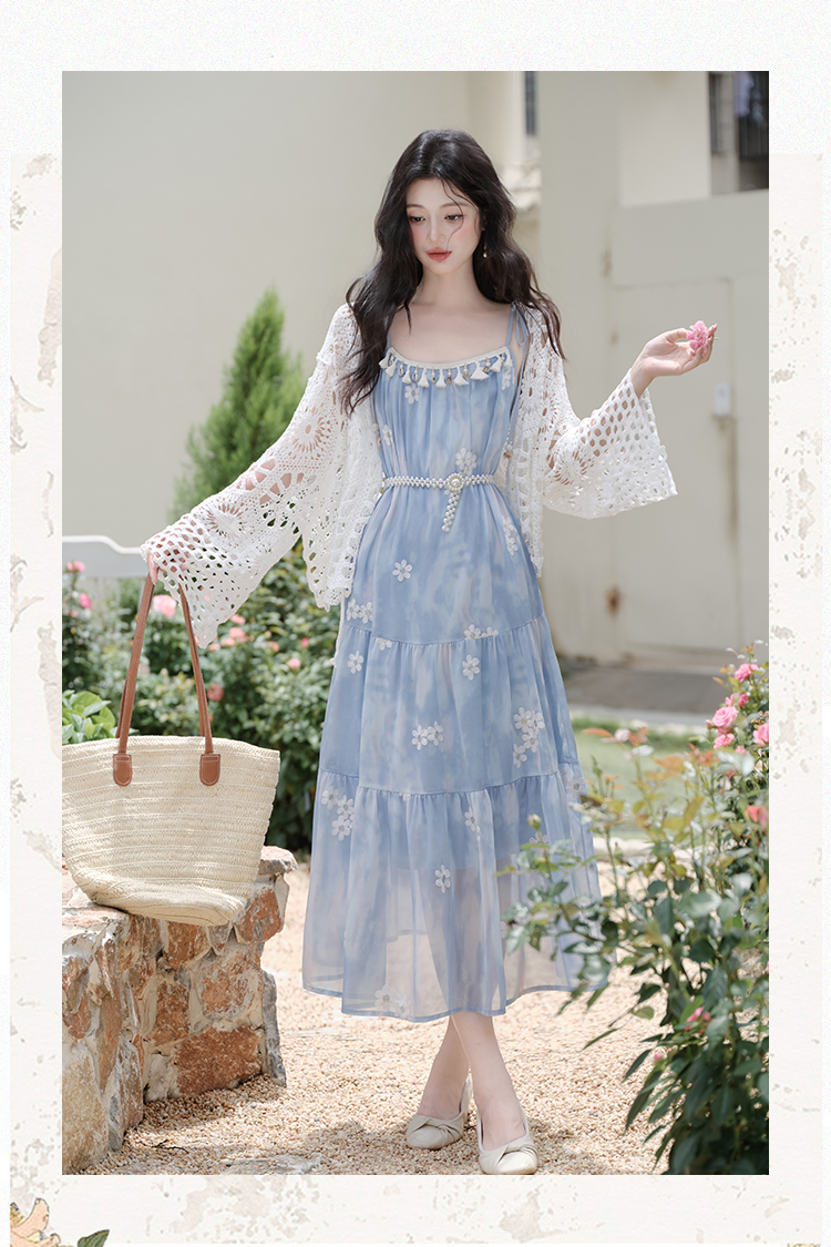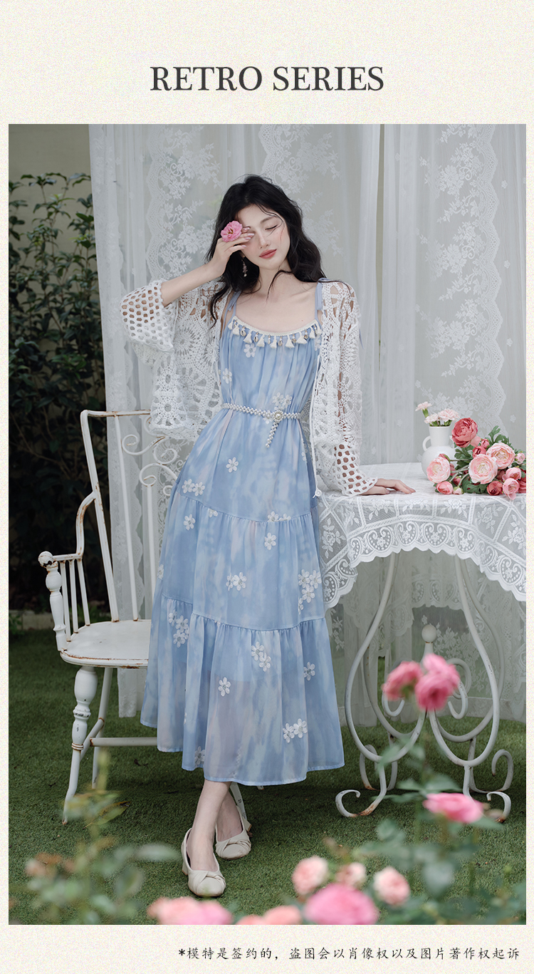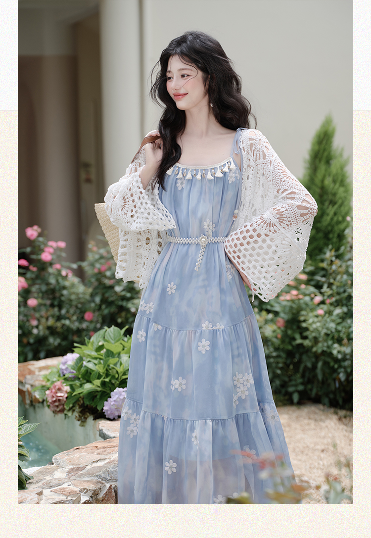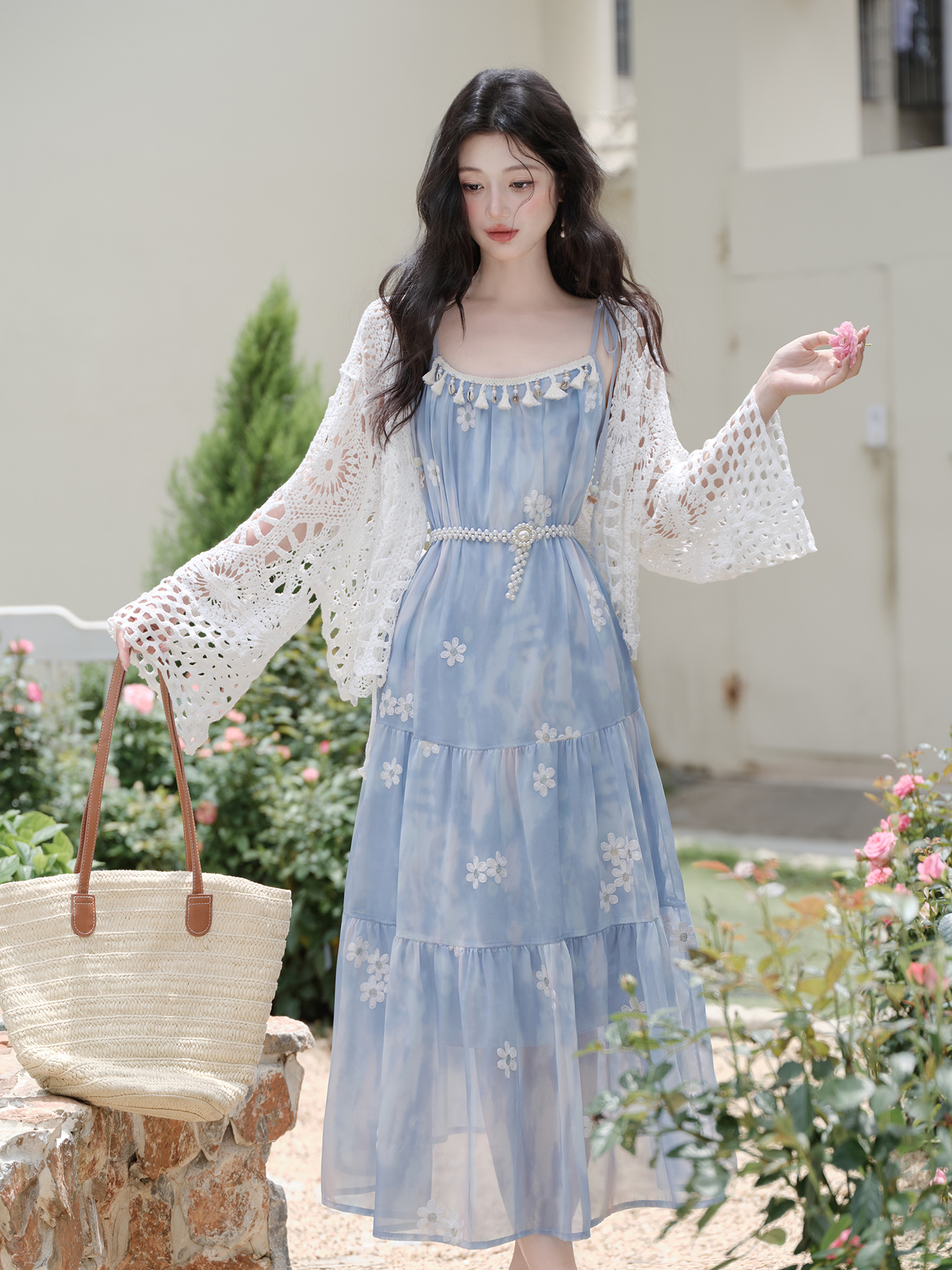 언어 그리스어 진짜 사진 찍기 새로운 작은 청신 슬립 꽃 치마 코디 자외선 차단 재킷 투피스 세트 세트 드레스