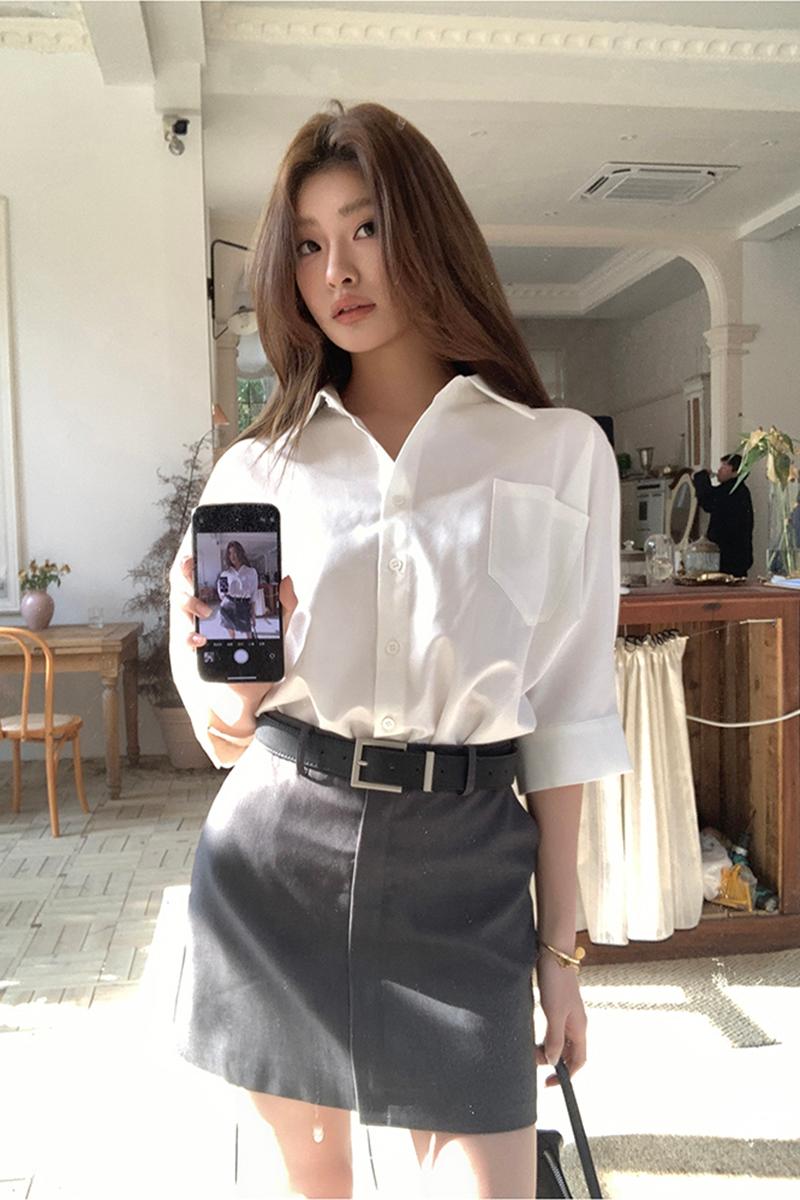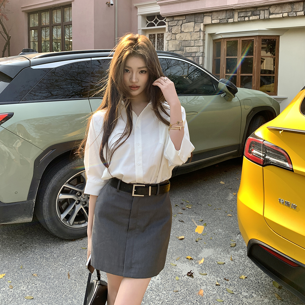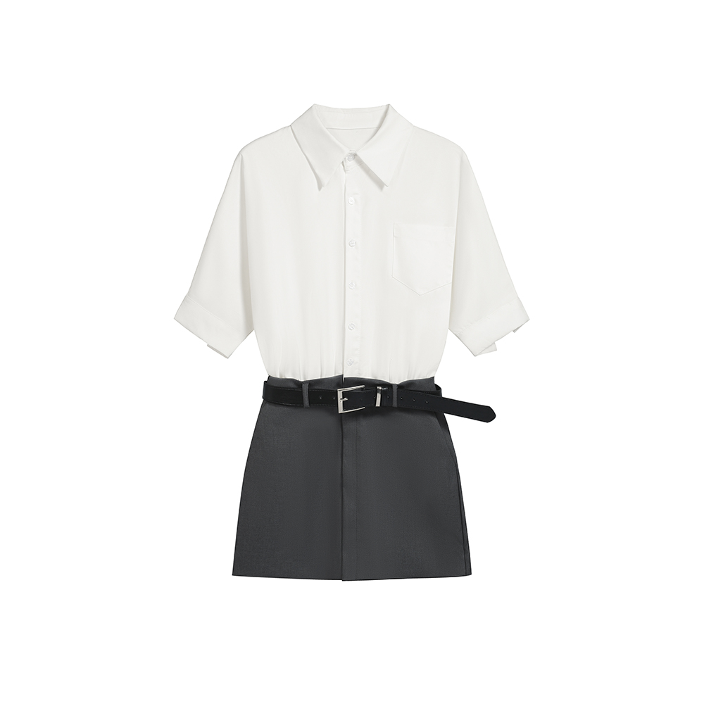 실사 2026 봄 여름 새로운 디자인 센스 배색 패치워크 품격 패션 셔츠 여성 드레스 허리 수축 짧은 치마