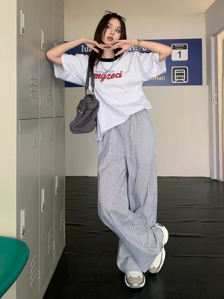 아메리칸 느긋한 스트라이프 와이드 레깅스 바지 26 봄 여름 새로운 밴딩 하이웨이스트 루즈핏 스트레이트 캐주얼 바닥 청소 플러스 긴 바지