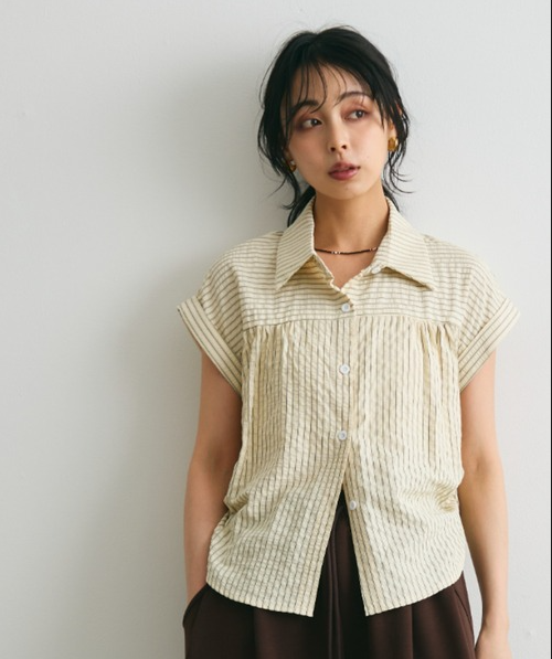 일본식 질감 센스 세로 줄무늬 여성 셔츠 루즈핏 슬림해 보이는 주름 폴로 칼라 반팔 여름 얇은 스타일 셔츠