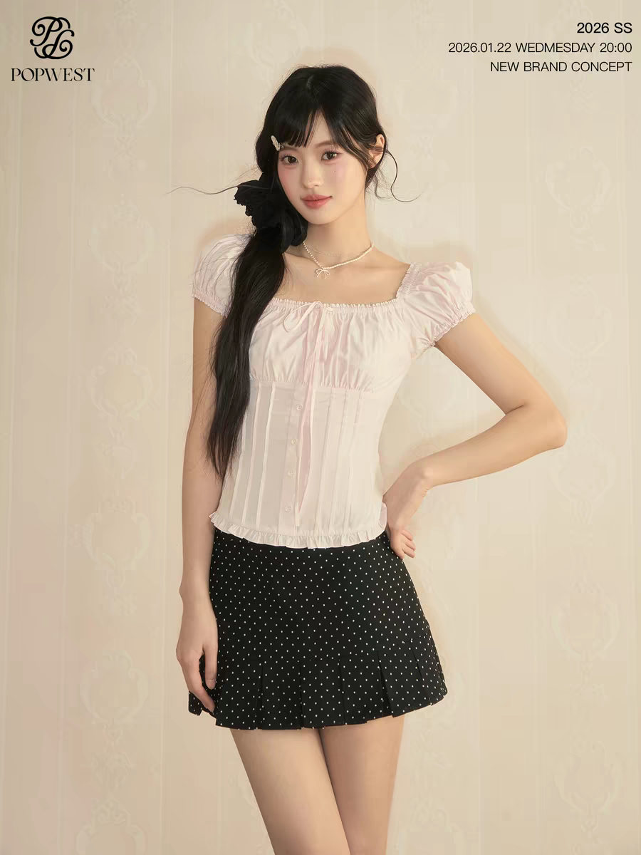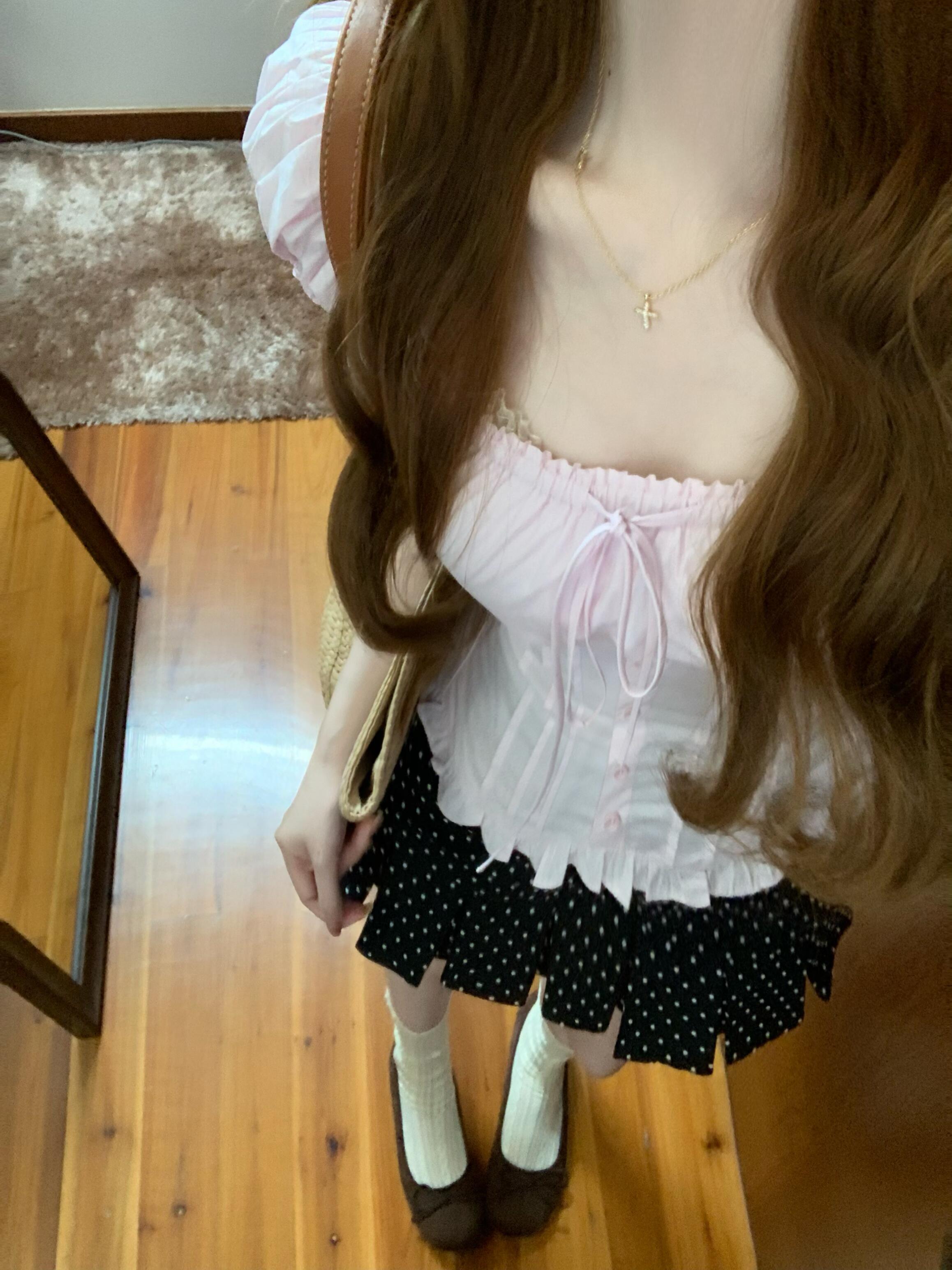 홀로우 아웃 광장 칼라 오프숄더 거품 소매 작은 셔츠 나비 매듭 새싹 셔츠 여성 셔츠 반신 스커트