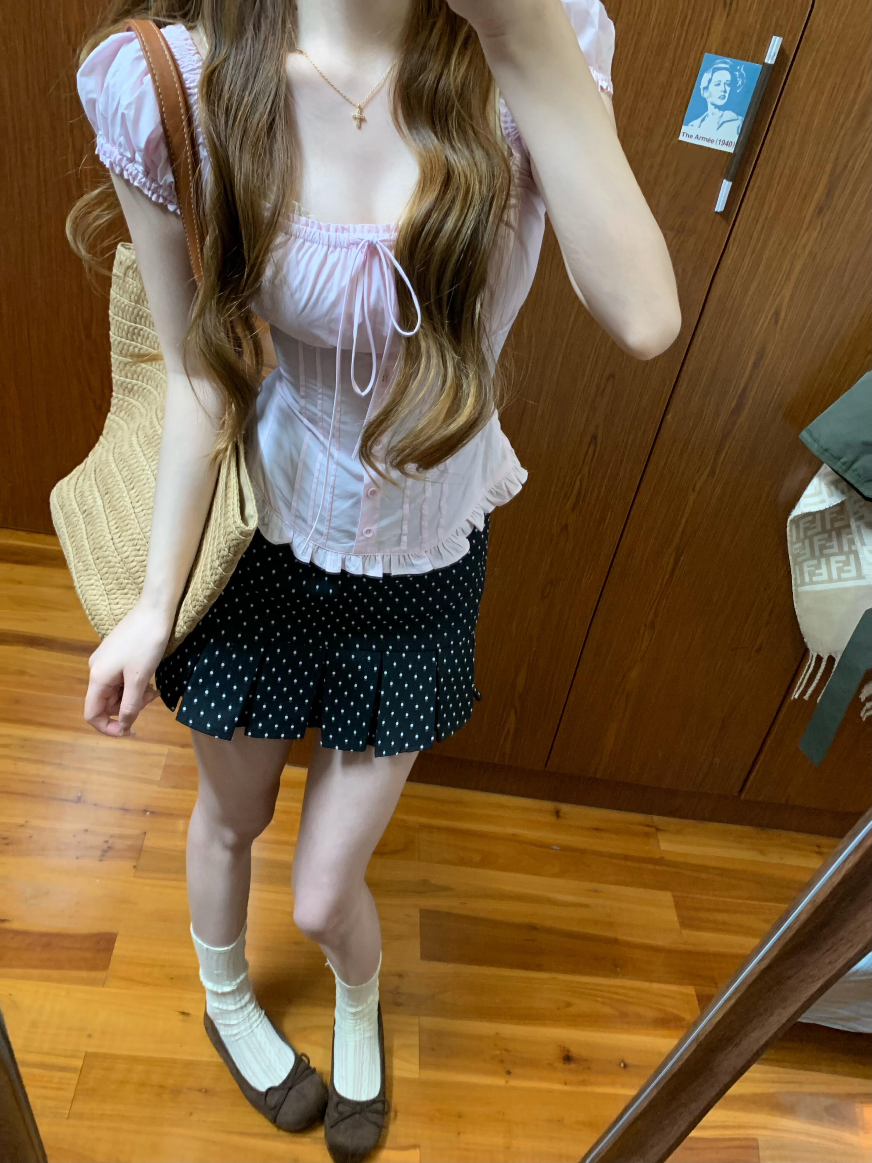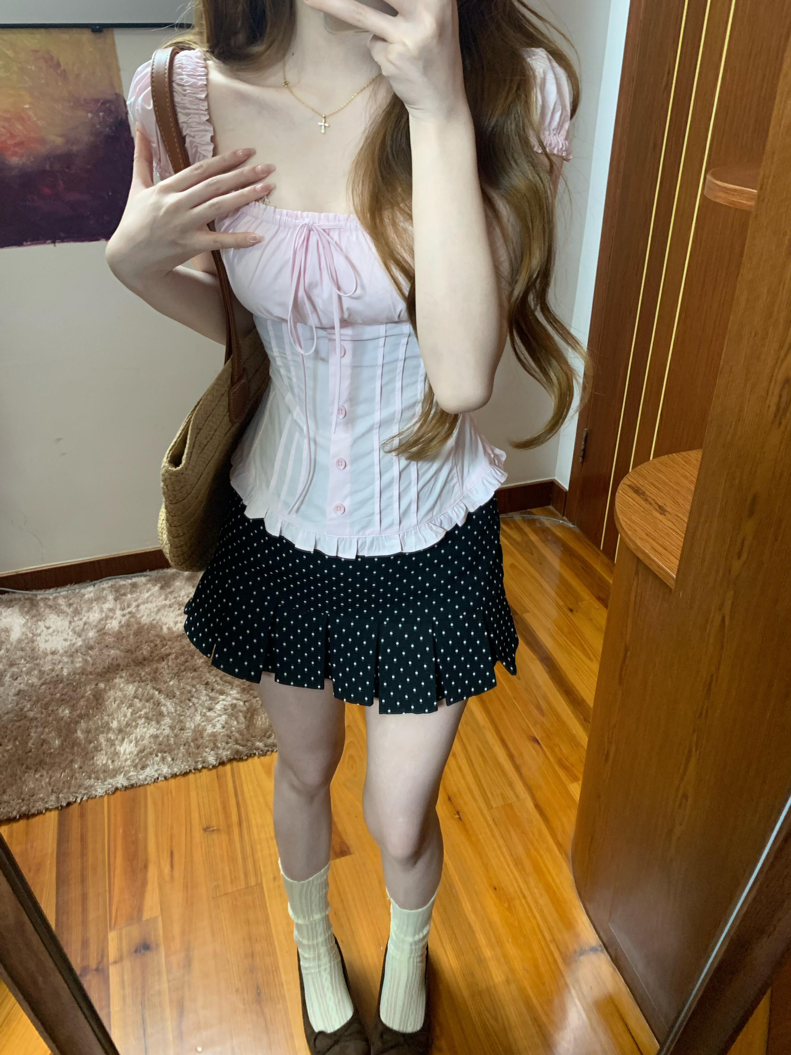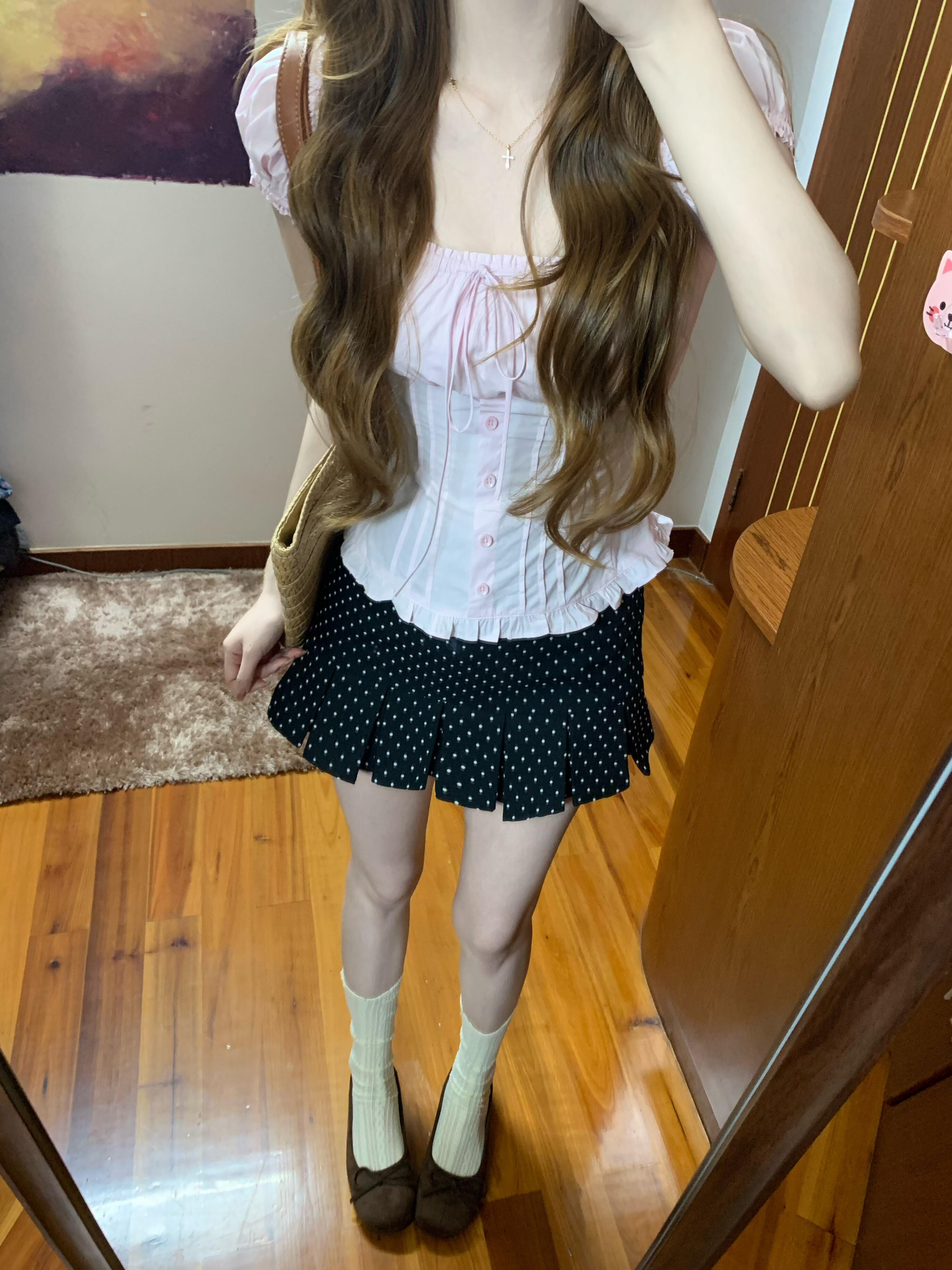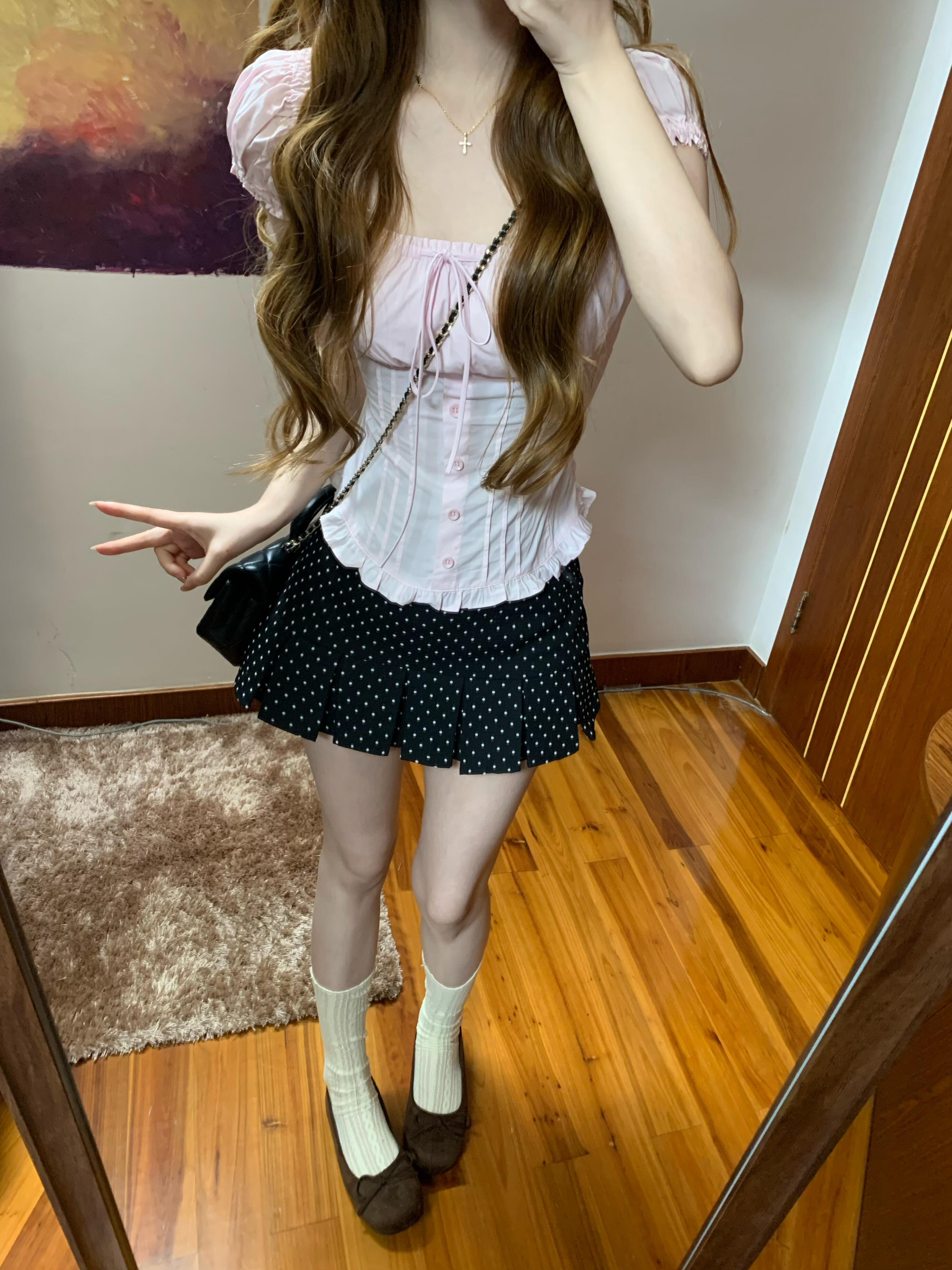달콤한 차가운 학원 스타일 높음 폭탄 니트 패치워크 도트 무늬 반팔 여름 새로운 허리 수축 슬림해 보이는 검정색 티셔츠