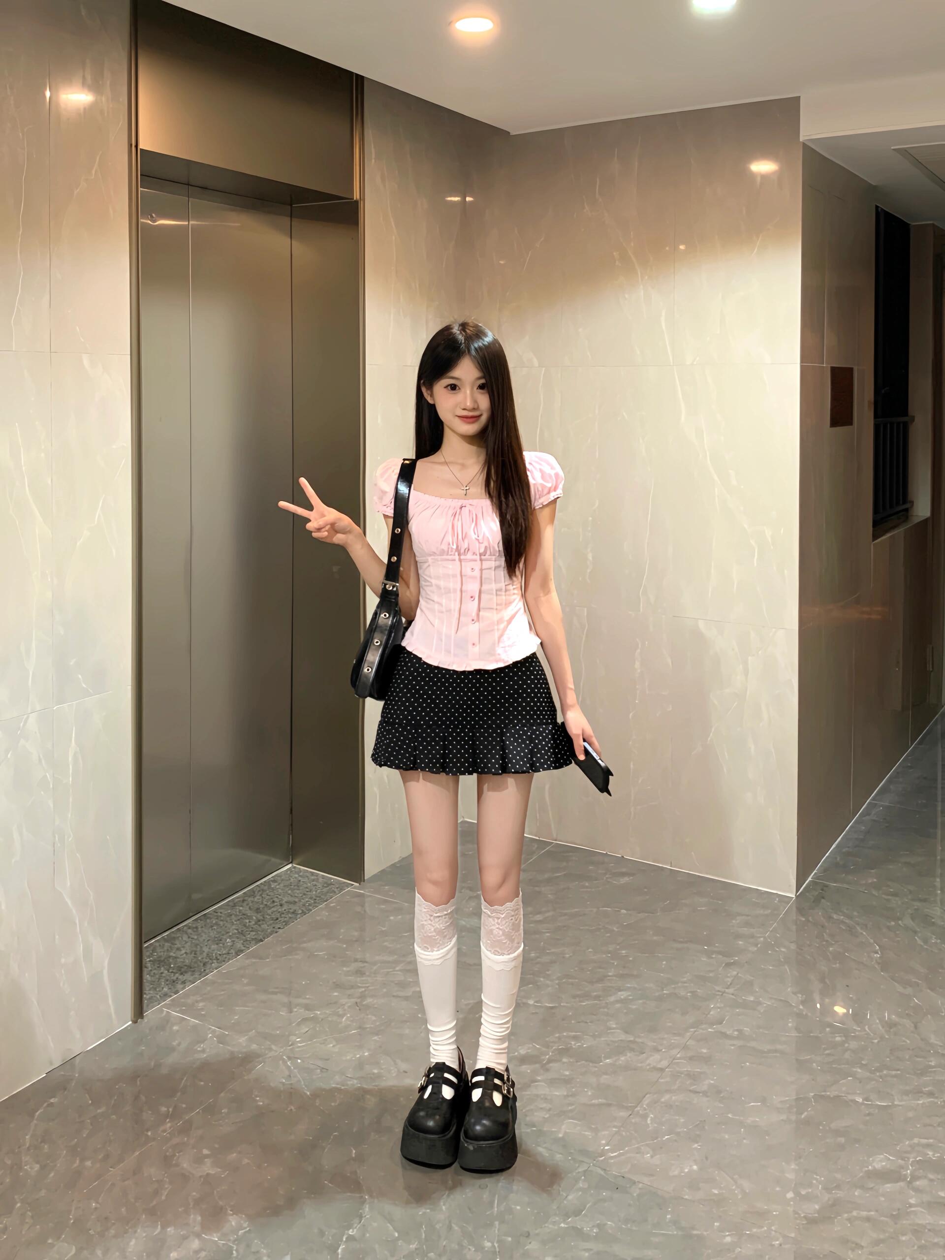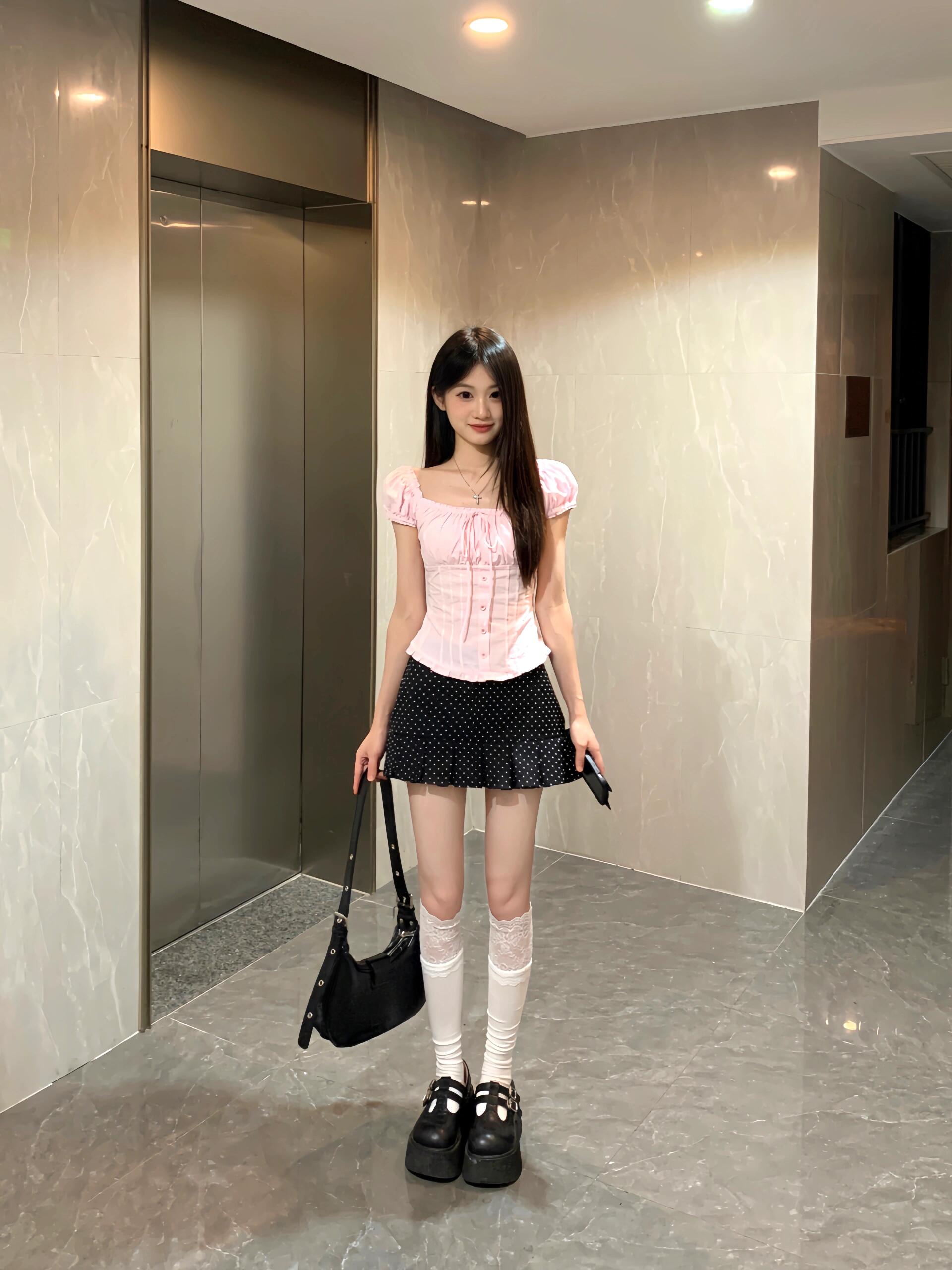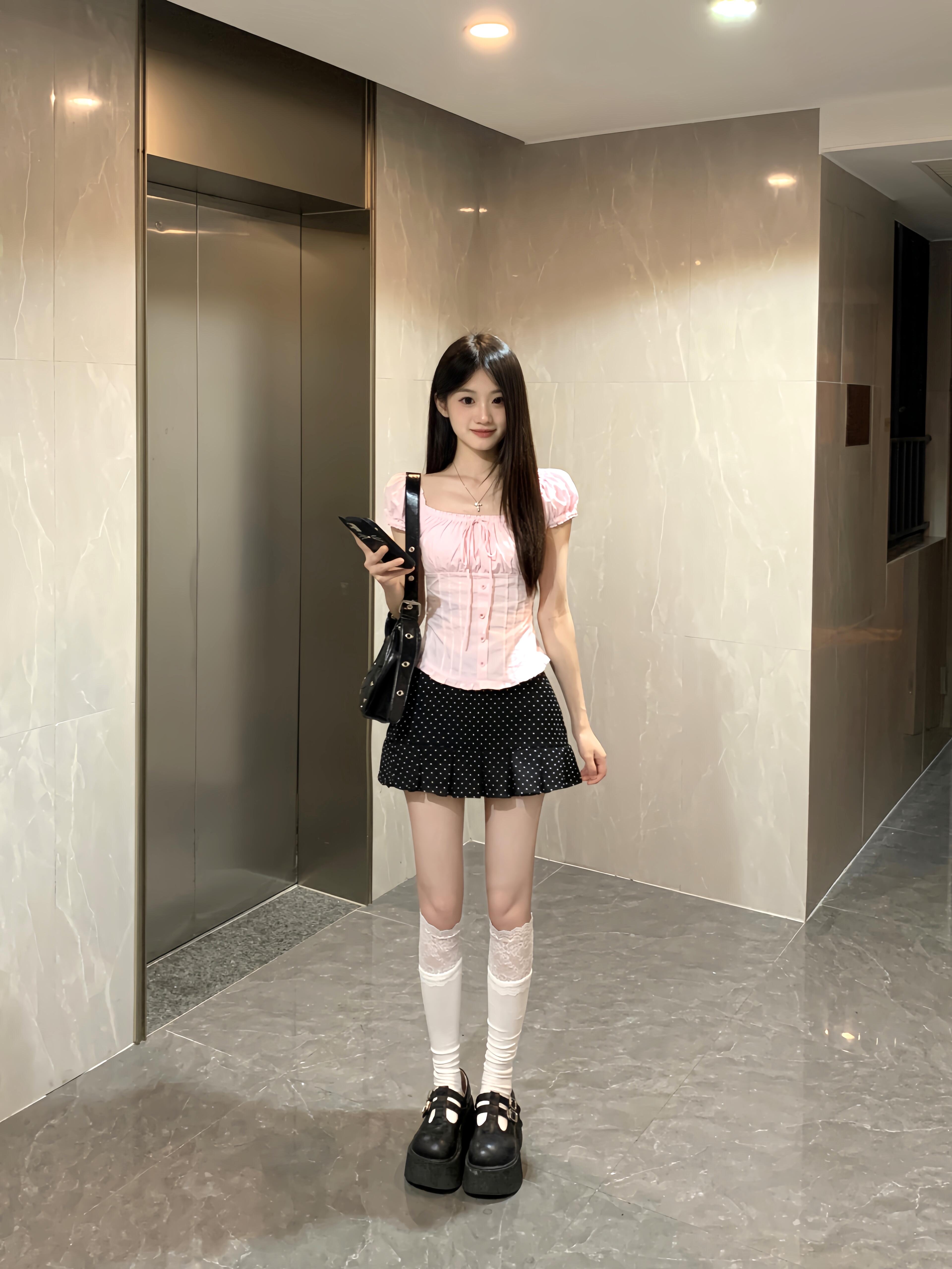 달콤한 차가운 학원 스타일 높음 폭탄 니트 패치워크 도트 무늬 반팔 여름 새로운 허리 수축 슬림해 보이는 검정색 티셔츠