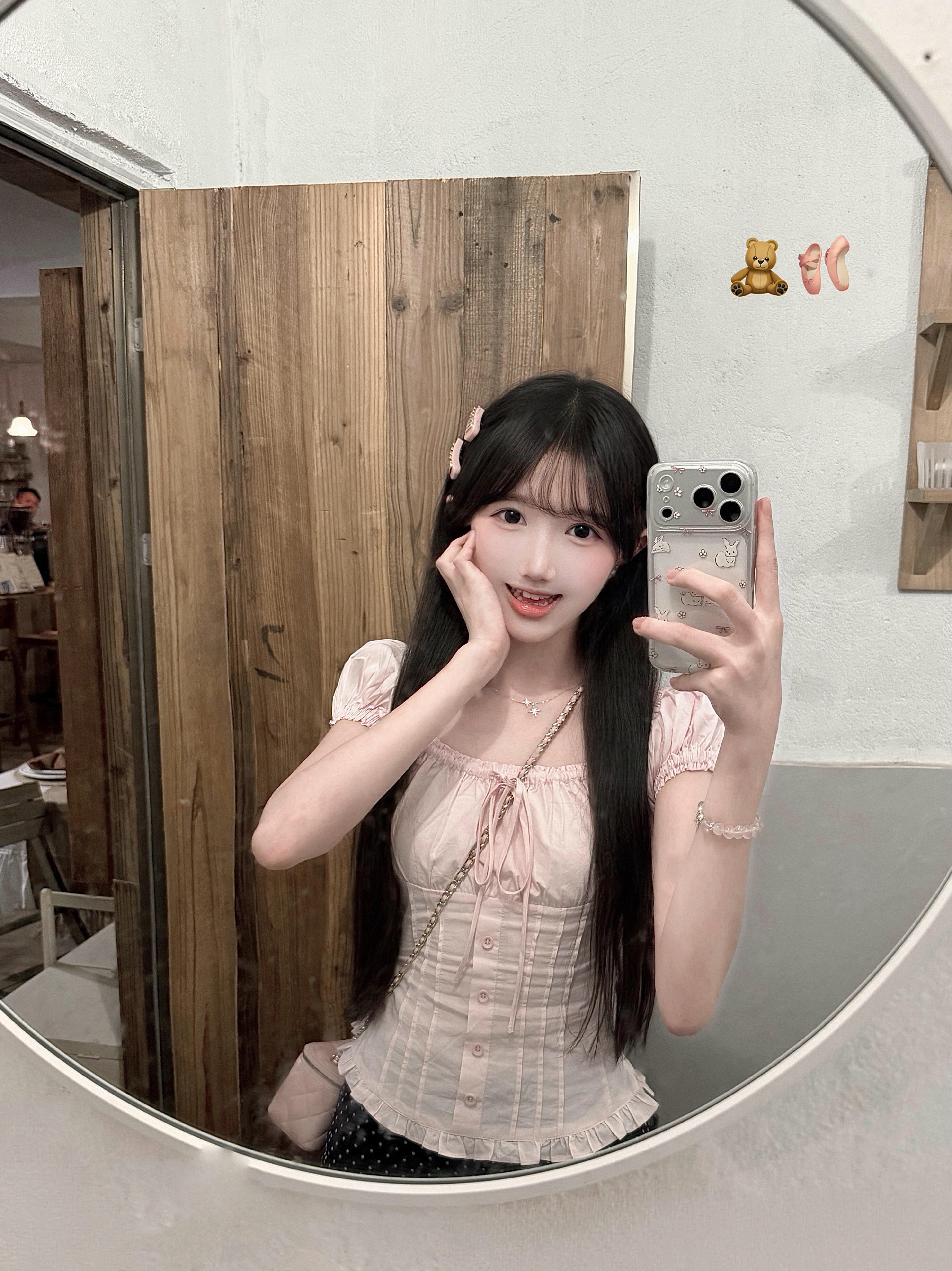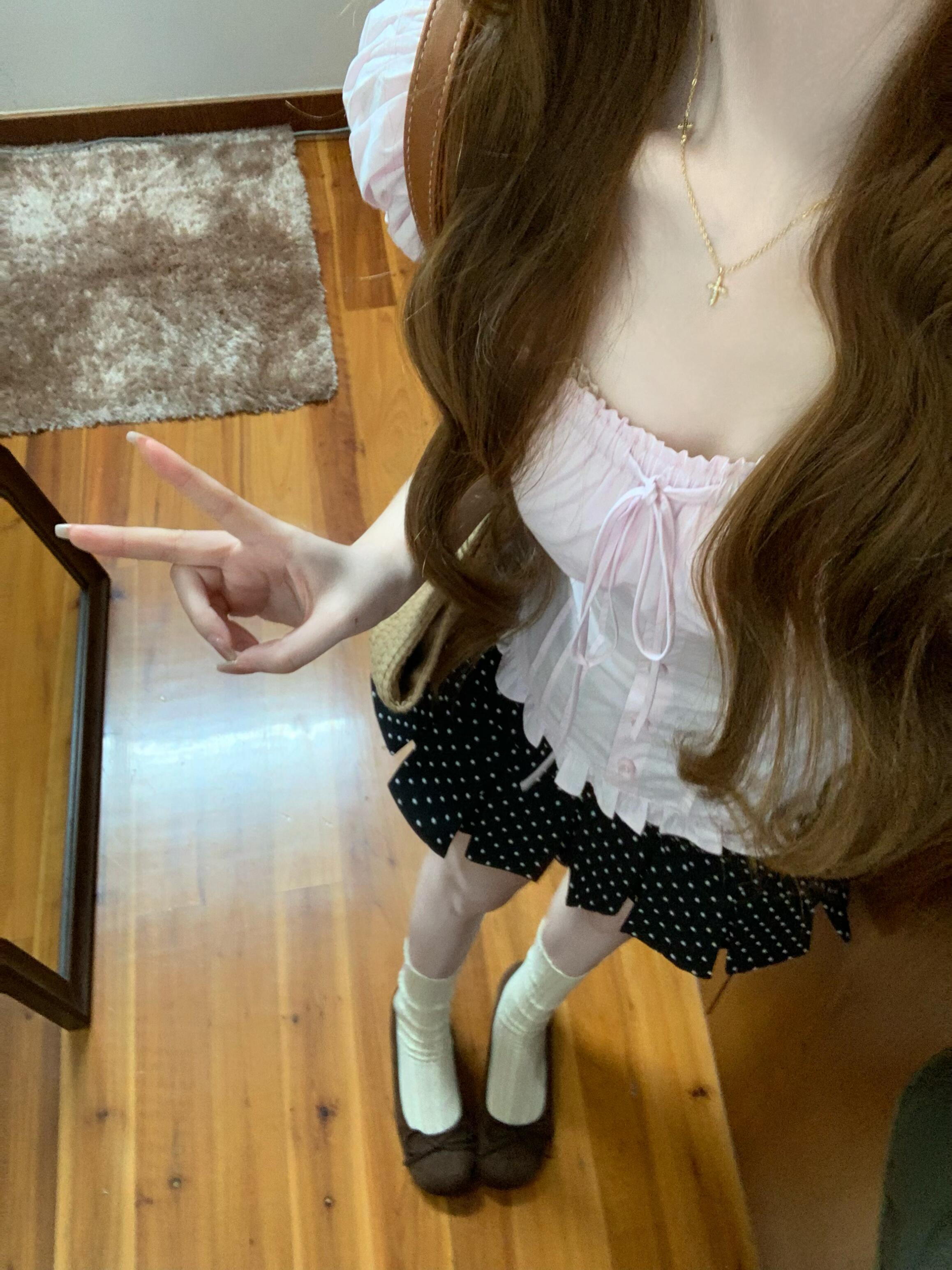 홀로우 아웃 광장 칼라 오프숄더 거품 소매 작은 셔츠 나비 매듭 새싹 셔츠 여성 셔츠 반신 스커트