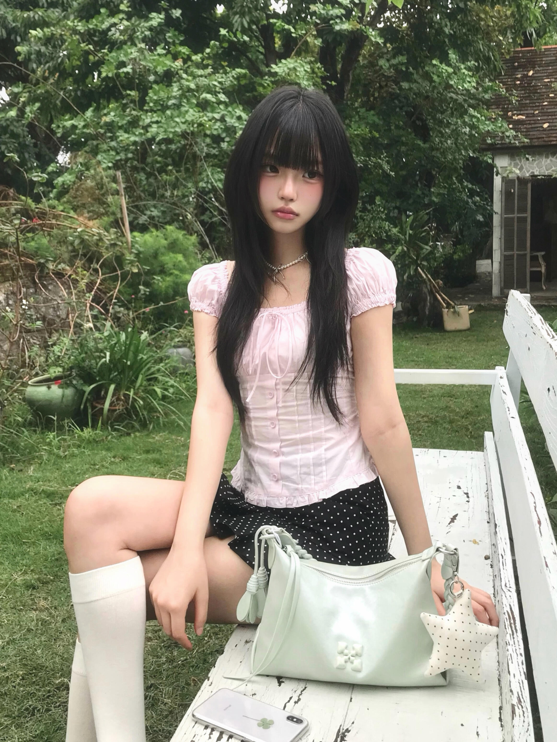 홀로우 아웃 광장 칼라 오프숄더 거품 소매 작은 셔츠 나비 매듭 새싹 셔츠 여성 셔츠 반신 스커트