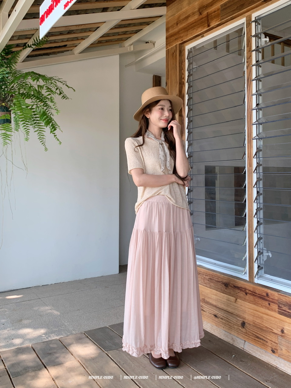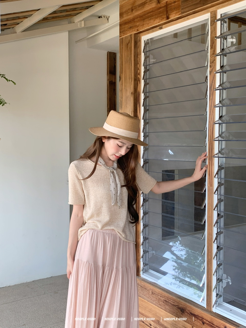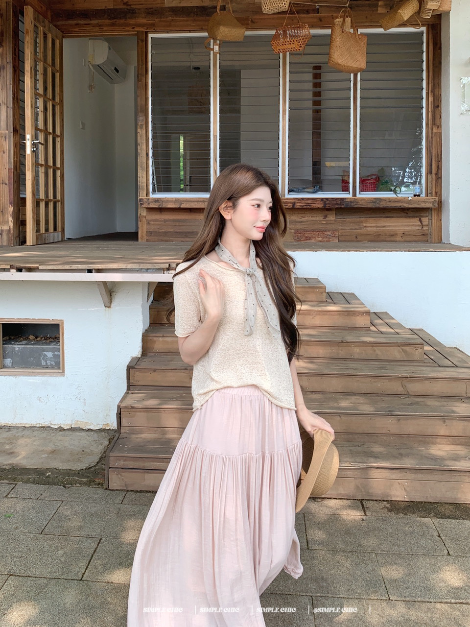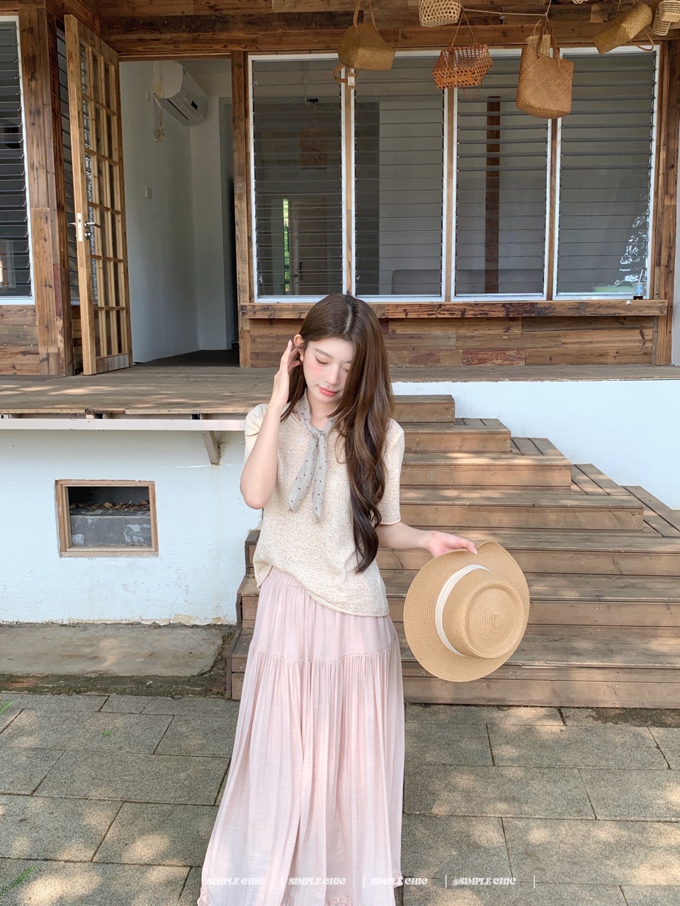 실사 녹색 니트 라운드 넥 루즈핏 맨위 루즈핏 레이스 미니멀리즘 느긋한 반신 스커트 롱 스커트