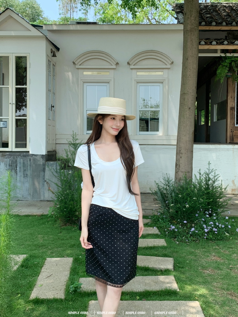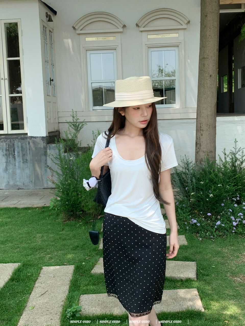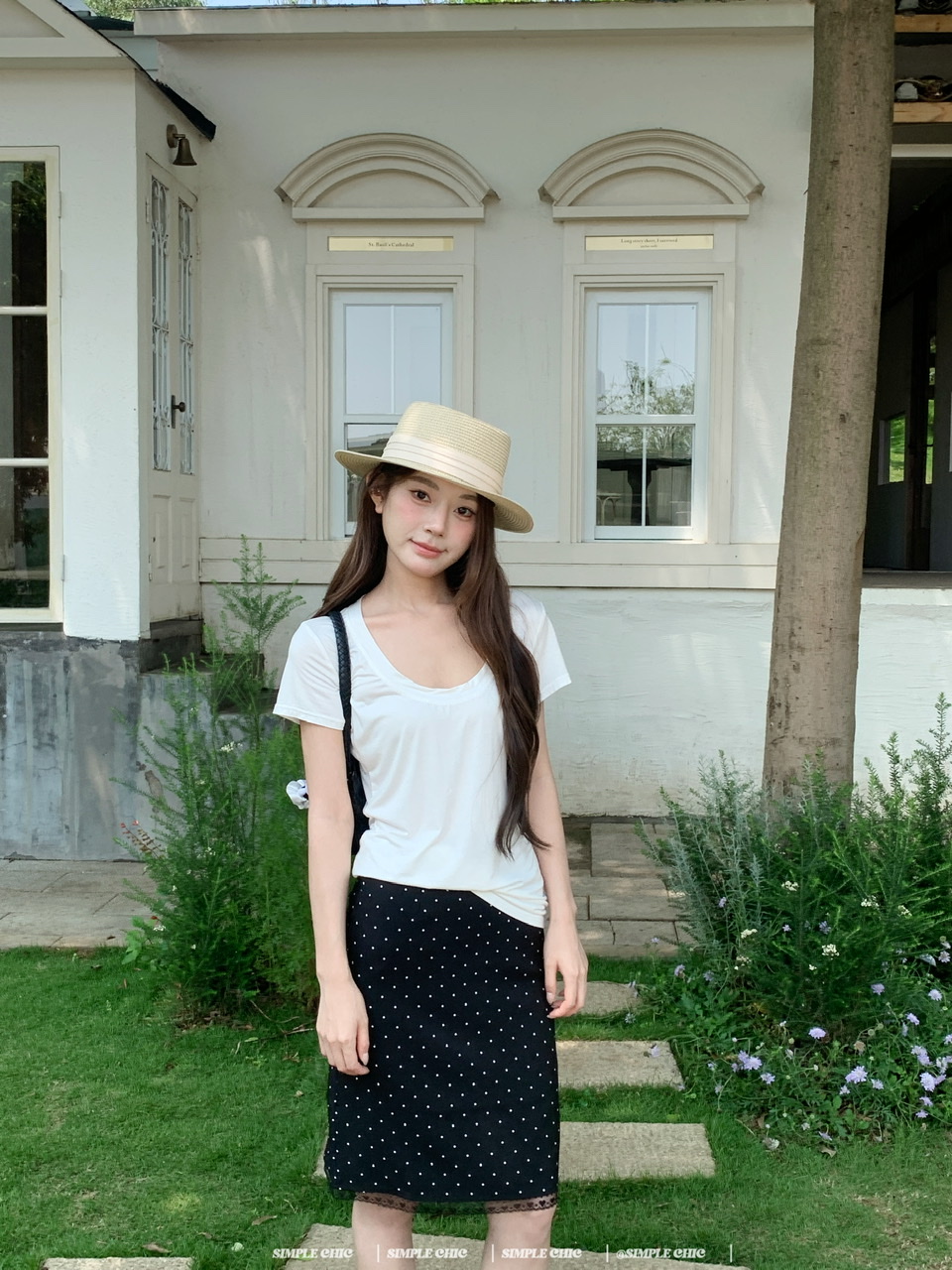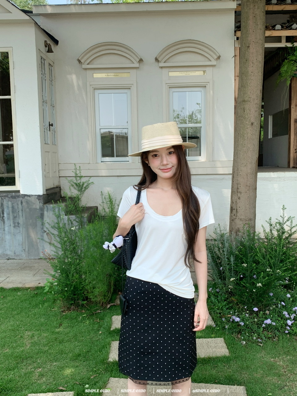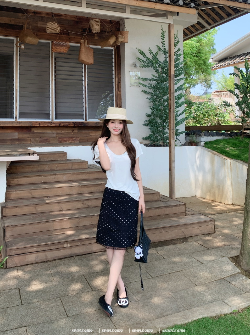 실사 레트로 검정색 작은 키 도트 무늬 반신 스커트 몸매 가꾸기 중간 스커트