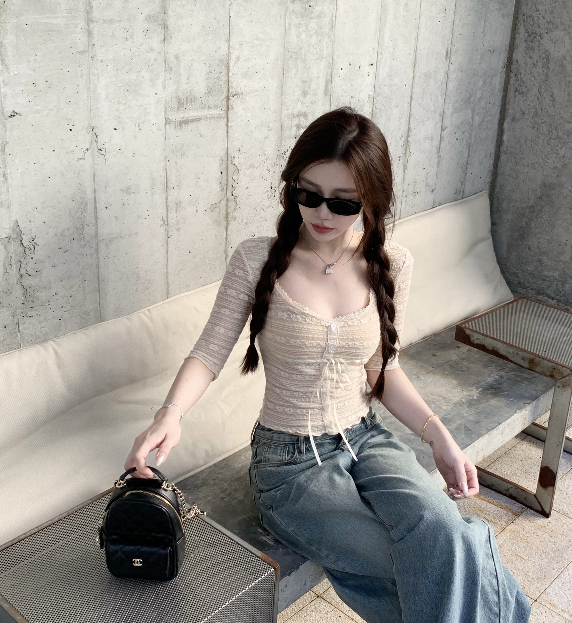 실사 정가 2026 여름 순수한 욕망 다용도 u 칼라 패키지 버클 타이트 반팔 티셔츠 여성 핫걸 몸매 가꾸기 쇼트 스타일 맨위