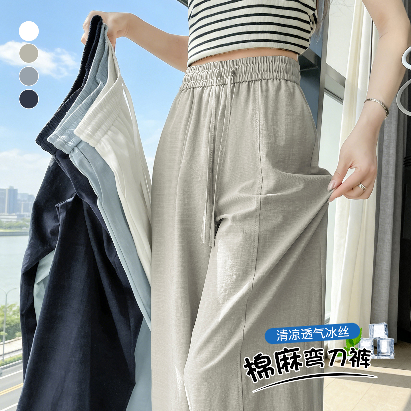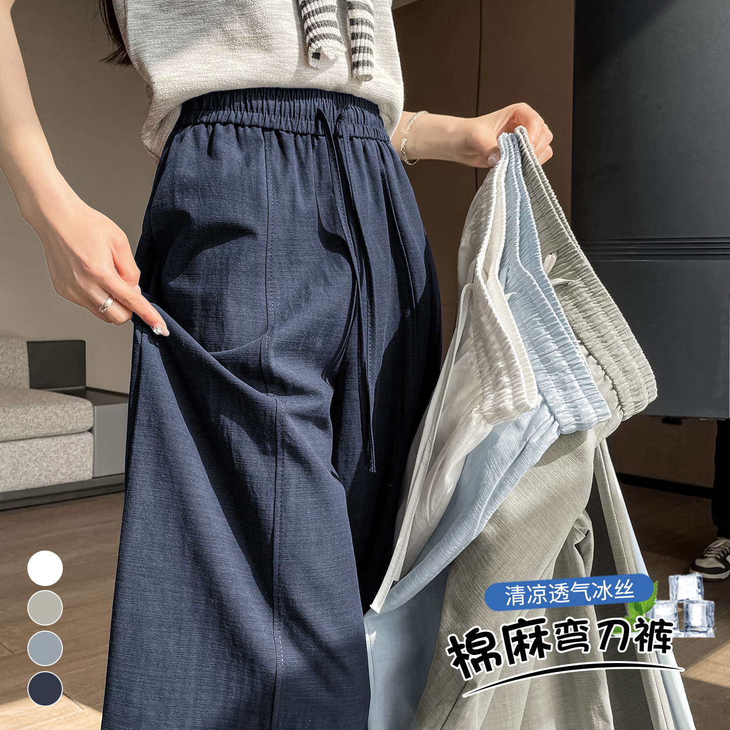 실사 얼음 실크 면 린넨 홀로우 아웃 와이드 레깅스 바지 2026 여름 하이웨이스트 슬림해 보이는 정장 캐주얼 9 포인트 스트레이트 팬츠